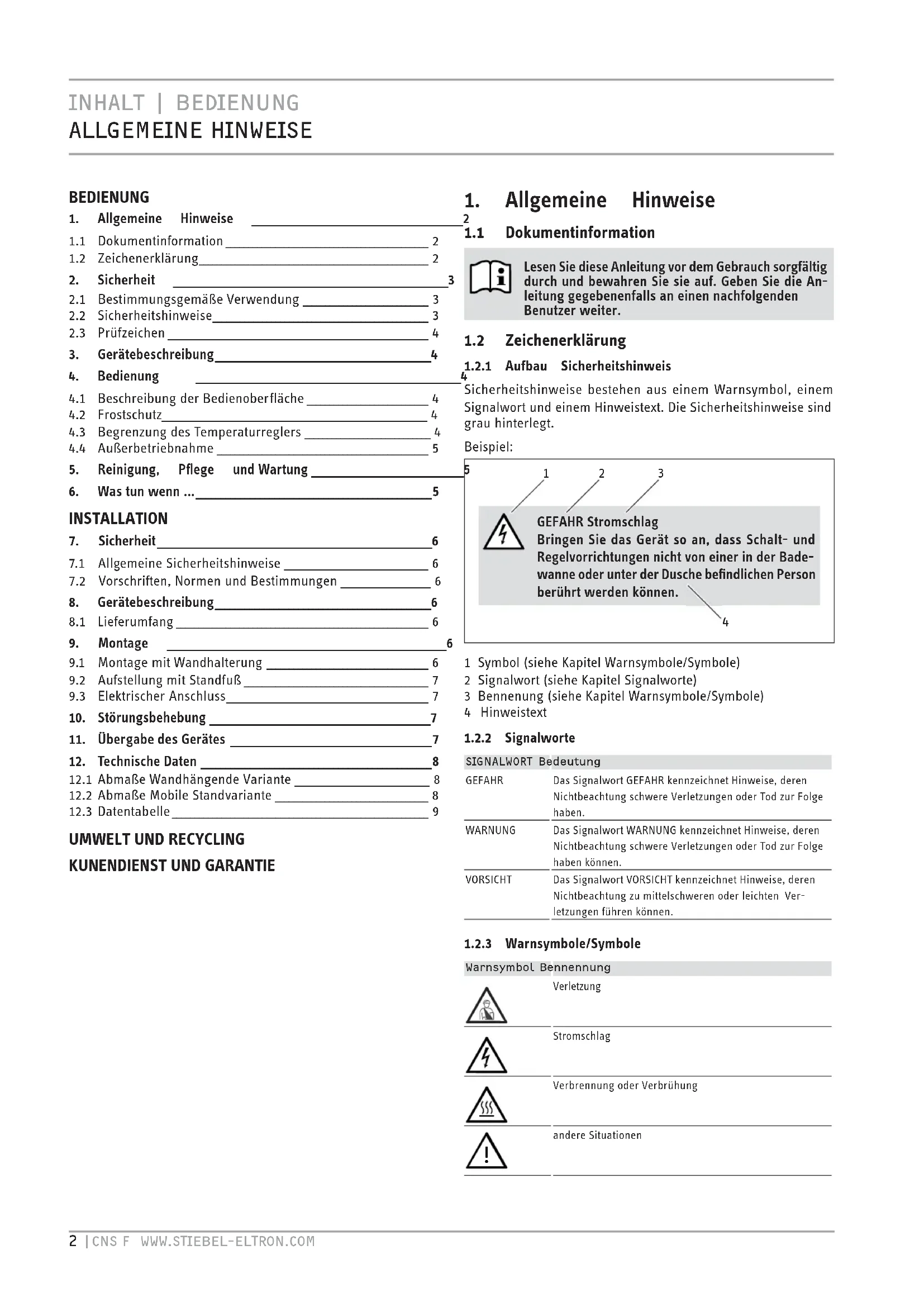 1.2.1 Aufbau SicherheitshinweisSicherheitshinweise bestehen aus einem Warnsymbol, einem Signalwort und einem Hinweistext. Die Sicherheitshinweise sind grau hinterlegt.Beispiel: GEFAHR StromschlagBringen Sie das Gerät so an, dass Schalt- und Regelvorrichtungen nicht von einer in der Bade-wanne oder unter der Dusche befindlichen Person berührt werden können.