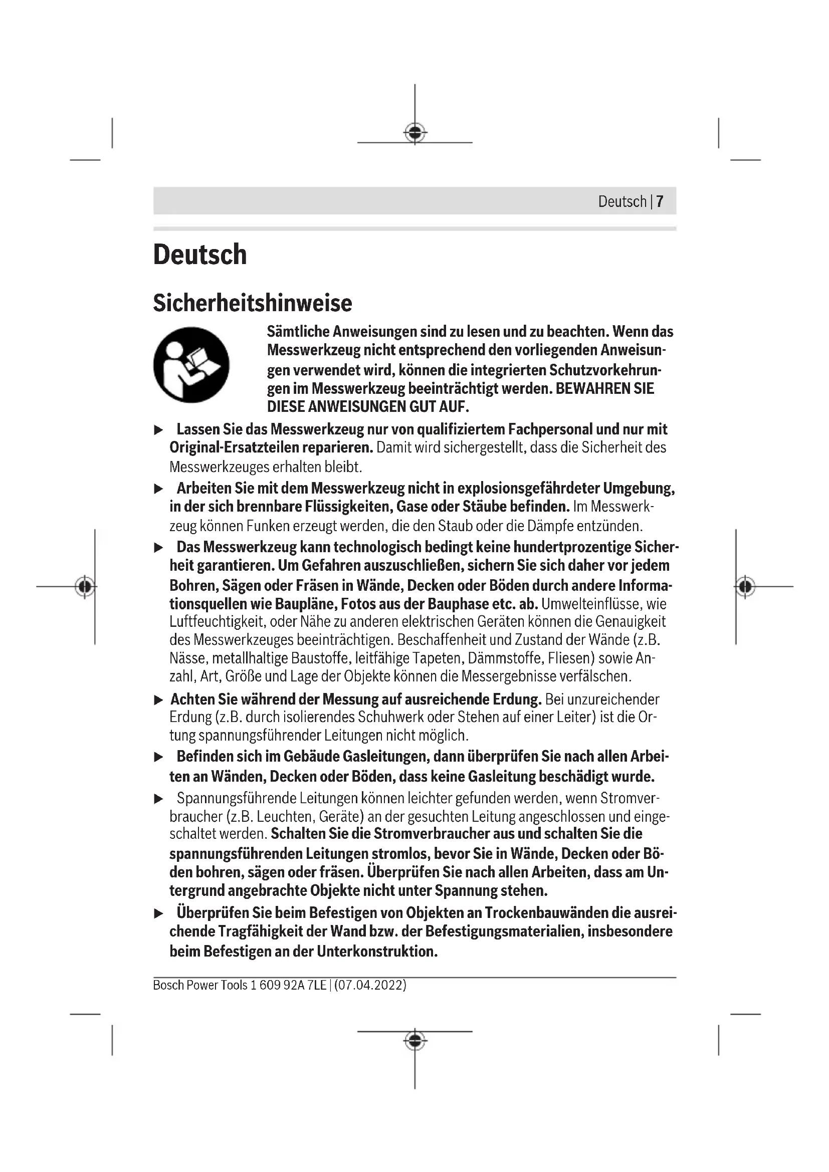 Batterie 1×9V 6LR61 Betriebsdauer ca. 5h Gewicht entsprechend EPTA-Procedure01:2014 0,27kg Schutzart IP 54 (staub- und spritzwas- sergeschützt) A) abhängig von Betriebsart, Material und Größe der Objekte sowie Material und Zustand des Un- tergrundes B) geringere Erfassungstiefe bei nicht spannungsführenden Leitungen C) Es tritt nur eine nicht leitfähige Verschmutzung auf, wobei jedoch gelegentlich eine vorüberge- hende durch Betauung verursachte Leitfähigkeit erwartet wird. Zur eindeutigen Identifizierung Ihres Messwerkzeugs dient die Seriennummer(14) auf dem Typen- schild. u Das Messergebnis kann hinsichtlich der Genauigkeit und Erfassungstiefe bei un- günstiger Beschaffenheit des Untergrundes schlechter ausfallen. Montage Batterie einsetzen/wechseln Für den Betrieb des Messwerkzeugs wird die Verwendung von Alkali-Mangan-Batterien empfohlen. Zum Öffnen des Batteriefachdeckels(15) drücken Sie die Arretierung(16) in Pfeilrich- tung und klappen den Batteriefachdeckel auf. Setzen Sie die Batterie ein. Achten Sie dabei auf die richtige Polung entsprechend der Darstellung auf der Innenseite des Batteriefachs. u Nehmen Sie die Batterie aus dem Messwerkzeug, wenn Sie es längere Zeit nicht benutzen. Die Batterie kann bei längerer Lagerung im Messwerkzeug korrodieren und sich selbst entladen. Batterie-Anzeige Die Batterie-Anzeige(h) im Display zeigt immer den aktuellen Batteriestatus an: Anzeige Kapazität 60−100% 1 609 92A 7LE | (07.04.2022) Bosch Power ToolsDeutsch | 11 Anzeige Kapazität 30−60% 5−30% 0−5% Betrieb u Schützen Sie das Messwerkzeug vor Nässe und direkter Sonneneinstrahlung. u Setzen Sie das Messwerkzeug keinen extremen Temperaturen oder Temperatur- schwankungen aus. Lassen Sie es bei größeren Temperaturschwankungen erst austemperieren, bevor Sie es einschalten. Bei extremen Temperaturen oder Tem- peraturschwankungen kann die Präzision des Messwerkzeugs und die Anzeige im Dis- play beeinträchtigt werden. u Vermeiden Sie heftige Stöße oder Stürze des Messwerkzeuges. Nach starken äu- ßeren Einwirkungen und bei Auffälligkeiten in der Funktionalität sollten Sie das Mess- werkzeug bei einer autorisierten Bosch-Kundendienststelle überprüfen lassen. u Die Messergebnisse können prinzipbedingt durch bestimmte Umgebungsbedin- gungen beeinträchtigt werden. Dazu gehören z.B. die Nähe von Geräten, die starke elektrische, magnetische oder elektromagnetische Felder erzeugen, Näs- se, metallhaltige Baumaterialien, alukaschierte Dämmstoffe sowie leitfähige Ta- peten oder Fliesen. Beachten Sie deshalb vor dem Bohren, Sägen oder Fräsen in Wände, Decken oder Böden auch andere Informationsquellen (z.B. Baupläne). u Halten Sie das Messwerkzeug nur an den vorgesehenen Griffflächen (8), um die Messung nicht zu beeinflussen. u Bringen Sie im Sensorbereich(13) auf der Rückseite des Messwerkzeugs keine Aufkleber oder Schilder an. Insbesondere Schilder aus Metall beeinflussen die Messergebnisse. Tragen Sie während der Messung keine Handschuhe und achten Sie auf ausreichende Erdung. Bei unzureichender Erdung kann die Erkennung spannungsführender Leitungen beeinträchtigt werden. Vermeiden Sie während der Messung die Nähe von Geräten, die starke elektrische, magnetische oder elektromagnetische Felder aussenden. Deaktivieren Sie nach Möglichkeit bei allen Geräten, de- ren Strahlung die Messung beeinträchtigen kann, die entsprechenden Funktionen, oder schalten Sie die Geräte aus. Bosch Power Tools 1 609 92A 7LE | (07.04.2022)12 | Deutsch Inbetriebnahme Ein-/Ausschalten u Stellen Sie vor dem Einschalten des Messwerkzeugs sicher, dass der Sensorbereich(13) nicht feucht ist. Reiben Sie das Messwerkzeug gegebenenfalls mit einem Tuch trocken. u War das Messwerkzeug einem starken Temperaturwechsel ausgesetzt, dann las- sen Sie es vor dem Einschalten austemperieren. Zum Einschalten des Messwerkzeugs drücken Sie die Ein-/Aus-Taste(5). Zum Ausschalten des Messwerkzeugs drücken Sie erneut die Ein-/Aus-Taste(5). Wird ca. 5min lang keine Taste am Messwerkzeug gedrückt und werden keine Objekte detektiert, schaltet sich das Messwerkzeug zur Schonung der Batterie automatisch ab. Displaybeleuchtung ein-/ausschalten Mit der Taste Displaybeleuchtung(6) können Sie die Displaybeleuchtung ein- und aus- schalten. Signalton ein-/ausschalten Mit der Taste Signalton(7) können Sie den Signalton ein- und ausschalten. Bei ausge- schaltetem Signalton erscheint im Display die Anzeige Signalton(a). Funktionsweise (sieheBildB) Mit dem Messwerkzeug wird der Untergrund des Sensorbereiches(13) in Messrichtung A bis zur maximalen Erfassungstiefe untersucht. Erkannt werden Objekte, die sich vom Material der Wand unterscheiden. Bewegen Sie das Messwerkzeug geradlinig in Richtung B über die Wand. Bewegen Sie das Messwerkzeug stets mit leichtem Druck über den Untergrund, ohne es anzuheben oder den Anpressdruck zu verändern. Während der Messung müssen die Gleiter(12) immer Kontakt zum Untergrund haben. Messvorgang Setzen Sie das Messwerkzeug auf die zu untersuchende Oberfläche auf und bewegen Sie es in Richtung B. – Nähert sich das Messwerkzeug einem Objekt, dann nimmt der Ausschlag in der Messanzeige(i) zu und der Leuchtring(1) leuchtet gelb. – Entfernt sich das Messwerkzeug von dem Objekt, dann nimmt der Ausschlag ab. – Über der Mitte eines Objektes zeigt die Messanzeige den maximalen Ausschlag; der Leuchtring(1) leuchtet rot und es ertönt ein Signalton. 1 609 92A 7LE | (07.04.2022) Bosch Power ToolsDeutsch | 13 Bei kleinen oder tief liegenden Objekten kann der Leuchtring(1) weiterhin gelb leuchten und der Signalton ausbleiben. u Breitere Objekte werden nicht in der gesamten Breite durch den Leuchtring bzw. den Signalton angezeigt. Um das Objekt genauer zu lokalisieren, bewegen Sie das Messwerkzeug wiederholt (3×) über dem Objekt hin und her. In allen Betriebsarten wird automatisch die Feinskala(j) aktiviert. Die Feinskala zeigt einen vollen Ausschlag, wenn das Objekt 