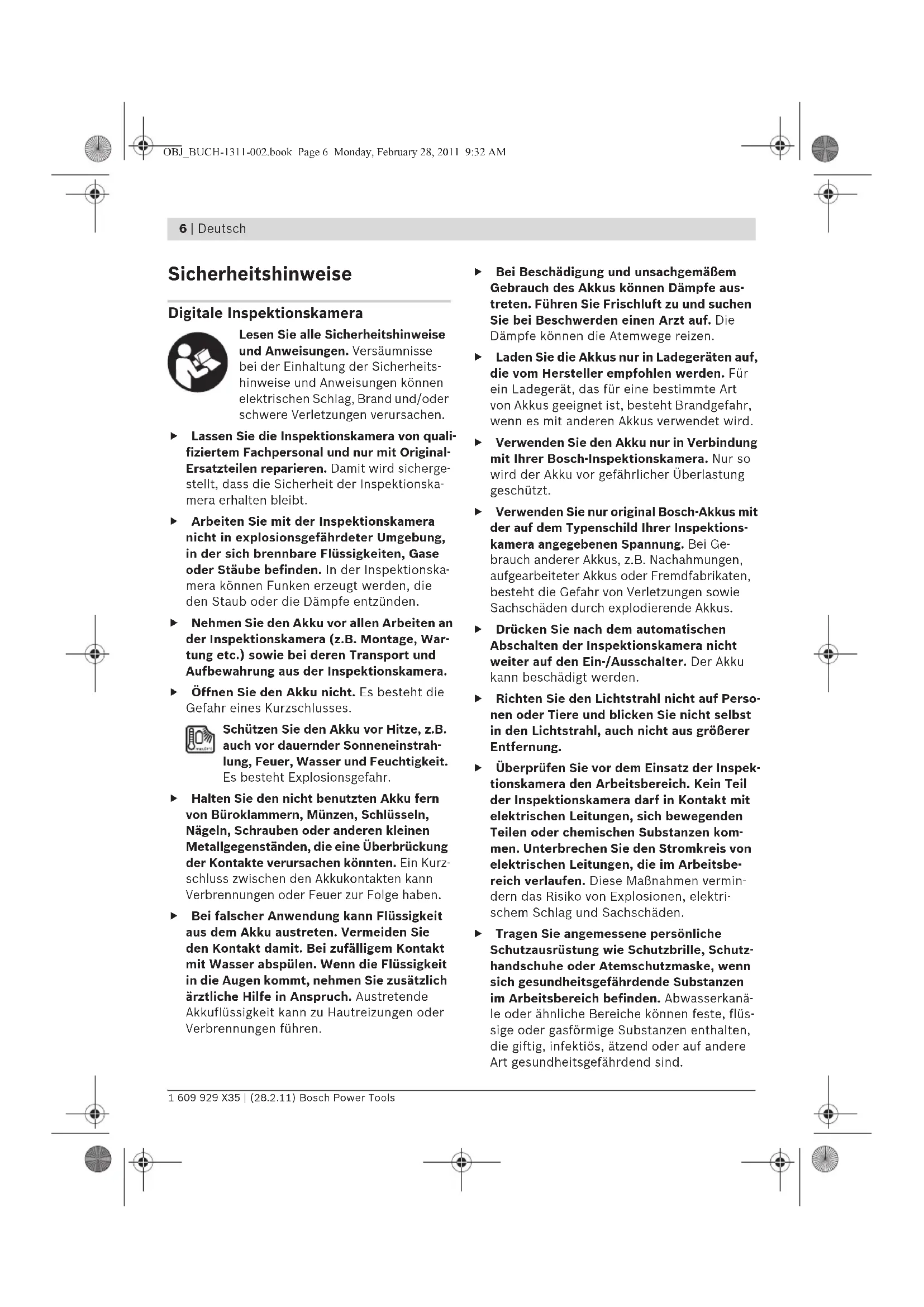 OBJ_BUCH-1311-002.book Page 5 Monday, February 28, 2011 9:32 AM6 | Deutsch 1 609 929 X35 | (28.2.11) Bosch Power Tools Sicherheitshinweise Digitale Inspektionskamera Lesen Sie alle Sicherheitshinweise und Anweisungen. Versäumnisse bei der Einhaltung der Sicherheits- hinweise und Anweisungen können elektrischen Schlag, Brand und/oder schwere Verletzungen verursachen. f Lassen Sie die Inspektionskamera von quali- fiziertem Fachpersonal und nur mit Original- Ersatzteilen reparieren. Damit wird sicherge- stellt, dass die Sicherheit der Inspektionska- mera erhalten bleibt. f Arbeiten Sie mit der Inspektionskamera nicht in explosionsgefährdeter Umgebung, in der sich brennbare Flüssigkeiten, Gase oder Stäube befinden. In der Inspektionska- mera können Funken erzeugt werden, die den Staub oder die Dämpfe entzünden. f Nehmen Sie den Akku vor allen Arbeiten an der Inspektionskamera (z.B. Montage, War- tung etc.) sowie bei deren Transport und Aufbewahrung aus der Inspektionskamera. f Öffnen Sie den Akku nicht. Es besteht die Gefahr eines Kurzschlusses. Schützen Sie den Akku vor Hitze, z.B. auch vor dauernder Sonneneinstrah- lung, Feuer, Wasser und Feuchtigkeit. Es besteht Explosionsgefahr. f Halten Sie den nicht benutzten Akku fern von Büroklammern, Münzen, Schlüsseln, Nägeln, Schrauben oder anderen kleinen Metallgegenständen, die eine Überbrückung der Kontakte verursachen könnten. Ein Kurz- schluss zwischen den Akkukontakten kann Verbrennungen oder Feuer zur Folge haben. f Bei falscher Anwendung kann Flüssigkeit aus dem Akku austreten. Vermeiden Sie den Kontakt damit. Bei zufälligem Kontakt mit Wasser abspülen. Wenn die Flüssigkeit in die Augen kommt, nehmen Sie zusätzlich ärztliche Hilfe in Anspruch. Austretende Akkuflüssigkeit kann zu Hautreizungen oder Verbrennungen führen. f Bei Beschädigung und unsachgemäßem Gebrauch des Akkus können Dämpfe aus- treten. Führen Sie Frischluft zu und suchen Sie bei Beschwerden einen Arzt auf. Die Dämpfe können die Atemwege reizen. f Laden Sie die Akkus nur in Ladegeräten auf, die vom Hersteller empfohlen werden. Für ein Ladegerät, das für eine bestimmte Art von Akkus geeignet ist, besteht Brandgefahr, wenn es mit anderen Akkus verwendet wird. f Verwenden Sie den Akku nur in Verbindung mit Ihrer Bosch-Inspektionskamera. Nur so wird der Akku vor gefährlicher Überlastung geschützt. f Verwenden Sie nur original Bosch-Akkus mit der auf dem Typenschild Ihrer Inspektions- kamera angegebenen Spannung. Bei Ge- brauch anderer Akkus, z.B. Nachahmungen, aufgearbeiteter Akkus oder Fremdfabrikaten, besteht die Gefahr von Verletzungen sowie Sachschäden durch explodierende Akkus. f Drücken Sie nach dem automatischen Abschalten der Inspektionskamera nicht weiter auf den Ein-/Ausschalter. Der Akku kann beschädigt werden. f Richten Sie den Lichtstrahl nicht auf Perso- nen oder Tiere und blicken Sie nicht selbst in den Lichtstrahl, auch nicht aus größerer Entfernung. f Überprüfen Sie vor dem Einsatz der Inspek- tionskamera den Arbeitsbereich. Kein Teil der Inspektionskamera darf in Kontakt mit elektrischen Leitungen, sich bewegenden Teilen oder chemischen Substanzen kom- men. Unterbrechen Sie den Stromkreis von elektrischen Leitungen, die im Arbeitsbe- reich verlaufen. Diese Maßnahmen vermin- dern das Risiko von Explosionen, elektri- schem Schlag und Sachschäden. f Tragen Sie angemessene persönliche Schutzausrüstung wie Schutzbrille, Schutz- handschuhe oder Atemschutzmaske, wenn sich gesundheitsgefährdende Substanzen im Arbeitsbereich befinden. Abwasserkanä- le oder ähnliche Bereiche können feste, flüs- sige oder gasförmige Substanzen enthalten, die giftig, infektiös, ätzend oder auf andere Art gesundheitsgefährdend sind. OBJ_BUCH-1311-002.book Page 6 Monday, February 28, 2011 9:32 AMDeutsch | 7 Bosch Power Tools 1 609 929 X35 | (28.2.11) f Achten Sie besonders auf Sauberkeit, wenn Sie in Bereichen mit gesundheitsgefährden- den Substanzen arbeiten. Essen Sie wäh- rend der Arbeit nicht. Vermeiden Sie den Kontakt mit den gesundheitsgefährdenden Substanzen und reinigen Sie nach der Arbeit Hände und andere Körperteile, die in Kontakt gekommen sein könnten, mit heißer Seifen- lauge. Dadurch wird die Gesundheitsgefähr- dung verringert. f Stehen Sie nicht im Wasser, wenn Sie die Inspektionskamera benutzen. Durch Arbei- ten im Wasser besteht das Risiko eines elek- trischen Schlages. Magnet Bringen Sie den Magnet 15 nicht in die Nähe von Herzschrittma- chern. Durch den Magnet wird ein Feld erzeugt, das die Funktion von Herzschrittmachern beeinträchti- gen kann. f Halten Sie den Magnet 15 fern von magneti- schen Datenträgern und magnetisch emp- findlichen Geräten. Durch die Wirkung des Magnets kann es zu irreversiblen Datenver- lusten kommen. Produkt- und Leistungs- beschreibung Bitte klappen Sie die Aufklappseite mit der Dar- stellung der Inspektionskamera auf, und lassen Sie diese Seite aufgeklappt, während Sie die Betriebsanleitung lesen. Bestimmungsgemäßer Gebrauch Die digitale Inspektionskamera ist geeignet zur Inspektion schwer zugänglicher oder dunkler Bereiche. Sie ist nach Montage der mitgeliefer- ten Hilfsmittel am Kamerakopf auch zum Bewe- gen und Entfernen kleiner und leichter Gegen- stände (z.B. kleiner Schrauben) geeignet. Die digitale Inspektionskamera darf nicht für medizinische Zwecke verwendet werden. Sie ist ebenso nicht zum Beheben von Rohrverstopfun- gen oder dem Einziehen von Kabeln bestimmt. Abgebildete Komponenten Die Nummerierung der abgebildeten Kompo- nenten bezieht sich auf die Darstellung der In- spektionskamera auf der Grafikseite. 1 Handgerät 2 Taste Beleuchtung verstärken „+“ 3 Ein-Aus-Taste 4 Taste Beleuchtung verringern „–“ 5 Display 6 Kamerakabel 7 Kamerakopf 8 Kameralinse 9 Leuchte im Kamerakopf 10 Akku* 11 Akku-Entriegelungstaste 12 Verlängerung Kamerakabel* 13 Hülse am Kameraanschluss 14 Kameraanschluss 15 Magnet 16 Haken 17 Spiegel 18 Buchse Videoausgang 19 Vid