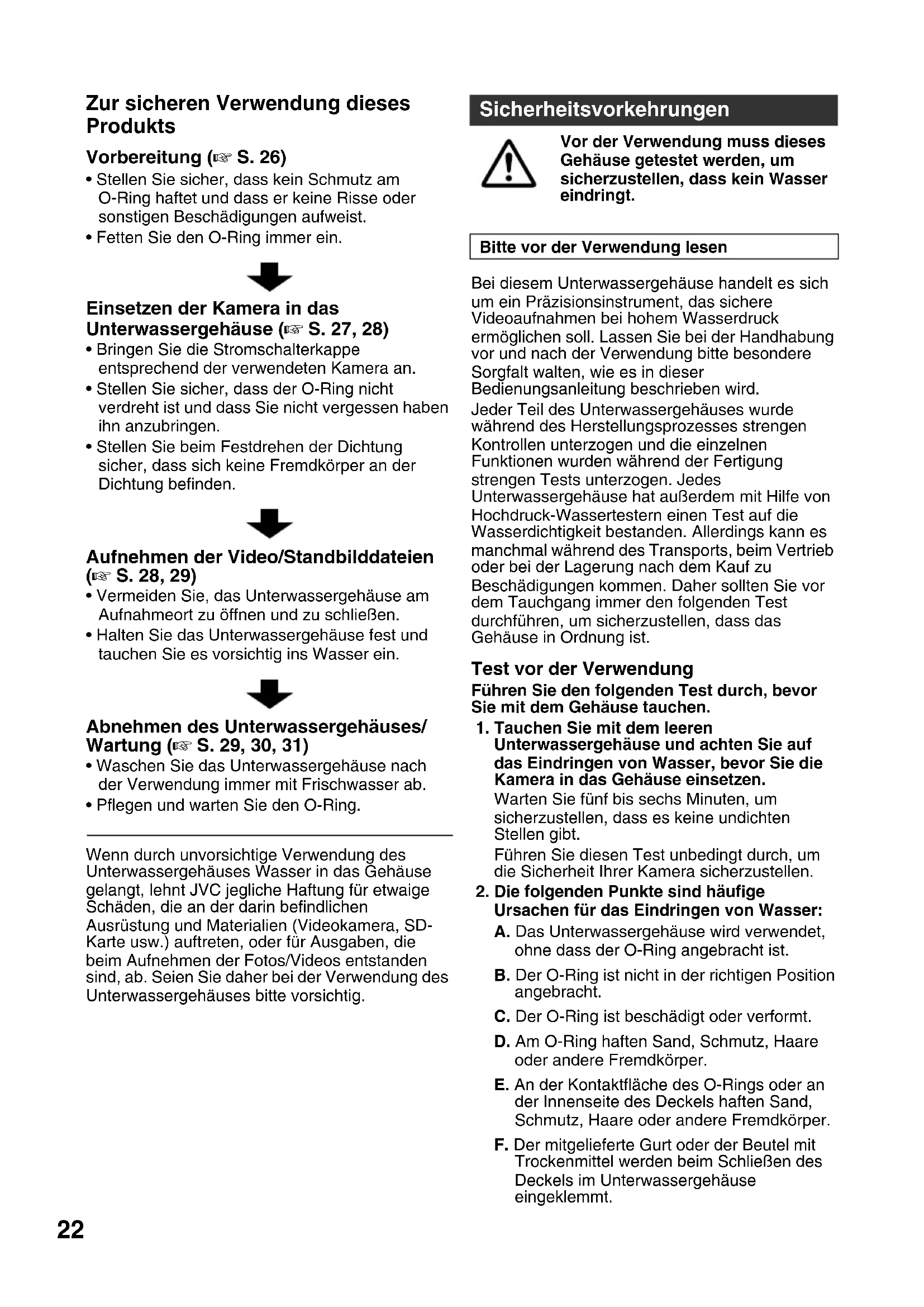 - Pflegen und warten Sie den O-Ring. Wenn durch unvorsichtige Verwendung des Unterwassergehäuses Wasser in das Gehäuse gelangt, lehnt JVC jegliche Haftung für etwaige Schäden, die an der darin befindlichen Ausrüstung und Materialien (Videokamera, SD- Karte usw.) auftreten, oder für Ausgaben, die beim Aufnehmen der Fotos/Videos entstanden sind, ab. Seien Sie daher bei der Verwendung des Unterwassergehäuses bitte vorsichtig. Vor der Verwendung muss dieses Gehäuse getestet werden, um sicherzustellen, dass kein Wasser eindringt. Bei diesem Unterwassergehäuse handelt es sich um ein Präzisionsinstrument, das sichere Videoaufnahmen bei hohem Wasserdruck ermöglichen soll. Lassen Sie bei der Handhabung vor und nach der Verwendung bitte besondere Sorgfalt walten, wie es in dieser Bedienungsanleitung beschrieben wird. Jeder Teil des Unterwassergehäuses wurde während des Herstellungsprozesses strengen Kontrollen unterzogen und die einzelnen Funktionen wurden während der Fertigung strengen Tests unterzogen. Jedes Unterwassergehäuse hat außerdem mit Hilfe von Hochdruck-Wassertestern einen Test auf die Wasserdichtigkeit bestanden. Allerdings kann es manchmal während des Transports, beim Vertrieb oder bei der Lagerung nach dem Kauf zu Beschädigungen kommen. Daher sollten Sie vor dem Tauchgang immer den folgenden Test durchführen, um sicherzustellen, dass das Gehäuse in Ordnung ist. Test vor der Verwendung Führen Sie den folgenden Test durch, bevor Sie mit dem Gehäuse tauchen.