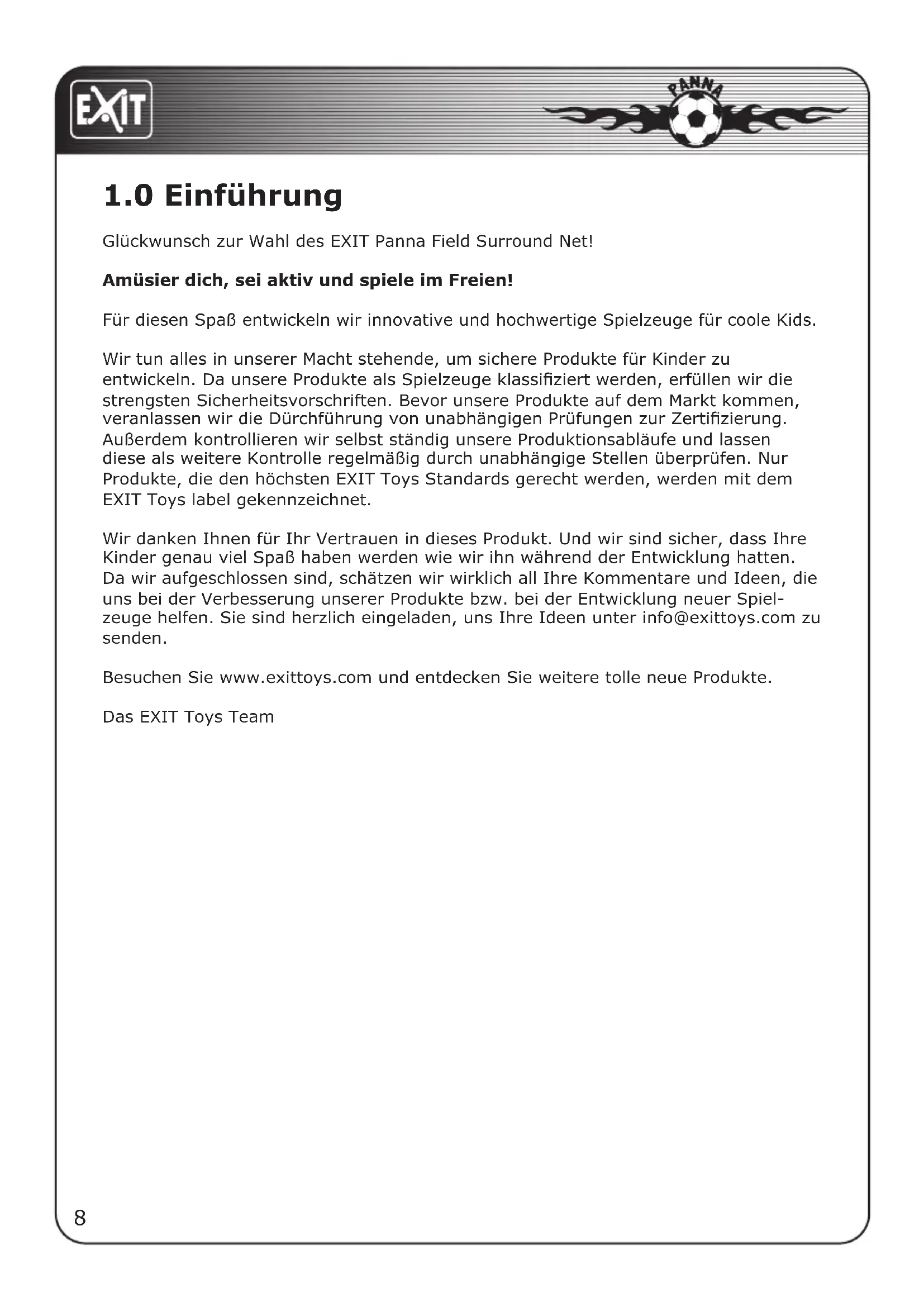 Wir danken Ihnen für Ihr Vertrauen in dieses Produkt. Und wir sind sicher, dass Ihre Kinder genau viel Spaß haben werden wie wir ihn während der Entwicklung hatten. Da wir aufgeschlossen sind, schätzen wir wirklich all Ihre Kommentare und Ideen, die uns bei der Verbesserung unserer Produkte bzw. bei der Entwicklung neuer Spielzeuge helfen. Sie sind herzlich eingeladen, uns Ihre Ideen unter info@exittoys.com zu senden.