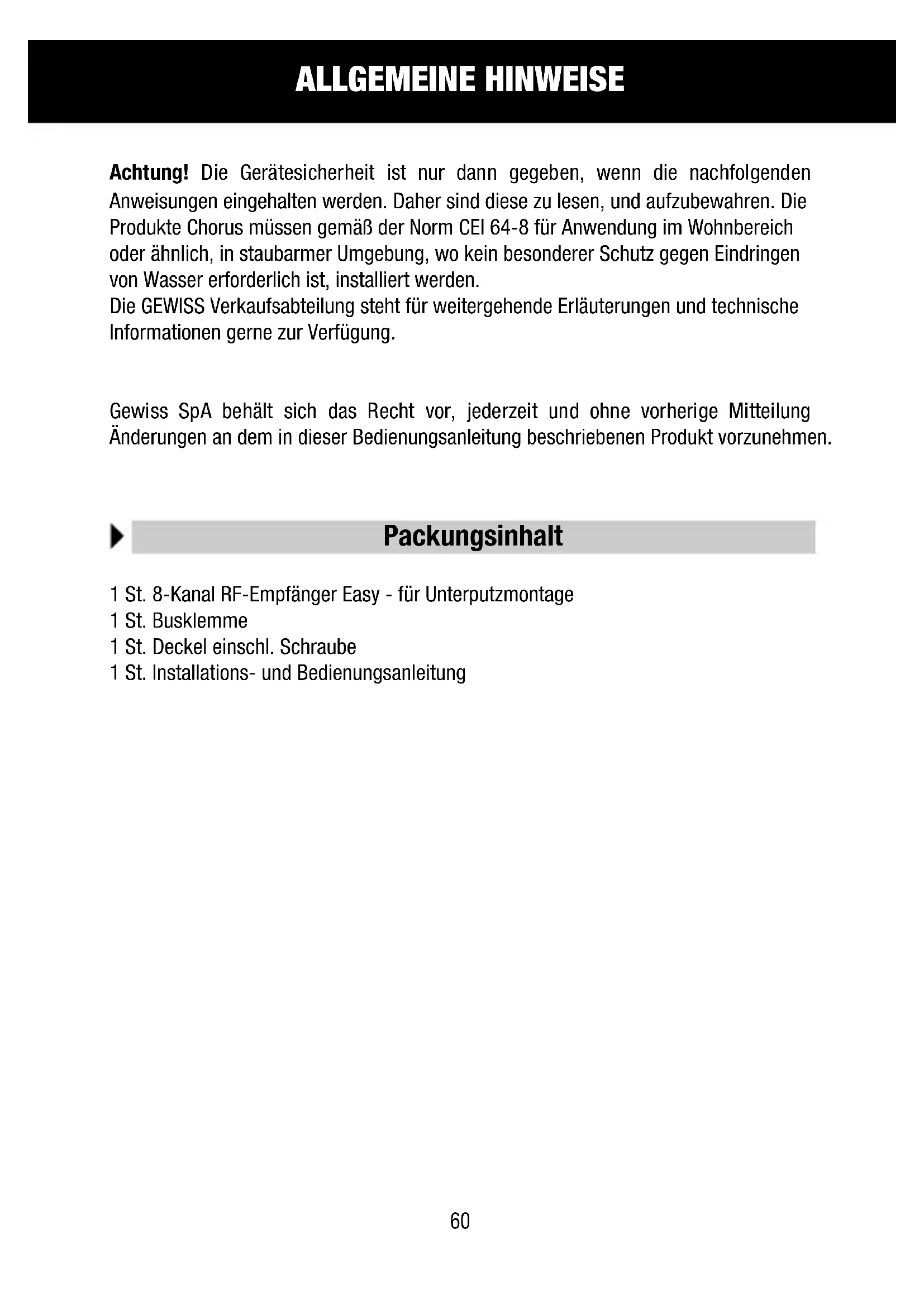 Achtung! Die Gerätesicherheit ist nur dann gegeben, wenn die nachfolgenden Anweisungen eingehalten werden. Daher sind diese zu lesen, und aufzubewahren. Die Produkte Chorus mussen gemäß der Norm CEI 64-8 für Anwendung im Wohnbereich oder ähnlich, in staubarmer Umgebung, wo kein besonderer Schutz gegen Eindringen von Wasser erforderlich ist, installiert werden.
