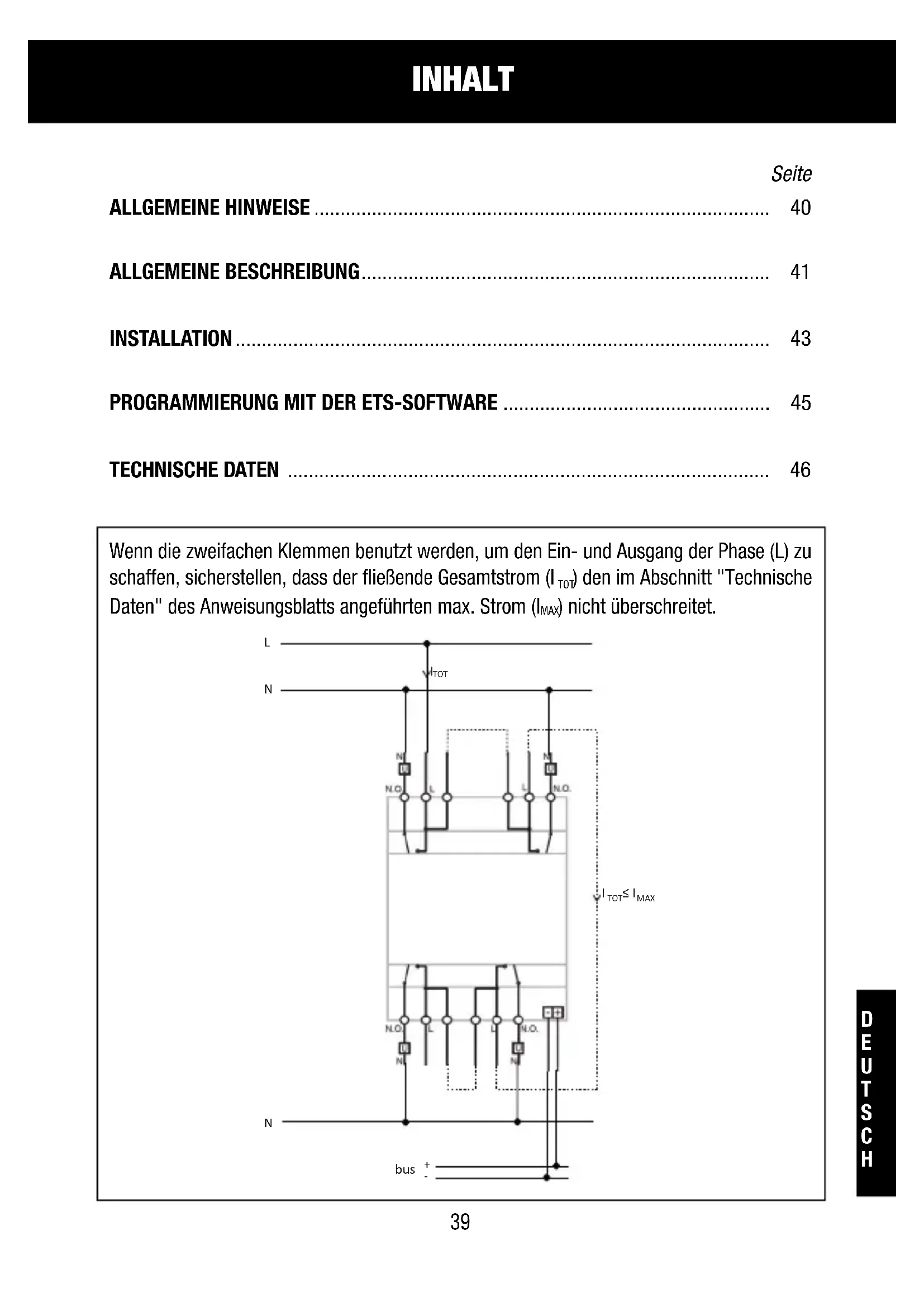 Wenn die zweifachen Klemmen benutzt werden, um den Ein- und Ausgang der Phase (L) zu schaffen, sicherstellen, dass der fließende Gesamtstrom ( I_TOT ) den im Abschnitt "Technische Daten" des Anweisungsblatts angeführten max. Strom ( I_MAX ) nicht überschreitet.