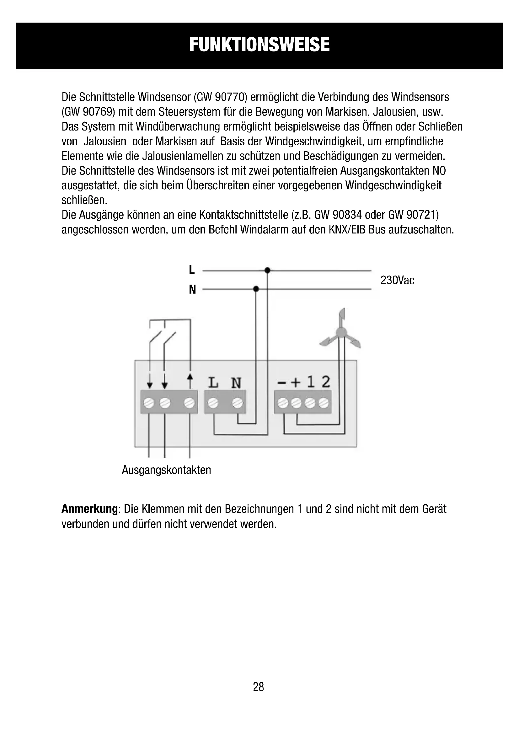 Die Ausgänge können an eine Kontaktschnittstelle (z.B. GW 90834 oder GW 90721) angeschlossen werden, um den Befehl Windalarm auf den KNX/EIB Bus aufzuschalten.