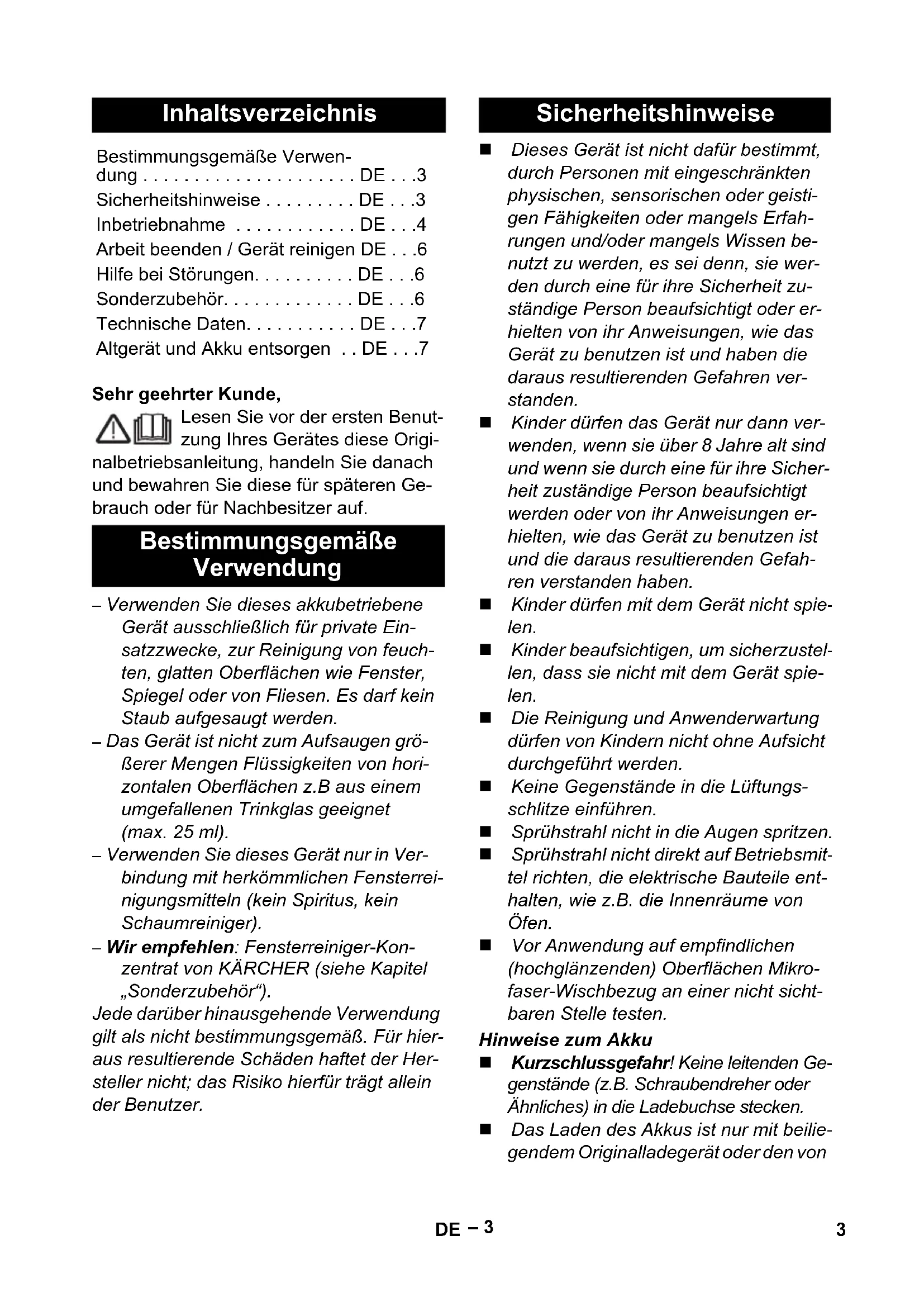 - Deutsch 3 English 8 Français 13 Italiano 18 Nederlands 23 Español 28 Português 33 Dansk 38 Norsk 43 Svenska 48 Suomi 52 Ελληνικά 57 Türkçe 62 Русский 66 Magyar 72 Čeština 77 Slovenščina 82 Polski 87 Româneşte 92 Slovenčina 97 Hrvatski 102 Srpski 107 Български 112 Eesti 117 Latviešu 122 Lietuviškai 127 Українська 132 Қазақша 1372– 3 Sehr geehrter Kunde, Lesen Sie vor der ersten Benut- zung Ihres Gerätes diese Origi- nalbetriebsanleitung, handeln Sie danach und bewahren Sie diese für späteren Ge- brauch oder für Nachbesitzer auf. – Verwenden Sie dieses akkubetriebene Gerät ausschließlich für private Ein- satzzwecke, zur Reinigung von feuch- ten, glatten Oberflächen wie Fenster, Spiegel oder von Fliesen. Es darf kein Staub aufgesaugt werden. – Das Gerät ist nicht zum Aufsaugen grö- ßerer Mengen Flüssigkeiten von hori- zontalen Oberflächen z.B aus einem umgefallenen Trinkglas geeignet (max. 25 ml). – Verwenden Sie dieses Gerät nur in Ver- bindung mit herkömmlichen Fensterrei- nigungsmitteln (kein Spiritus, kein Schaumreiniger). – Wir empfehlen: Fensterreiniger-Kon- zentrat von KÄRCHER (siehe Kapitel „Sonderzubehör“). Jede darüber hinausgehende Verwendung gilt als nicht bestimmungsgemäß. Für hier- aus resultierende Schäden haftet der Her- steller nicht; das Risiko hierfür trägt allein der Benutzer. Dieses Gerät ist nicht dafür bestimmt, durch Personen mit eingeschränkten physischen, sensorischen oder geisti- gen Fähigkeiten oder mangels Erfah- rungen und/oder mangels Wissen be- nutzt zu werden, es sei denn, sie wer- den durch eine für ihre Sicherheit zu- ständige Person beaufsichtigt oder er- hielten von ihr Anweisungen, wie das Gerät zu benutzen ist und haben die daraus resultierenden Gefahren ver- standen. Kinder dürfen das Gerät nur dann ver- wenden, wenn sie über 8 Jahre alt sind und wenn sie durch eine für ihre Sicher- heit zuständige Person beaufsichtigt werden oder von ihr Anweisungen er- hielten, wie das Gerät zu benutzen ist und die daraus resultierenden Gefah- ren verstanden haben. Kinder dürfen mit dem Gerät nicht spie- len. Kinder beaufsichtigen, um sicherzustel- len, dass sie nicht mit dem Gerät spie- len. Die Reinigung und Anwenderwartung dürfen von Kindern nicht ohne Aufsicht durchgeführt werden. Keine Gegenstände in die Lüftungs- schlitze einführen. Sprühstrahl nicht in die Augen spritzen. Sprühstrahl nicht direkt auf Betriebsmit- tel richten, die elektrische Bauteile ent- halten, wie z.B. die Innenräume von Öfen. Vor Anwendung auf empfindlichen (hochglänzenden) Oberflächen Mikro- faser-Wischbezug an einer nicht sicht- baren Stelle testen. Hinweise zum Akku Kurzschlussgefahr! Keine leitenden Ge- genstände (z.B. Schraubendreher oder Ähnliches) in die Ladebuchse stecken. Das Laden des Akkus ist nur mit beilie- gendem Originalladegerät oder den von Inhaltsverzeichnis Bestimmungsgemäße Verwen- dung