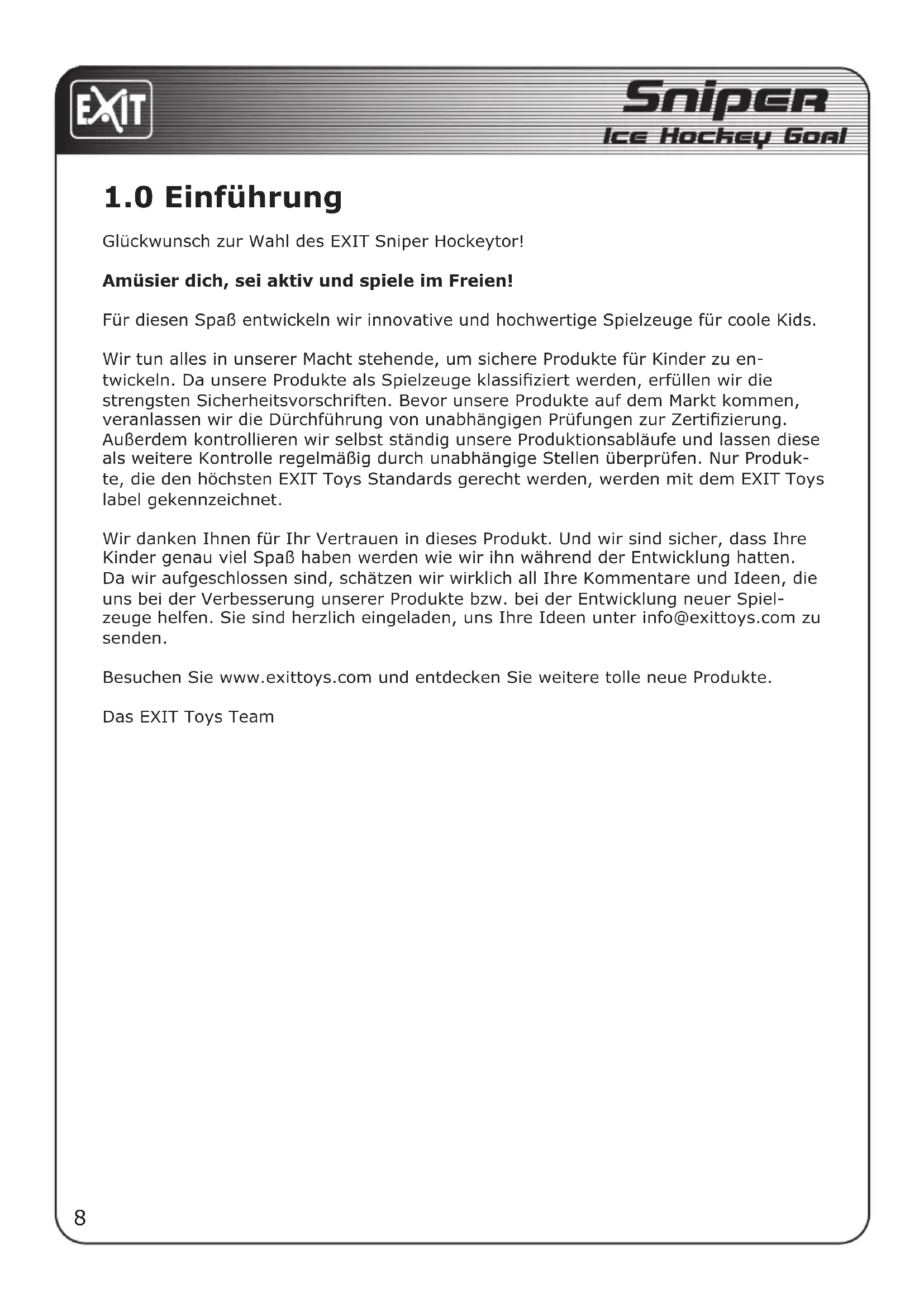 Wir danken Ihnen für Ihr Vertrauen in dieses Produkt. Und wir sind sicher, dass Ihre Kinder genau viel Spaß haben werden wie wir ihn während der Entwicklung hatten. Da wir aufgeschlossen sind, schätzen wir wirklich all Ihre Kommentare und Ideen, die uns bei der Verbesserung unserer Produkte bzw. bei der Entwicklung neuer Spielzeuge helfen. Sie sind herzlich eingeladen, uns Ihre Ideen unter info@exittoys.com zu senden.
