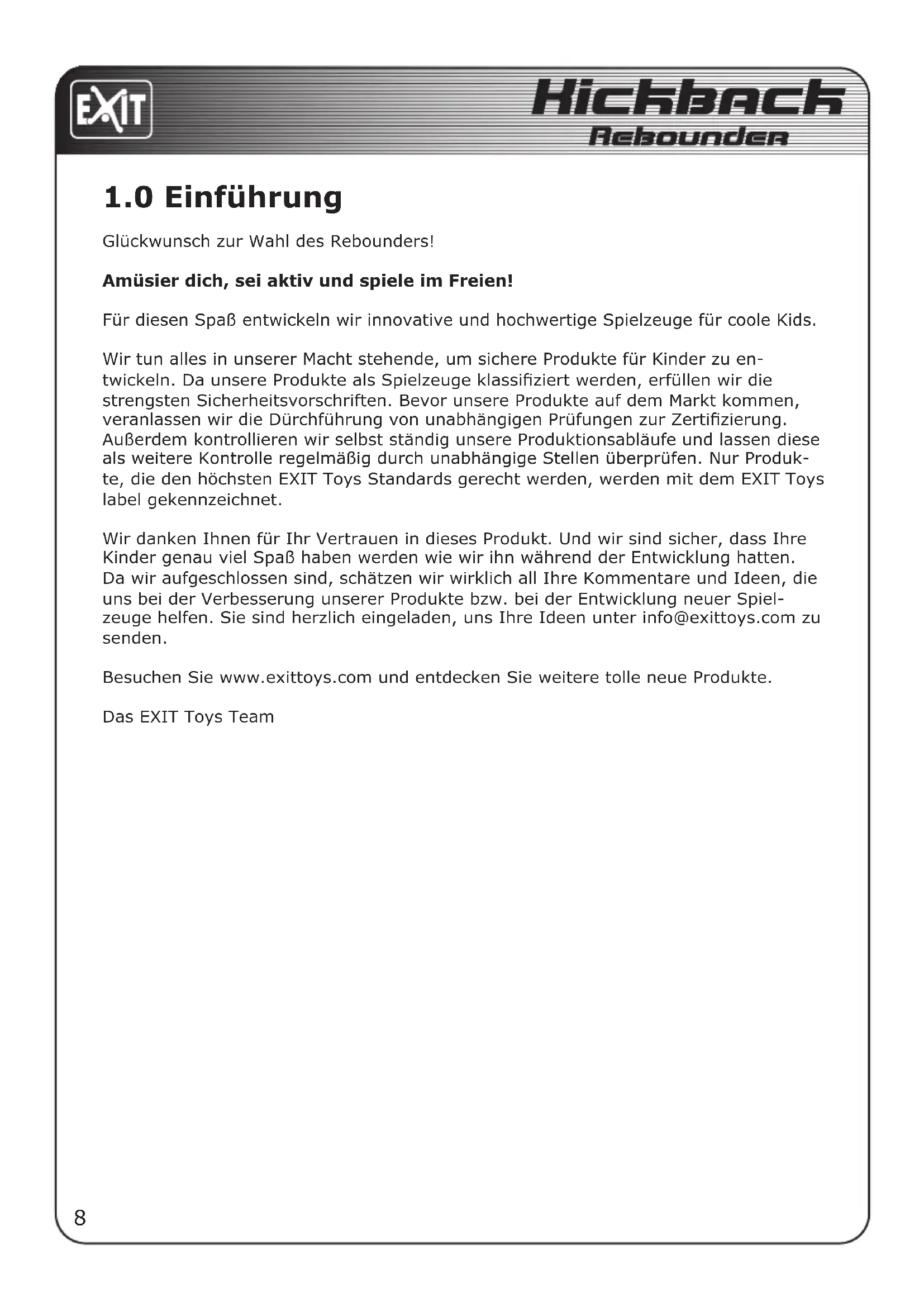 Wir danken Ohnen für Ihr Vertrauen in diesen Produkt. Und wir sind sicher, dass ihre Kinder bereits viel Spaß haben werden wie wir ihn während der Entwicklung hatten. Da wir aufgeschlossen sind, schätzen wir wirklich all ihre Kommentare und Ideen, die uns bei der Verbesserung unserer Produkte bzw. bei der Entwicklung neuer Spiel-zeuge halten. Sie sind herzlich eingeladen, uns ihre Ideen unter info@exittoys.com zu halten.