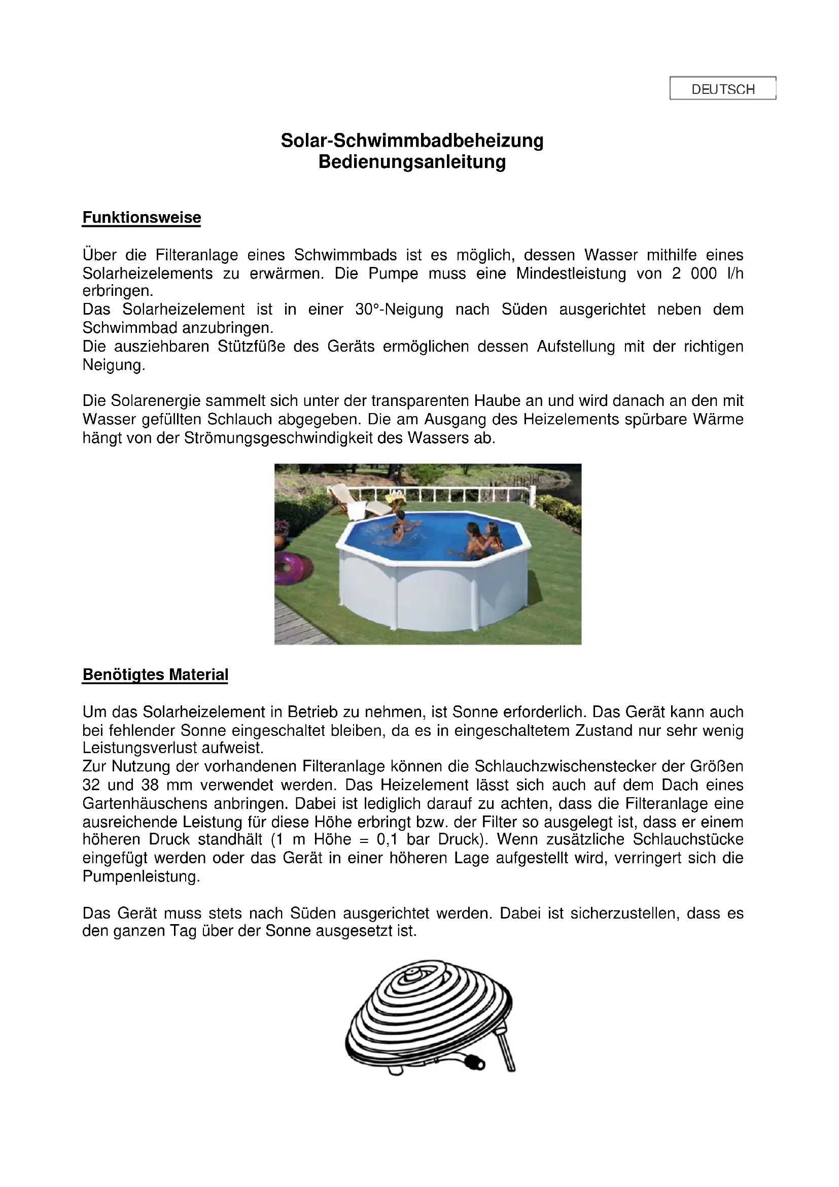 Benötigtes Material Um das Solarheizelement in Betrieb zu nehmen, ist Sonne erforderlich. Das Gerät kann auch bei fehlender Sonne eingeschaltet bleiben, da es in eingeschaltetem Zustand nur sehr wenig Leistungsverlust aufweist. Zur Nutzung der vorhandenen Filteranlage können die Schlauchzwischenstecker der Größen 32 und 38 mm verwendet werden. Das Heizelement lässt sich auch auf dem Dach eines Gartenhäuschens anbringen. Dabei ist lediglich darauf zu achten, dass die Filteranlage eine ausreichende Leistung für diese Höhe erbringt bzw. der Filter so ausgelegt ist, dass er einem höheren Druck standhält (1 m Höhe = 0,1 bar Druck). Wenn zusätzliche Schlauchstücke eingefügt werden oder das Gerät in einer höheren Lage aufgestellt wird, verringert sich die Pumpenleistung. Das Gerät muss stets nach Süden ausgerichtet werden. Dabei ist sicherzustellen, dass es den ganzen Tag über der Sonne ausgesetzt ist.