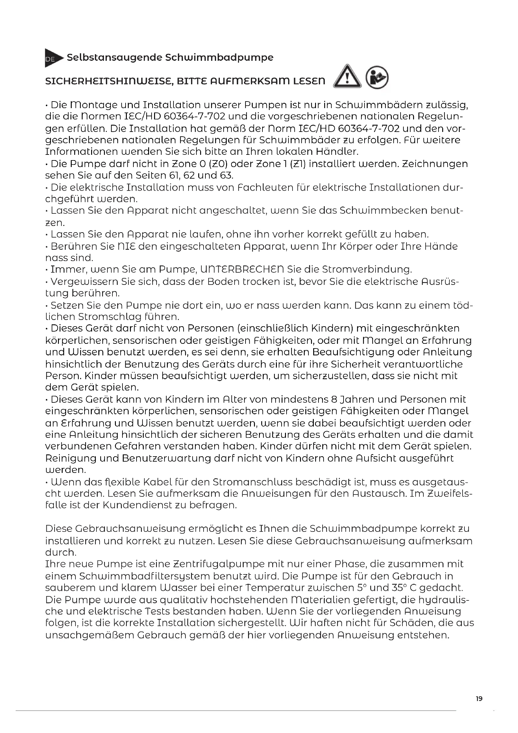 - Wenn das flexible Kabel für den Stromanschluss beschädigt ist, muss es ausgetaus- cht werden. Lesen Sie aufmerksam die Anweisungen für den Austausch. Im Zweifels- falle ist der Kundendienst zu befragen. Diese Gebrauchsanweisung ermöglicht es Ihnen die Schwimmbadpumpe korrekt zu installieren und korrekt zu nutzen. Lesen Sie diese Gebrauchsanweisung aufmerksam durch. Ihre neue Pumpe ist eine Zentrifugalpumpe mit nur einer Phase, die zusammen mit einem Schwimmbadfiltersystem benutzt wird. Die Pumpe ist für den Gebrauch in sauberem und klarem Wasser bei einer Temperatur zwischen 5° und 35° C gedacht. Die Pumpe wurde aus qualitativ hochstehenden Materialien gefertigt, die hydraulis- che und elektrische Tests bestanden haben. Wenn Sie der vorliegenden Anweisung folgen, ist die korrekte Installation sichergestellt. Wir haften nicht für Schäden, die aus unsachgemäßem Gebrauch gemäß der hier vorliegenden Anweisung entstehen. DE20 WICHTIG Dieses Handbuch enthält wesentliche Informationen über die Sicherheitsvorkehrun- gen, die bei der Installation und Inbetriebnahme zu treffen sind. Daher ist es unbedingt erforderlich, dass sowohl der Installateur als auch der Benutzer vor Beginn der Montage und Inbetriebnahme diese Anweisungen lesen. ALLGEMEINE SICHERHEITSBESTIMMUNGEN