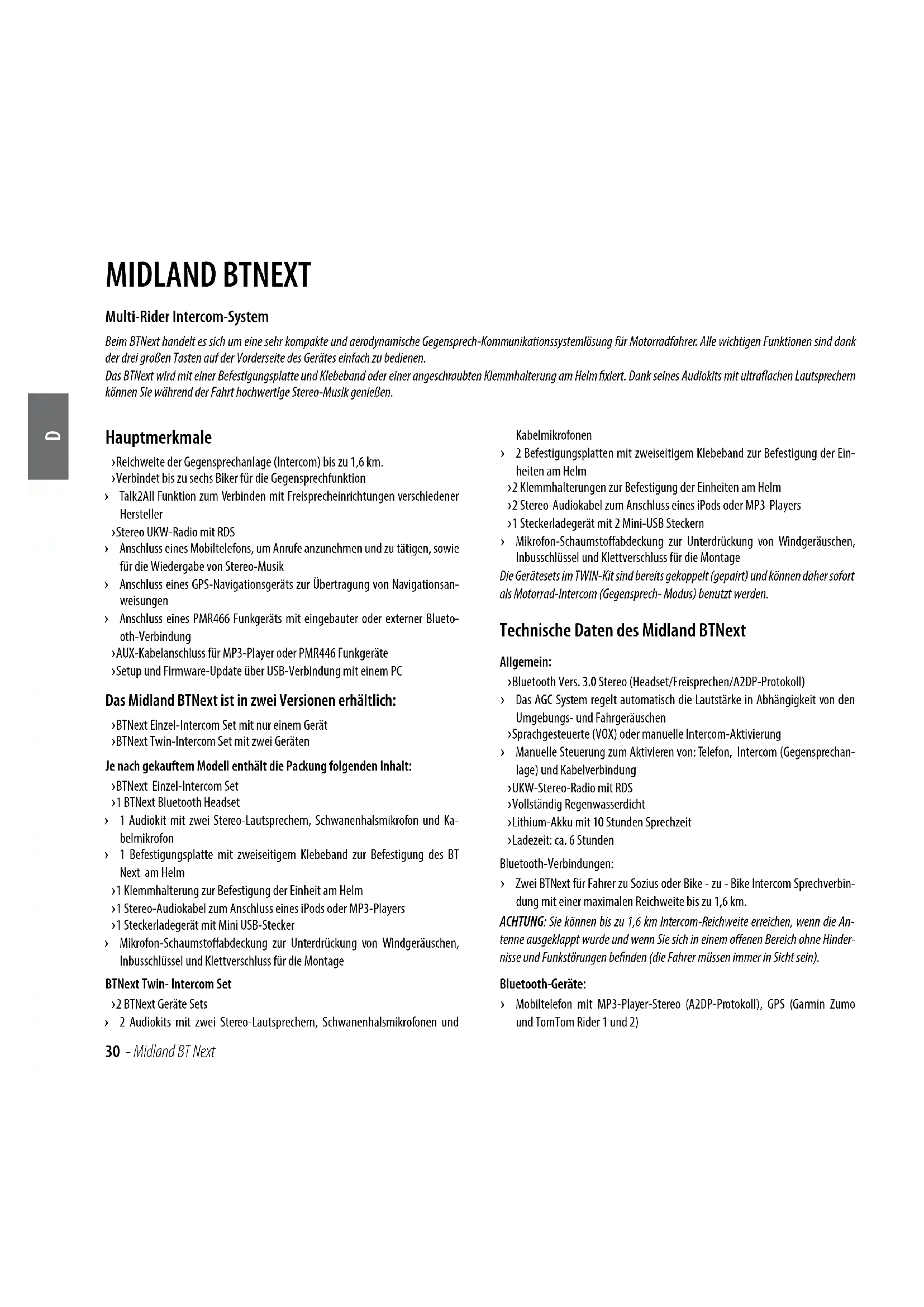 MIDLAND BTNEXT Multi-Rider Intercom-System Beim BTNext handelt es sich um eine sehr kompakte und aerodynamische Gegensprech-Kommunikationssystemlösung für Motorradfahrer. Alle wichtigen Funktionen sind dank der drei großen Tasten auf der Vorderseite des Gerätes einfach zu bedienen. Das BTNext wird mit einer Befestigungsplatte und Klebeband oder einer angeschraubten Klemmhalterung am Helm xiert. Dank seines Audiokits mit ultraachen Lautsprechern können Sie während der Fahrt hochwertige Stereo-Musik genießen. Hauptmerkmale › Reichweite der Gegensprechanlage (Intercom) bis zu 1,6 km. › Verbindet bis zu sechs Biker für die Gegensprechfunktion › Talk2All Funktion zum Verbinden mit Freisprecheinrichtungen verschiedener Hersteller › Stereo UKW-Radio mit RDS › Anschluss eines Mobiltelefons, um Anrufe anzunehmen und zu tätigen, sowie für die Wiedergabe von Stereo-Musik › Anschluss eines GPS-Navigationsgeräts zur Übertragung von Navigationsan- weisungen › Anschluss eines PMR466 Funkgeräts mit eingebauter oder externer Blueto- oth-Verbindung › AUX-Kabelanschluss für MP3-Player oder PMR446 Funkgeräte › Setup und Firmware-Update über USB-Verbindung mit einem PC Das Midland BTNext ist in zwei Versionen erhältlich: › BTNext Einzel-Intercom Set mit nur einem Gerät › BTNext Twin-Intercom Set mit zwei GerätenJe nach gekauftem Modell enthält die Packung folgenden Inhalt: › BTNext Einzel-Intercom Set › 1 BTNext Bluetooth Headset › 1 Audiokit mit zwei Stereo-Lautsprechern, Schwanenhalsmikrofon und Ka- belmikrofon › 1 Befestigungsplatte mit zweiseitigem Klebeband zur Befestigung des BT Next am Helm › 1 Klemmhalterung zur Befestigung der Einheit am Helm › 1 Stereo-Audiokabel zum Anschluss eines iPods oder MP3-Players › 1 Steckerladegerät mit Mini USB-Stecker › Mikrofon-Schaumstoabdeckung zur Unterdrückung von Windgeräuschen, Inbusschlüssel und Klettverschluss für die MontageBTNext Twin- Intercom Set › 2 BTNext Geräte Sets › 2 Audiokits mit zwei Stereo-Lautsprechern, Schwanenhalsmikrofonen und Kabelmikrofonen › 2 Befestigungsplatten mit zweiseitigem Klebeband zur Befestigung der Ein- heiten am Helm › 2 Klemmhalterungen zur Befestigung der Einheiten am Helm › 2 Stereo-Audiokabel zum Anschluss eines iPods oder MP3-Players › 1 Steckerladegerät mit 2 Mini-USB Steckern › Mikrofon-Schaumstoabdeckung zur Unterdrückung von Windgeräuschen, Inbusschlüssel und Klettverschluss für die MontageDie Gerätesets im TWIN-Kit sind bereits gekoppelt (gepairt) und können daher sofort als Motorrad-Intercom (Gegensprech- Modus) benutzt werden. Technische Daten des Midland BTNext Allgemein: › Bluetooth Vers. 3.0 Stereo (Headset/Freisprechen/A2DP-Protokoll) › Das AGC System regelt automatisch die Lautstärke in Abhängigkeit von den Umgebungs- und Fahrgeräuschen › Sprachgesteuerte (VOX) oder manuelle Intercom-Aktivierung › Manuelle Steuerung zum Aktivieren von: Telefon, Intercom (Gegensprechan- lage) und Kabelverbindung › UKW-Stereo-Radio mit RDS › Vollständig Regenwasserdicht › Lithium-Akku mit 10 Stunden Sprechzeit › Ladezeit: ca. 6 StundenBluetooth-Verbindungen: › Zwei BTNext für Fahrer zu Sozius oder Bike - zu - Bike Intercom Sprechverbin- dung mit einer maximalen Reichweite bis zu 1,6 km. ACHTUNG: Sie können bis zu 1,6 km Intercom-Reichweite erreichen, wenn die An- tenne ausgeklappt wurde und wenn Sie sich in einem oenen Bereich ohne Hinder-nisse und Funkstörungen benden (die Fahrer müssen immer in Sicht sein).Bluetooth-Geräte: › Mobiltelefon mit MP3-Player-Stereo (A2DP-Protokoll), GPS (Garmin Zumo und TomTom Rider 1 und 2)D Midland BT Next - 31 › PMR446-Funkgerät (mit eingebauter oder externer Bluetooth-Verbindung) für Motorrad zu Motorrad-Gruppenkommunikation Kabelverbindungen: › Für Stereo-Audioeingang (iPod/MP3-Player) › Für PMR446-Funkgerät (mit optionalem Kabel) Achtung: Das Midland BTNext ist regen- und wasserfest konzipiert. Stellen Sie aber dennoch sicher, dass bei Regen die Gummischutzkappen die Anschlüsse vollständig abdecken. Aufladen des Akkus Achtung: Vergewissern Sie sich, dass das Gerät voll aufgeladen wurde. Bitte laden Sie das Gerät vor der ersten Benutzung für mindestens 8 Stunden auf. Zum Laden das Steckerladegerät in die Ladebuchse stecken (nehmen Sie die Gummischutzkappe ab, um der Stecker einzustecken). Die rote LED am Gerät fängt an zu blinken, sobald der Ladevorgang startet. Laden Sie das Headset, bis die rote LED aufhört zu blinken oder die blaue LED aueuchtet. Wenn der Ladevorgang abgeschlossen ist (die rote LED blinkt nicht mehr), ziehen Sie den Ladestecker vom Headset ab. Normalerweise dauert beim ersten Mal das volle Auaden 6 Stunden. Achtung: Jedes Mal, wenn der Mini-USB-Ladestecker eingesteckt (oder abgezogen) wurde, wird das Gerät gleichzeitig automatisch ausgeschaltet. Um das Gerät wäh- rend des Ladevorgangs weiter zu benutzen, müssen Sie es daher nach dem Einste- cken des Ladesteckers noch einmal einschalten. Beschreibung des Geräts und Montagehalterung Das BTNext verfügt auf der Vorderseite über fünf Tasten. Die drei großen Haupt- tasten sind Multi-Funktionstasten: „Weiter“ (links), die „mittlere“ Taste und „Zurück“ (rechts). Die beiden kleinen runden Tasten sind die Lautstärkestärketa- sten + und -. Beschreibung der Kabelverbindung › Ladebuchse: hier kann das Gerät mit einem Standard Mini-USBNetzteil ge- laden werden › Audioset Buchse: hier können Sie ein Audioset anschließen (Stereo-Headset und Mikrofon) › Zusatzbuchse für Audiogeräte (AUX) 2,5mm: hier können Sie eine Audio- quelle, wie z. B. einen Stereo iPod/MP3-Player oder PMR446 Funkgerät an- schließen Zusätzlich besitzt das BTNext oben eine ausklappbare Antenne für maximale Reichweite. Drücken Sie die Antenne zum Ausklappen sanft nach hinten. Sie klappt an- schließend automatisch aus. Drücken Sie zum Einklappen der Antenne diese nur nach unten und bewegen Sie sie wied