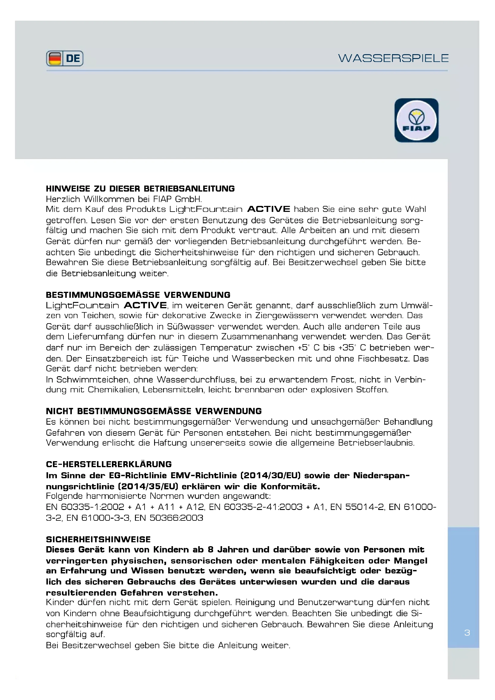 Mit dem Kauf des Produkts LightFountain ACTIVE haben Sie eine sehr gute Wahl getroffen. Lesen Sie vor der ersten Benutzung des Gerätes die Betriebsanleitung sorgfältig und machen Sie sich mit dem Produkt vertraut. Alle Arbeiten an und mit diesem Gerät dürfen nur gemäß der vorliegenden Betriebsanleitung durchgeführt werden. Beachten Sie unbedingt die Sicherheitshinweise für den richtigen und sicheren Gebrauch. Bewahren Sie diese Betriebsanleitung sorgfältig auf. Bei Besitzerwechsel geben Sie bitte die Betriebsanleitung weiter.