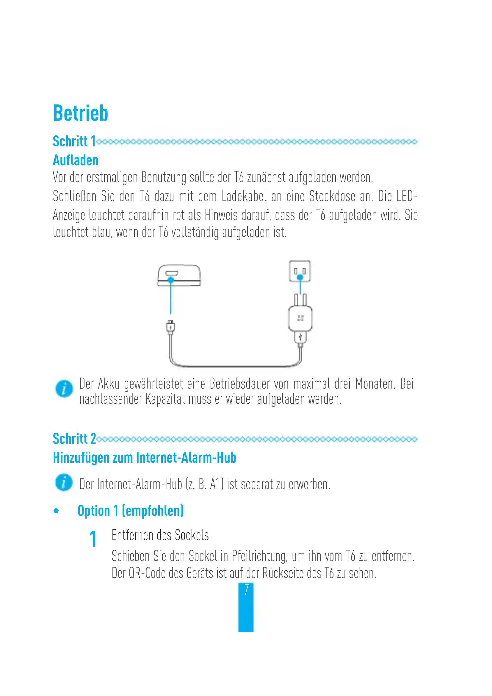 10dBm Button Base Charging Interface LED Indicator Flickers Blue Once: The door or window is in closed status. Flickers Red Once: The door or window is open. .7 Betrieb Schritt 1 Aufladen Vor der erstmaligen Benutzung sollte der T6 zunächst aufgeladen werden. Schließen Sie den T6 dazu mit dem Ladekabel an eine Steckdose an. Die LED- Anzeige leuchtet daraufhin rot als Hinweis darauf, dass der T6 aufgeladen wird. Sie leuchtet blau, wenn der T6 vollständig aufgeladen ist. Der Akku gewährleistet eine Betriebsdauer von maximal drei Monaten. Bei nachlassender Kapazität muss er wieder aufgeladen werden. Schritt 2 Hinzufügen zum Internet-Alarm-Hub Der Internet-Alarm-Hub (z.B. A1) ist separat zu erwerben.