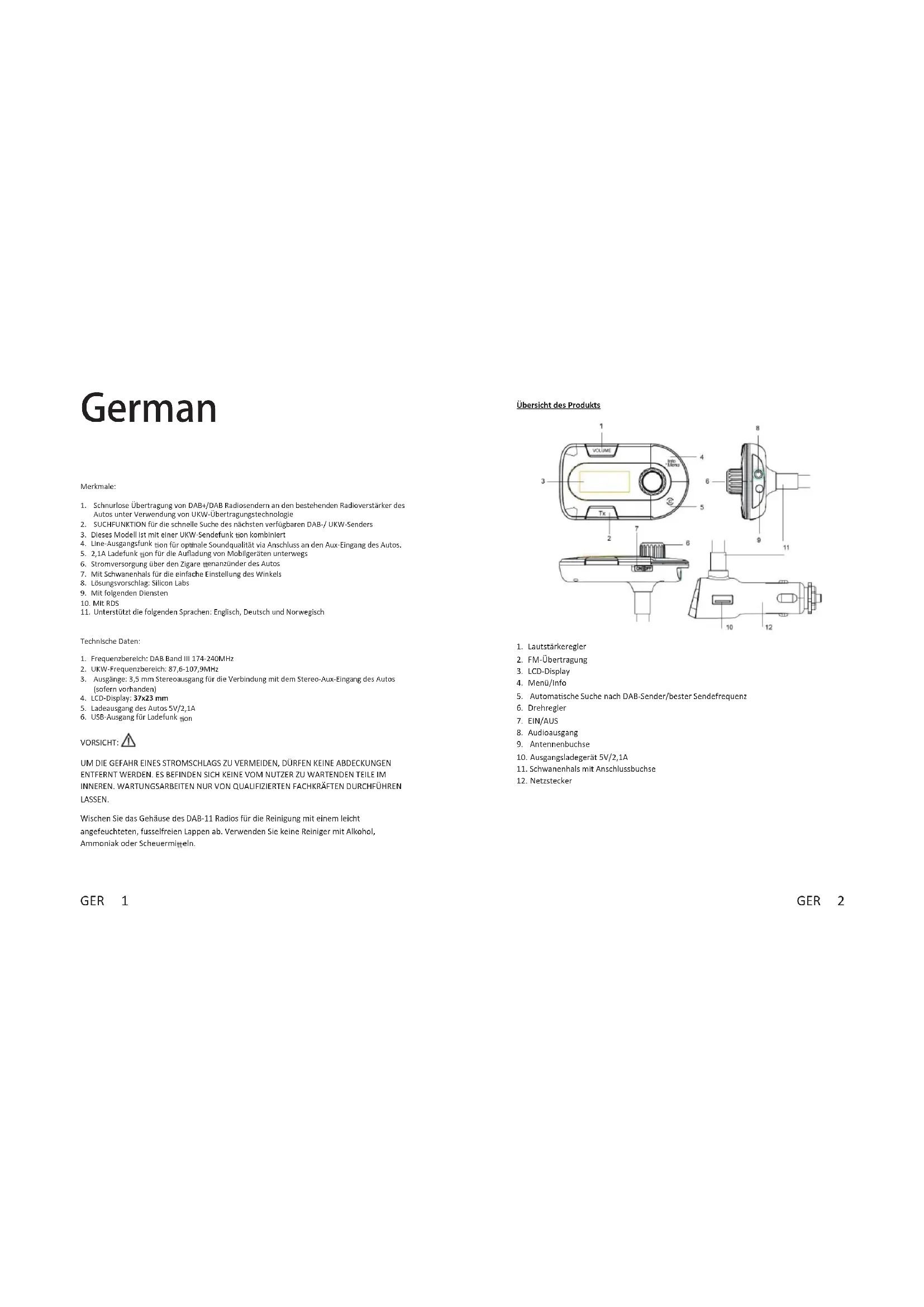 VORSICHT: UM DIE GEFAHR EINES STROMSCHLAGS ZU VERMEIDEN, DÜRFEN KEINE ABDECKUNGEN ENTFERNT WERDEN. ES BEFINDEN SICH KEINE VOM NUTZER ZU WARTENDEN TEILE IM INNEREN. WARTUNGSARBEITEN NUR VON QUALIFIZIERTEN FACHKRÄFTEN DURCHFÜHREN LASSEN. Wischen Sie das Gehäuse des DAB-11 Radios für die Reinigung mit einem leicht angefeuchteten, fusselfreien Lappen ab. Verwenden Sie keine Reiniger mit Alkohol, Ammoniak oder Scheuermi eln.