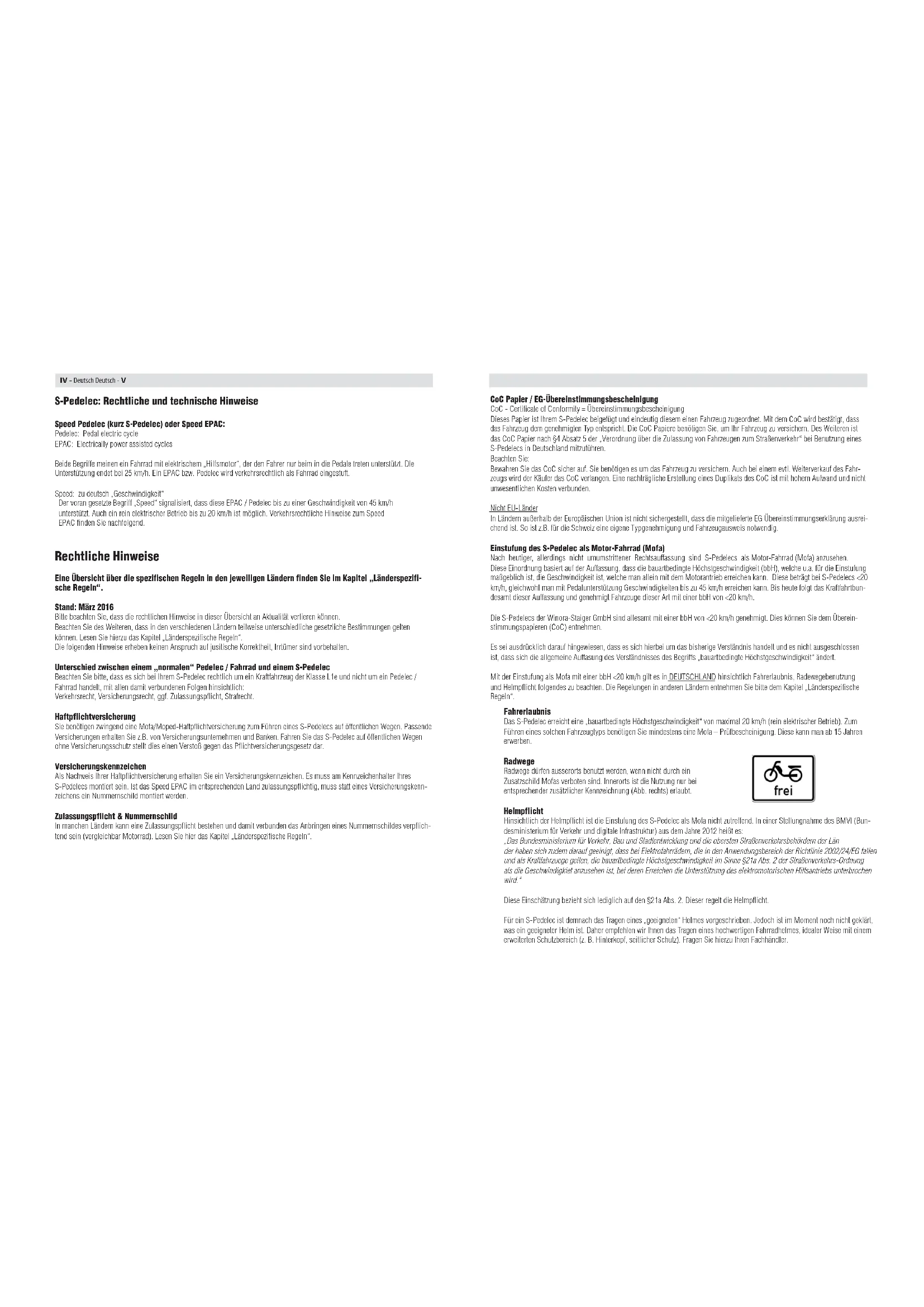 Dieses Papier ist Ihrem S-Pedeles beigelügt und eindeutig diesem einen Fahrzeug zugeordnet. Mit dem CoC wird bestätigt, dass das Fahrzeug dem gonchnigten Typ entspricht. Die CoC Papiera benötigen Sie, um Ihr Fahrzeug zu vorschern. Des Wolteron ist das CoC Papier nach §4 Acsatz 5 der „Verordnung über die Zulassung von Fahrzaugen zum Straßenverkehr“ bei Benutzung eines S-Pedeles in Deutschland mitzuführen.
