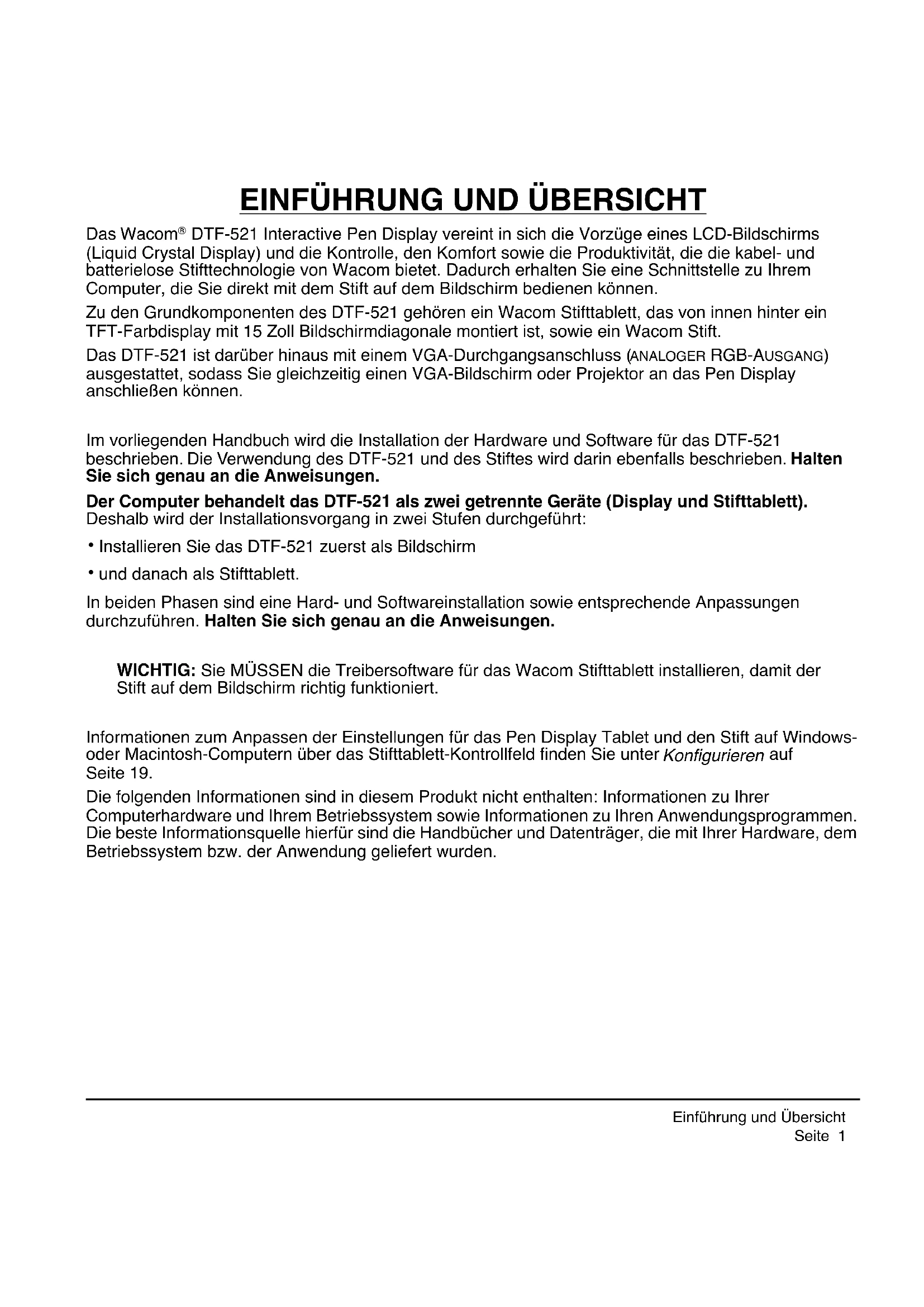 DTF-521 Interactive Pen Display vereint in sich die Vorzüge eines LCD-Bildschirms (Liquid Crystal Display) und die Kontrolle, den Komfort sowie die Produktivität, die die kabel- und batterielose Stifttechnologie von Wacom bietet. Dadurch erhalten Sie eine Schnittstelle zu Ihrem Computer, die Sie direkt mit dem Stift auf dem Bildschirm bedienen können. Zu den Grundkomponenten des DTF-521 gehören ein Wacom Stifttablett, das von innen hinter ein TFT-Farbdisplay mit 15 Zoll Bildschirmdiagonale montiert ist, sowie ein Wacom Stift. Das DTF-521 ist darüber hinaus mit einem VGA-Durchgangsanschluss ( ANALOGER RGB-AUSGANG) ausgestattet, sodass Sie gleichzeitig einen VGA-Bildschirm oder Projektor an das Pen Display anschließen können. Im vorliegenden Handbuch wird die Installation der Hardware und Software für das DTF-521 beschrieben. Die Verwendung des DTF-521 und des Stiftes wird darin ebenfalls beschrieben. Halten Sie sich genau an die Anweisungen. Der Computer behandelt das DTF-521 als zwei getrennte Geräte (Display und Stifttablett). Deshalb wird der Installationsvorgang in zwei Stufen durchgeführt:
