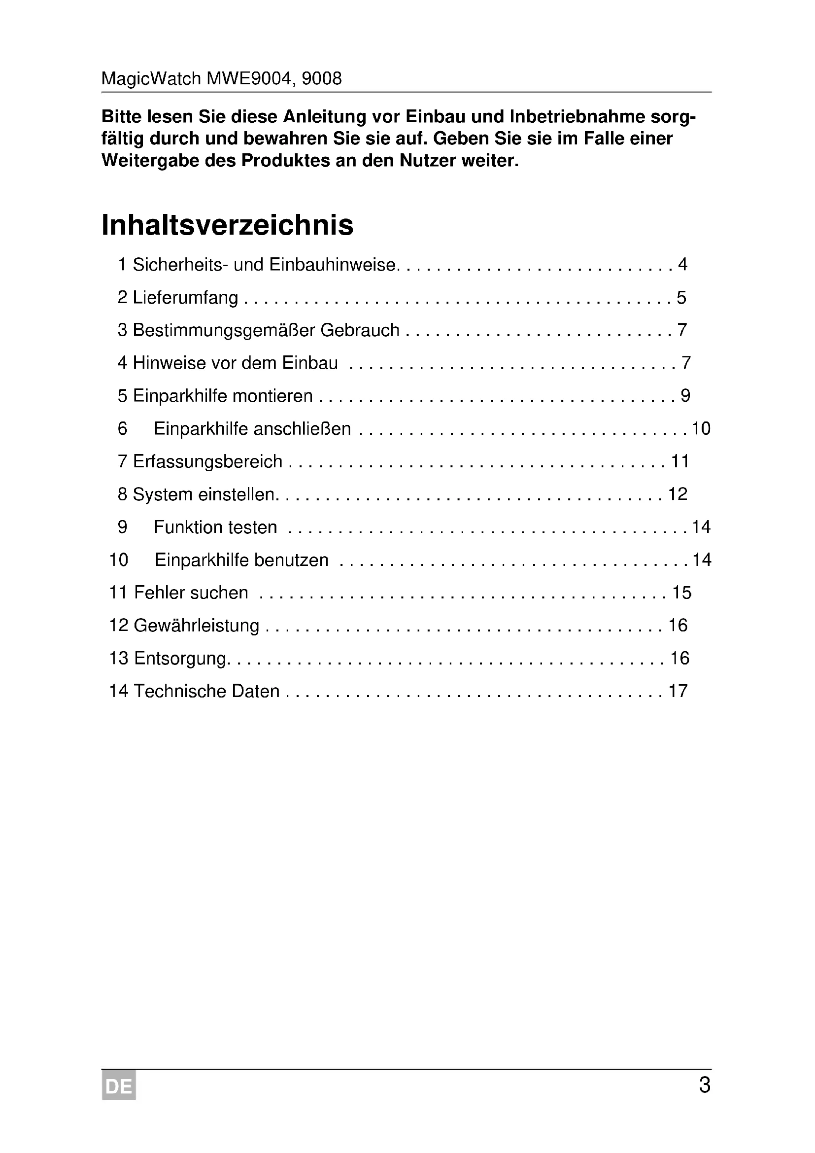 - 14 Technische Daten DE Sicherheits- und Einbauhinweise MagicWatch MWE9004, 9008 p. 17