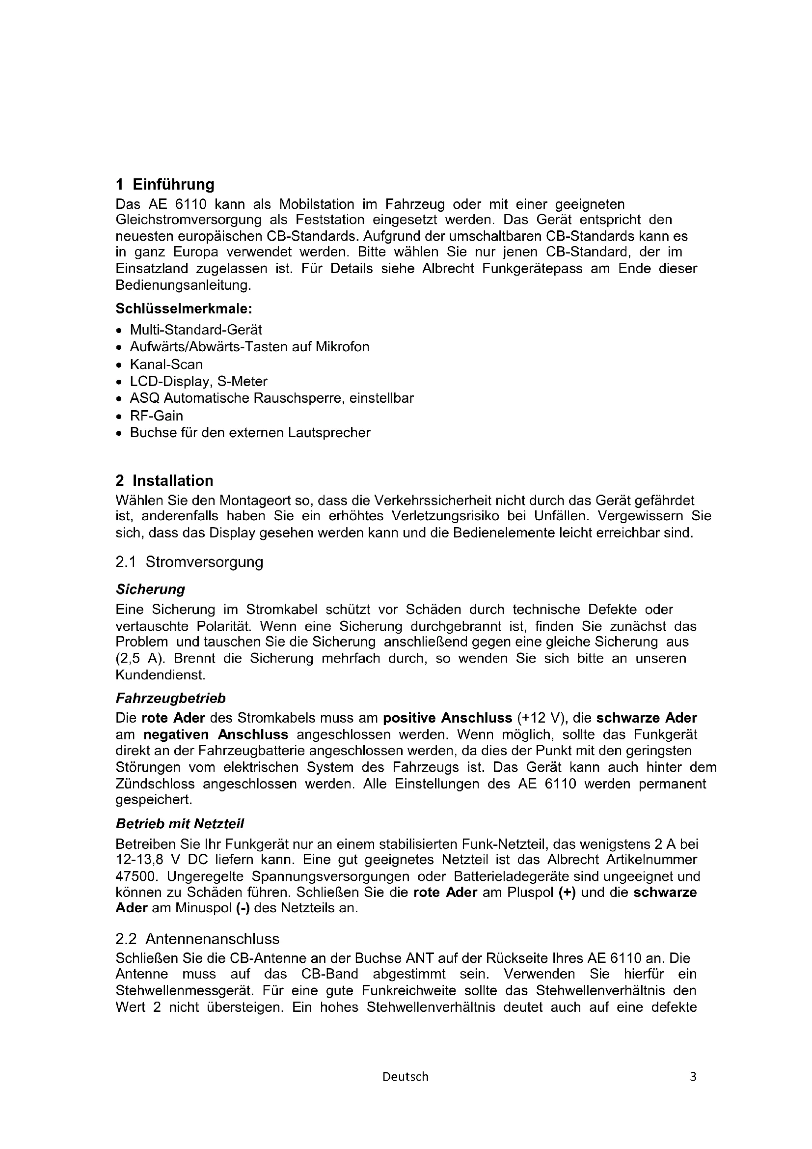 Sicherung Eine Sicherung im Stromkabel schützt vor Schäden durch technische Defekte oder vertauschte Polarität. Wenn eine Sicherung durchgebrannt ist, finden Sie zunächst das Problem und tauschen Sie die Sicherung anschließend gegen eine gleiche Sicherung aus (2,5 A). Brennt die Sicherung mehrfach durch, so wenden Sie sich bitte an unseren Kundendienst. Fahrzeugbetrieb Die rote Ader des Stromkabels muss am positive Anschluss (+12 V), die schwarze Ader am negativen Anschluss angeschlossen werden. Wenn möglich, sollte das Funkgerät direkt an der Fahrzeugbatterie angeschlossen werden, da dies der Punkt mit den geringsten Störungen vom elektrischen System des Fahrzeugs ist. Das Gerät kann auch hinter dem Zündschloss angeschlossen werden. Alle Einstellungen des AE 6110 werden permanent gespeichert. Betrieb mit Netzteil Betreiben Sie Ihr Funkgerät nur an einem stabilisierten Funk-Netzteil, das wenigstens 2 A bei 12-13,8 V DC liefern kann. Eine gut geeignetes Netzteil ist das Albrecht Artikelnummer 47500. Ungeregelte Spannungsversorgungen oder Batterieladegeräte sind ungeeignet und können zu Schäden führen. Schließen Sie die rote Ader am Pluspol (+) und die schwarze Ader am Minuspol (-) des Netzteils an.