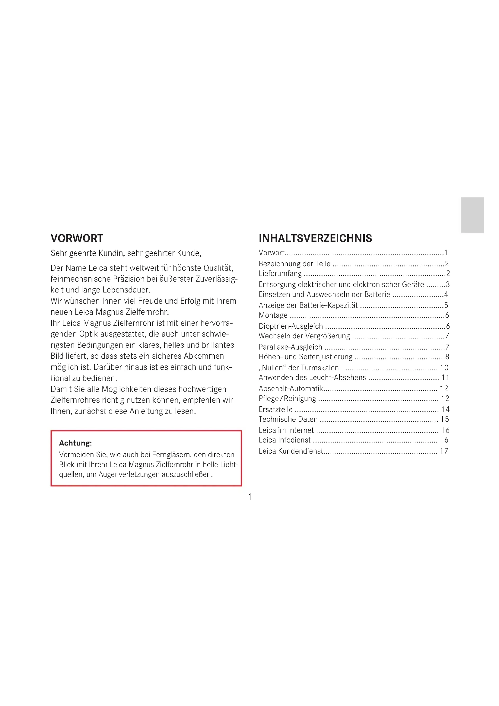 - 3e1 VORWORT Sehr geehrte Kundin, sehr geehrter Kunde, Der Name Leica steht weltweit für höchste Qualität, feinmechanische Präzision bei äußerster Zuverlässig- keit und lange Lebensdauer. Wir wünschen Ihnen viel Freude und Erfolg mit Ihrem neuen Leica Magnus Zielfernrohr. Ihr Leica Magnus Zielfernrohr ist mit einer hervorra- genden Optik ausgestattet, die auch unter schwie- rigsten Bedingungen ein klares, helles und brillantes Bild liefert, so dass stets ein sicheres Abkommen möglich ist. Darüber hinaus ist es einfach und funk- tional zu bedienen. Damit Sie alle Möglichkeiten dieses hochwertigen Zielfernrohres richtig nutzen können, empfehlen wir Ihnen, zunächst diese Anleitung zu lesen. INHALTSVERZEICHNIS Vorwort p. 1