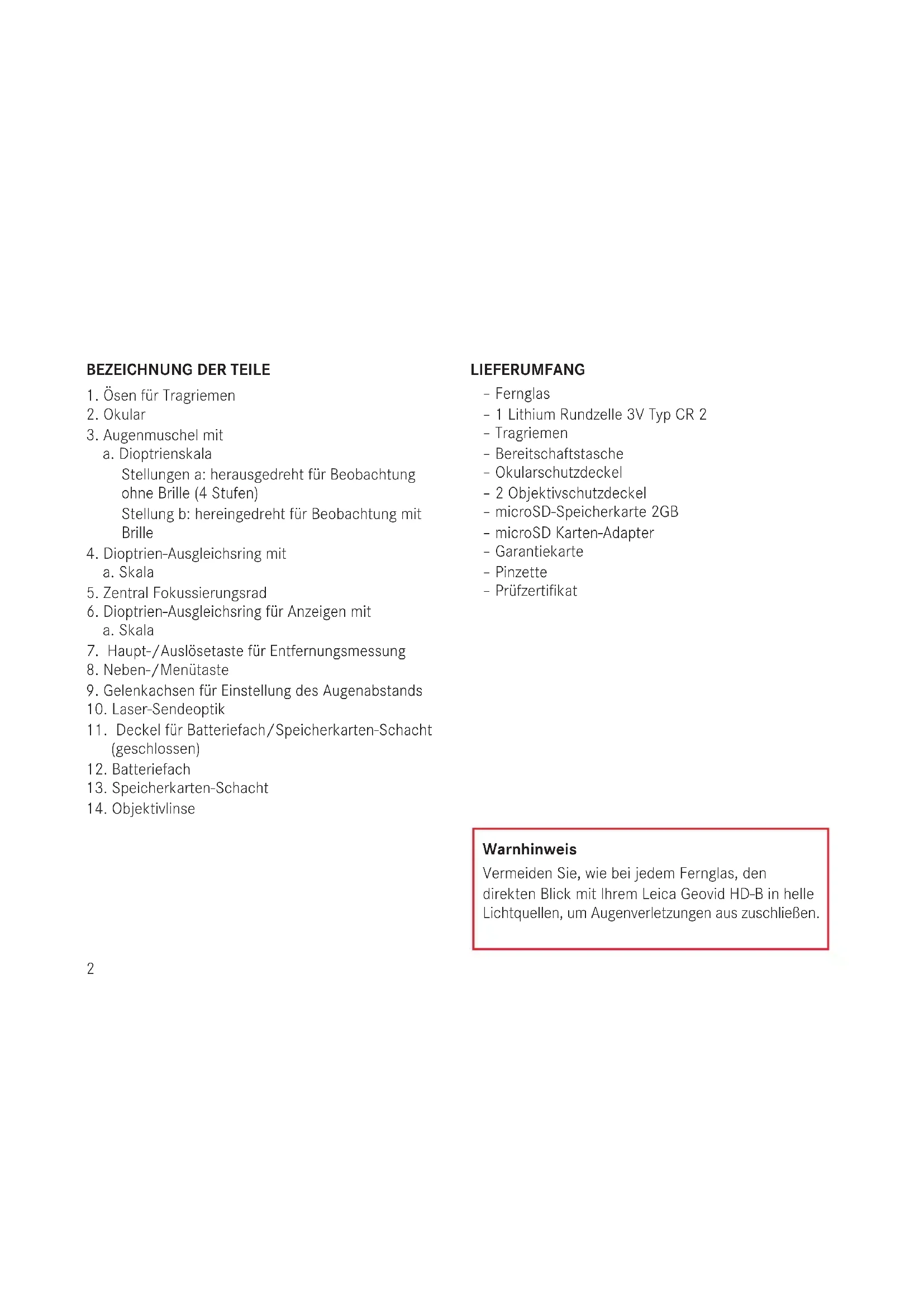 LIEFERUMFANG – Fernglas – 1 Lithium Rundzelle 3V Typ CR 2 – Tragriemen – Bereitschaftstasche – Okularschutzdeckel – 2 Objektivschutzdeckel – microSD-Speicherkarte 2GB – microSD Karten-Adapter – Garantiekarte – Pinzette – Prüfzertifikat Warnhinweis Vermeiden Sie, wie bei jedem Fernglas, den direkten Blick mit Ihrem Leica Geovid HD-B in helle Lichtquellen, um Augenverletzungen aus zuschließen.3 VORWORT Sehr geehrte Kundin, sehr geehrter Kunde, der Name Leica steht weltweit für höchste Qualität, feinmechanische Präzision bei äußerster Zuverlässigkeit und langer Lebensdauer. Wir wünschen Ihnen viel Freude und Erfolg mit Ihrem neuen Leica Geovid HD-B. Dieses Fernglas mit integriertem Entfernungsmesser sendet unsichtbare und für das Auge unschädliche Infrarot-Impulse aus und berechnet über einen eingebauten Mikroprozessor aus dem reflektierten Signalanteil die Objektentfernung. Darüber hinaus erfasst es Umgebungs- und Einsatzbedingungen. Zusammen mit diesen und den gemessenen Entfernungen kann es die für verschiedene, wählbare und frei programmierbare Ballistik-Kurven entsprechenden Korrekturen des Haltepunkts, die entsprechenden Klick-Verstellungen des Absehens eines Zielfernrohres oder die äquivalenten horizontalen Entfernungen berechnen und anzeigen. Damit Sie alle Möglichkeiten dieses hochwertigen und vielseitigen Gerätes richtig nutzen können, empfehlen wir Ihnen, zunächst diese Anleitung zu lesen.