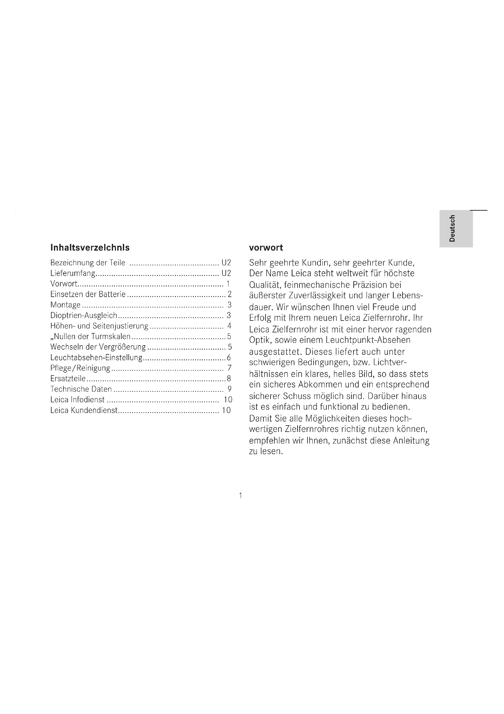 - Leica Kundendienst vorwort Sehr geehrte Kundin, sehr geehrter Kunde, Der Name Leica steht weltweit für höchste Qualität, feinmechanische Präzision bei äußerster Zuverlässigkeit und langer Lebens- dauer. Wir wünschen Ihnen viel Freude und Erfolg mit Ihrem neuen Leica Zielfernrohr. Ihr Leica Zielfernrohr ist mit einer hervor ragenden Optik, sowie einem Leuchtpunkt-Absehen ausgestattet. Dieses liefert auch unter schwierigen Bedingungen, bzw. Lichtver- hältnissen ein klares, helles Bild, so dass stets ein sicheres Abkommen und ein entsprechend sicherer Schuss möglich sind. Darüber hinaus ist es einfach und funktional zu bedienen. Damit Sie alle Möglichkeiten dieses hoch- wertigen Zielfernrohres richtig nutzen können, empfehlen wir Ihnen, zunächst diese Anleitung zu lesen. p. 10