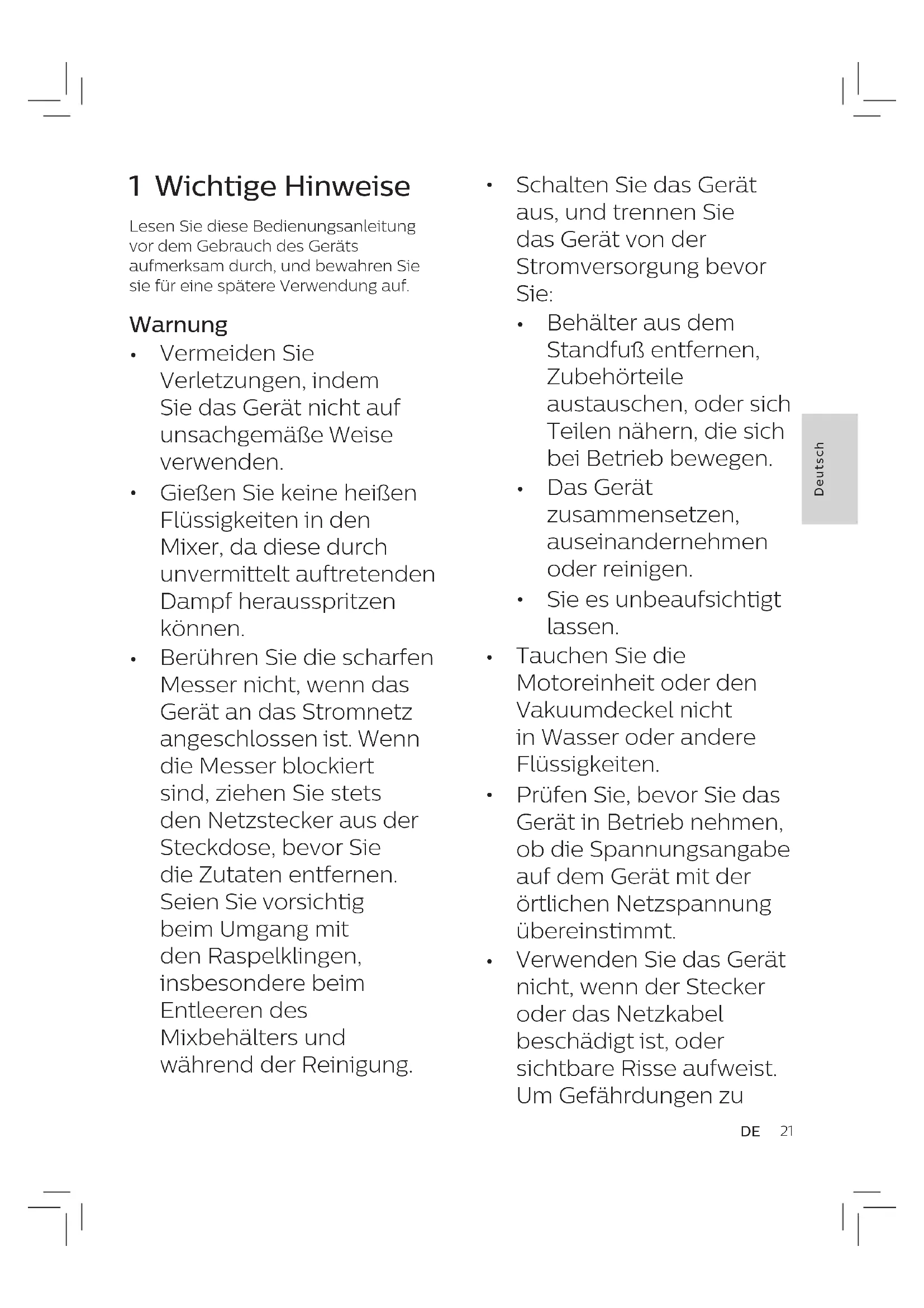 Lassen Sie den Mixer nicht länger als 30 Sekunden ohne Zutaten laufen. Es könnte zu einer Überhitzung führen. vermeiden, darf ein defektes Netzkabel nur von einem Philips Service-Center, einer von Philips autorisierten Werkstatt oder einer ähnlich qualizierten Person durch ein Original-Ersatzkabel ersetzt werden.