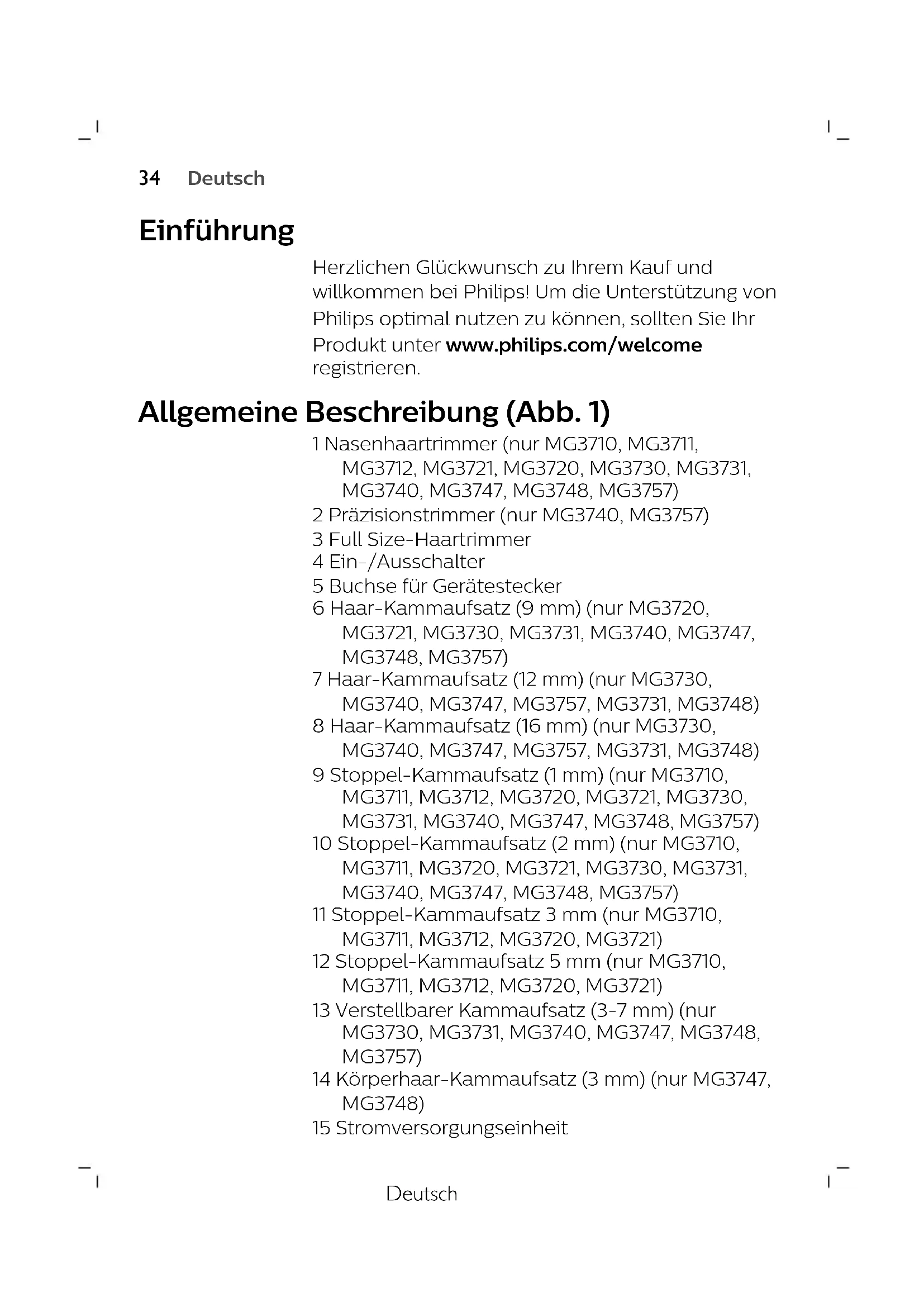 DanskDeutsch Einführung Herzlichen Glückwunsch zu Ihrem Kauf und willkommen bei Philips! Um die Unterstützung von Philips optimal nutzen zu können, sollten Sie Ihr Produkt unter www.philips.com/welcome registrieren. Allgemeine Beschreibung (Abb. 1) 1 Nasenhaartrimmer (nur MG3710, MG3711, MG3712, MG3721, MG3720, MG3730, MG3731, MG3740, MG3747, MG3748, MG3757) 2 Präzisionstrimmer (nur MG3740, MG3757) 3 Full Size-Haartrimmer 4 Ein-/Ausschalter 5 Buchse für Gerätestecker 6 Haar-Kammaufsatz (9mm) (nur MG3720, MG3721, MG3730, MG3731, MG3740, MG3747, MG3748, MG3757) 7 Haar-Kammaufsatz (12 mm) (nur MG3730, MG3740, MG3747, MG3757, MG3731, MG3748) 8 Haar-Kammaufsatz (16 mm) (nur MG3730, MG3740, MG3747, MG3757, MG3731, MG3748) 9 Stoppel-Kammaufsatz (1 mm) (nur MG3710, MG3711, MG3712, MG3720, MG3721, MG3730, MG3731, MG3740, MG3747, MG3748, MG3757) 10 Stoppel-Kammaufsatz (2 mm) (nur MG3710, MG3711, MG3720, MG3721, MG3730, MG3731, MG3740, MG3747, MG3748, MG3757) 11 Stoppel-Kammaufsatz 3 mm (nur MG3710, MG3711, MG3712, MG3720, MG3721) 12 Stoppel-Kammaufsatz 5 mm (nur MG3710, MG3711, MG3712, MG3720, MG3721) 13 Verstellbarer Kammaufsatz (3-7mm) (nur MG3730, MG3731, MG3740, MG3747, MG3748, MG3757) 14 Körperhaar-Kammaufsatz (3 mm) (nur MG3747, MG3748) 15 Stromversorgungseinheit