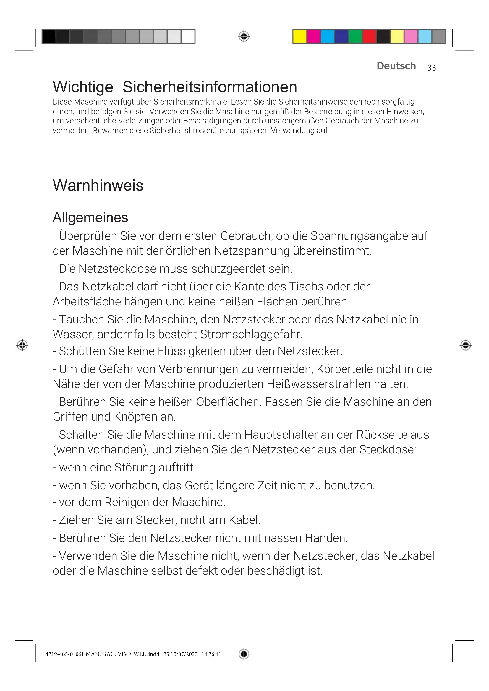 Problem Mulig årsag Afhjælpning Der kommer ikke kae ud af maskinen, eller der løber kun få dråber ud. Grebet til varmt vand/damp er i åbningspositionen (drejet mod urets retning). Drej grebet til varmt vand/damp over på lukkepositionen (drejet i urets retning). Maskinen er kalket til indvendigt. Udfør afkalkningen. Filteret til malet kae eller lteret til kaepod i lterholderen er stoppet til. Rengør lteret til malet kae eller lteret til kaepod. Du har brugt en ikke egnet kaepod. Brug kaepods i papir med den størrelse, der passer til maskinen. Den anvendte kae er for nt malet. Brug kae med en lidt mindre n kværning. Den malede kae i kaelteret, er blevet presset for meget. Sørg for, at kaen i lteret til malet kae ikke presses for meget. Der er for meget malet kae i lteret. Reducér mængden af malet kae i lteret. Kaen løber ud over kanten på lterholderen. Filterholderen er ikke sat korrekt i enheden til brygning af kae. Sæt lterholderen korrekt i. Den øverste kant på lterholderen er ikke ren. Rengør lterholderens øverste kant. Kaepoden er ikke sat korrekt i. Sæt kaepoden korrekt i. Sørg for, at kaepoden ikke rager ud fra lterholderens kant og at den er godt lukket. Der er for meget malet kae i lteret. Reducér mængden af malet kae i lteret ved hjælp af målet. Maskinen slukker, mens der løber kae eller varmt vand ud. Energibesparelsestilstanden er aktiveret. Sæt afbryderkontakten på "I" for at tænde maskinen igen. 4219-465-04061 MAN. GAG. VIVA WEU.indd 32 13/07/2020 14:36:4133 Deutsch Wichtige Sicherheitsinformationen Diese Maschine verfügt über Sicherheitsmerkmale. Lesen Sie die Sicherheitshinweise dennoch sorgfältig durch, und befolgen Sie sie. Verwenden Sie die Maschine nur gemäß der Beschreibung in diesen Hinweisen, um versehentliche Verletzungen oder Beschädigungen durch unsachgemäßen Gebrauch der Maschine zu vermeiden. Bewahren diese Sicherheitsbroschüre zur späteren Verwendung auf. Warnhinweis Allgemeines - Überprüfen Sie vor dem ersten Gebrauch, ob die Spannungsangabe auf der Maschine mit der örtlichen Netzspannung übereinstimmt. - Die Netzsteckdose muss schutzgeerdet sein. - Das Netzkabel darf nicht über die Kante des Tischs oder der Arbeitsäche hängen und keine heißen Flächen berühren. - Tauchen Sie die Maschine, den Netzstecker oder das Netzkabel nie in Wasser, andernfalls besteht Stromschlaggefahr. - Schütten Sie keine Flüssigkeiten über den Netzstecker. - Um die Gefahr von Verbrennungen zu vermeiden, Körperteile nicht in die Nähe der von der Maschine produzierten Heißwasserstrahlen halten. - Berühren Sie keine heißen Oberächen. Fassen Sie die Maschine an den Griffen und Knöpfen an. - Schalten Sie die Maschine mit dem Hauptschalter an der Rückseite aus (wenn vorhanden), und ziehen Sie den Netzstecker aus der Steckdose: - wenn eine Störung auftritt. - wenn Sie vorhaben, das Gerät längere Zeit nicht zu benutzen. - vor dem Reinigen der Maschine. - Ziehen Sie am Stecker, nicht am Kabel. - Berühren Sie den Netzstecker nicht mit nassen Händen. - Verwenden Sie die Maschine nicht, wenn der Netzstecker, das Netzkabel oder die Maschine selbst defekt oder beschädigt ist. 4219-465-04061 MAN. GAG. VIVA WEU.indd 33 13/07/2020 14:36:41Deutsch