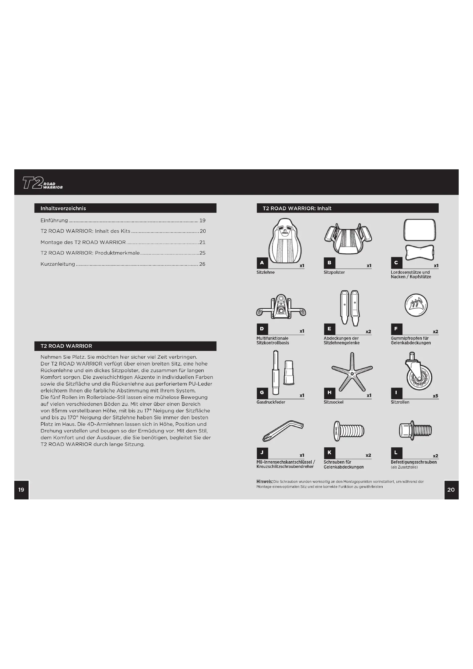 A. Poussez ce levier vers le haut pour incliner le siège vers l’avant ou l’arrière. B. AVERTISSEMENT: N’exercez aucune pression contre le dossier avant d’actionner le levier d’inclinaison. Une variation brusque du poids risque de déstabiliser la chaise, ce qui peut l’endommager et/ou provoquer des blessures corporelles.2019 Inhaltsverzeichnis T2 ROAD WARRIOR: Inhalt TROADWARRIOR Einführung ......................................................................................................... TROADWARRIORInhaltdesKits ....................................................... MontagedesTROADWARRIOR ........................................................... TROADWARRIORProduktmerkmale ................................................ Kurzanleitung ................................................................................................... Nehmen Sie Platz. Sie möchten hier sicher viel Zeit verbringen. Der T2 ROAD WARRIOR verfügt über einen breiten Sitz, eine hohe Rückenlehne und ein dickes Sitzpolster, die zusammen für langen Komfort sorgen. Die zweischichtigen Akzente in individuellen Farben sowie die Sitzfläche und die Rückenlehne aus perforiertem PU-Leder erleichtern Ihnen die farbliche Abstimmung mit Ihrem System. Die fünf Rollen im Rollerblade-Stil lassen eine mühelose Bewegung auf vielen verschiedenen Böden zu. Mit einer über einen Bereich von 85mm verstellbaren Höhe, mit bis zu 17° Neigung der Sitzfläche und bis zu 170° Neigung der Sitzlehne haben Sie immer den besten Platz im Haus. Die 4D-Armlehnen lassen sich in Höhe, Position und Drehung verstellen und beugen so der Ermüdung vor. Mit dem Stil, dem Komfort und der Ausdauer, die Sie benötigen, begleitet Sie der T2 ROAD WARRIOR durch lange Sitzung.