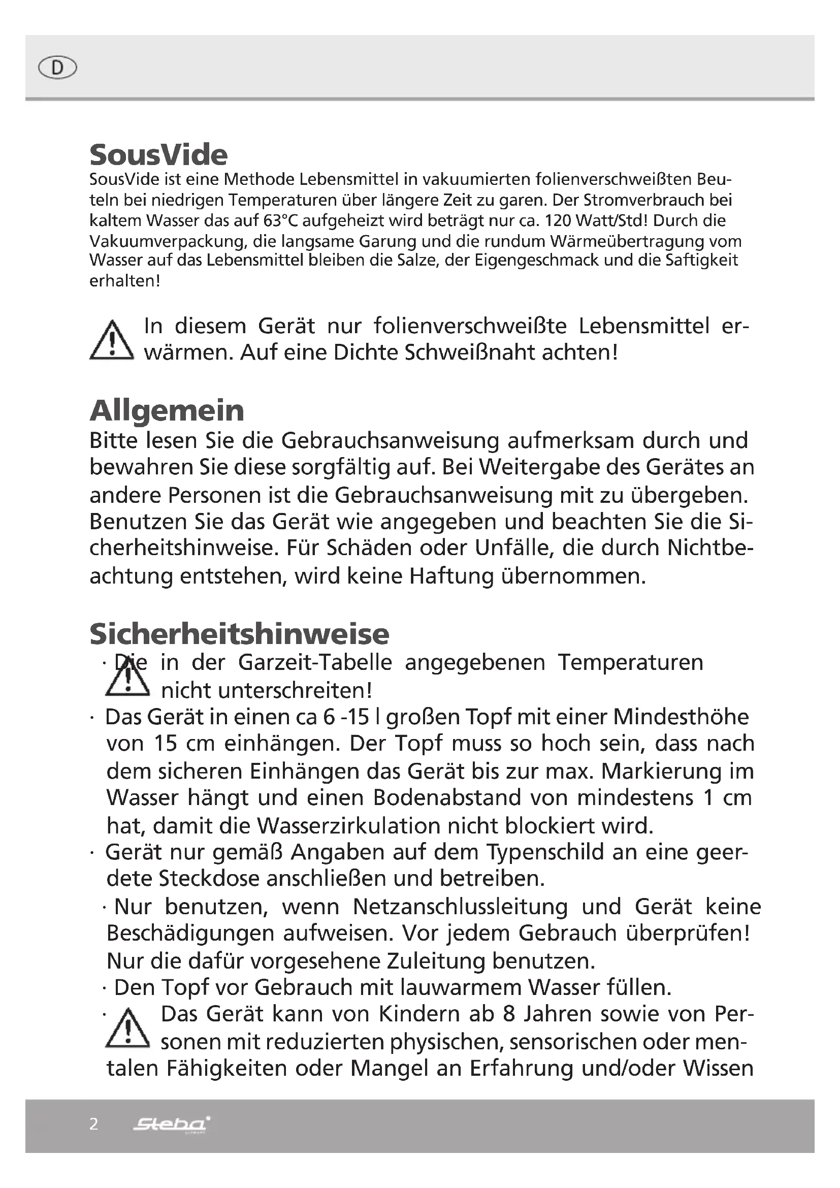 - gewürfelt8 Die in der Garzeit-Tabelle angegebenen Temperaturen nicht unterschreiten! Bitte beachten Sie die Zeitangaben in der Bedienungsanleitung und im Rezeptheft sind empfohlene Mindestzeiten die das Gargut im Gerät verbleiben sollte, wenn das Gerät bereits mit warmen (Leitungs-) Wasser be- füllt ist. Bei Befüllung mit kaltem Wasser, verlängern sich die Zeitangaben um ca. 30 Minuten. Füllen Sie den Sous Vide Garer inkl. des Gargutes immer bis zur Max- Mar- kierung mit Wasser. Dadurch ist es gewährleistet, daß die eingestellte Temperatur im Sous Vide Bereich bis 65°C mit +/- 0,5°C gehalten werden können. Das Gargut kann in beiden Fällen unmittelbar nach dem Füllen in das Wasserbad gegeben werden und kann aufgrund der Sous-Vide Technik, auch deutlich über die angegebenen Mindest- zeiten hinaus, im Wasser verbleiben ohne dass sich die gewünschte Kerntemperatur über die Einstelltemperatur erhöht. Steba Tipp Gibt man mehrere Beutel mit unterschiedlichen Garzeiten und Fleischqualitäten in den Topf, sollt man diese vorher markieren. Man kann das Fleisch bei 62 Grad im Topf lassen und evtl. bei Bedarf entnehmen, ohne dass sich die Fleischstücke verändern. Weiterverarbeitung Haltbarmachung: Nach dem Garen das Fleisch sofort in Eiswasser abkühlen. Danach kann dieses im Kühlschrank mehrere Tage (7°C Kühlschranktemperatur = 5 Tage, 5°C Kühlschranktemperatur = 10 Tage) ohne Qualitätsverlust aufbewahrt oder im Tief- kühlfach eingefroren werden. Zum Auftauen gibt man das vakuumierte Lebensmittel bei ca. 55°C in das Gerät und taut es im Beutel auf. Danach aus dem Beutel nehmen, sofort verzehren oder kurz scharf anbraten. Sofortiges Verzehren: Man kann das Fleisch natürlich auch direkt nach dem SousVide-garen ohne Abkühlung essen oder in einer sehr heißen Pfanne mit etwas Sonnenblumenöl von jeder Seite max. 1 Minute scharf anbraten. Je kürzer gebraten wird umso saftiger bleibt das Fleisch. Es besteht auch die Möglichkeit das Fleisch mit Öl einzupinseln und mit einem Butangasbrenner abzuflämmen. Bevor das Fleisch angeschnitten wird lässt man es ca. 2 Minuten entspannen. Rückwärts-Garen: Indem man das rohe Fleisch kurz anbrät und bereits gewürzt vakuumiert ist das Fleisch nach dem SousVide-Garen bereits komplett verzehrfertig. Desweiteren kann man einen gewürzten Rotwein-Balsamico-Fond zubereiten, das Fleisch zugeben, vacuumieren und SousVide-Garen.9 Korrekte Entsorgung dieses Produkts: Ausgediente Geräte sofort unbrauchbar machen. Innerhalb der EU weist dieses Symbol darauf hin, dass dieses Produkt nicht über den Hausmüll entsorgt werden darf. Altgeräte enthalten wertvolle recyclingfähige Materialien, die einer Wiederverwertung zugeführt werden sollten und um der Umwelt bzw. der menschlichen Gesundheit nicht durch unkontrollierte Müllbeseitigung zu schaden. Bitte entsorgen Sie Altgeräte deshalb über geeignete Sammelsysteme oder senden Sie das Gerät zur Entsorgung an die Stelle, bei der Sie es gekauft haben. Diese wird dann das Gerät der stofflichen Verwertung zuführen. Verpackungs-Entsorgung Verpackungsmaterial nicht einfach wegwerfen, sondern der Wiederverwertung zuführen. Papier-, Pappe- und Wellpappeverpackungen bei Altpapiersammelstellen abgeben. Kunststoffverpackungsteile und Folien sollten ebenfalls in die dafür vorge- sehenen Sammelbehälter gegeben werden In den Beispielen für die Kunststoffkennzeichnung steht: PE für Polyethylen, die Kennziffer 02 für PE-HD, 04 für PE-LD, PP für Polypropylen, PS für Polystyrol. Kundenservice: Sollte Ihr Gerät wider Erwarten einmal den Kundendienst benötigen, wenden Sie sich bitte an nachfolgende Anschrift. Wir werden dann im Garantiefall die Abholung veranlassen. Das Gerät muss transportfähig verpackt sein. Unfreie Pakete können nicht angenommen werden! STEBA Elektrogeräte GmbH & Co KG Pointstr. 2, 96129 Strullendorf / Germany Vertrieb-Tel.: 09543 / 449-17 / -18, Service-Tel.: 09543 / 449-44, Fax: 09543 / 449-19 E-Mail: elektro@steba.com Internet: http://www.steba.com Achtung! Elektrogeräte dürfen nur durch Elektro-Fachkräfte repariert werden, da durch unsachgemäße Reparaturen erhebliche Folgeschäden entstehen können.1011 SousVide SousVide is a way of slow-cooking vacuum-packed food at low temperatures over a long period. The current consumption with cold water, which is heated to 63°C is 120 watts/hour! The vacuum packing, the long cooking time and the transfer of heat from the water to the food from all directions retains its vitamins, natural flavour and succulence! Only vacuum-sealed food can be warmed in this device. Pay attention to a thick weld. Generally Please read the instruction manual carefully and keep it at a safe place. When the appliance is given to another person the instruc- tion manual should be passed to that person, too. Only use the appliance as described in the instruction manual and pay atten- tion to the safety information. No liability for damages or acci- dents will be accepted, which are caused by not paying attention to the instruction manual. Safety information ∙ Do not let the temperatures fall lower than indicated in the table! ∙ Hang the sous-Vide cooker in a pot with a capacity of 6-15L and a minimum height of 15cm. The pot must be as high that the device hangs into the water up till the marking “max” and a distance of at least 1 cm to the ground is kept not to block the water circulation. ∙ Connect the appliance to an earded wall socket and operate it only in accordance with the specifications on the rating plate. ∙ Do not use if the cord or appliance is damaged. Always check before using the appliance! ∙ Please fill the appliance with warm water before use.