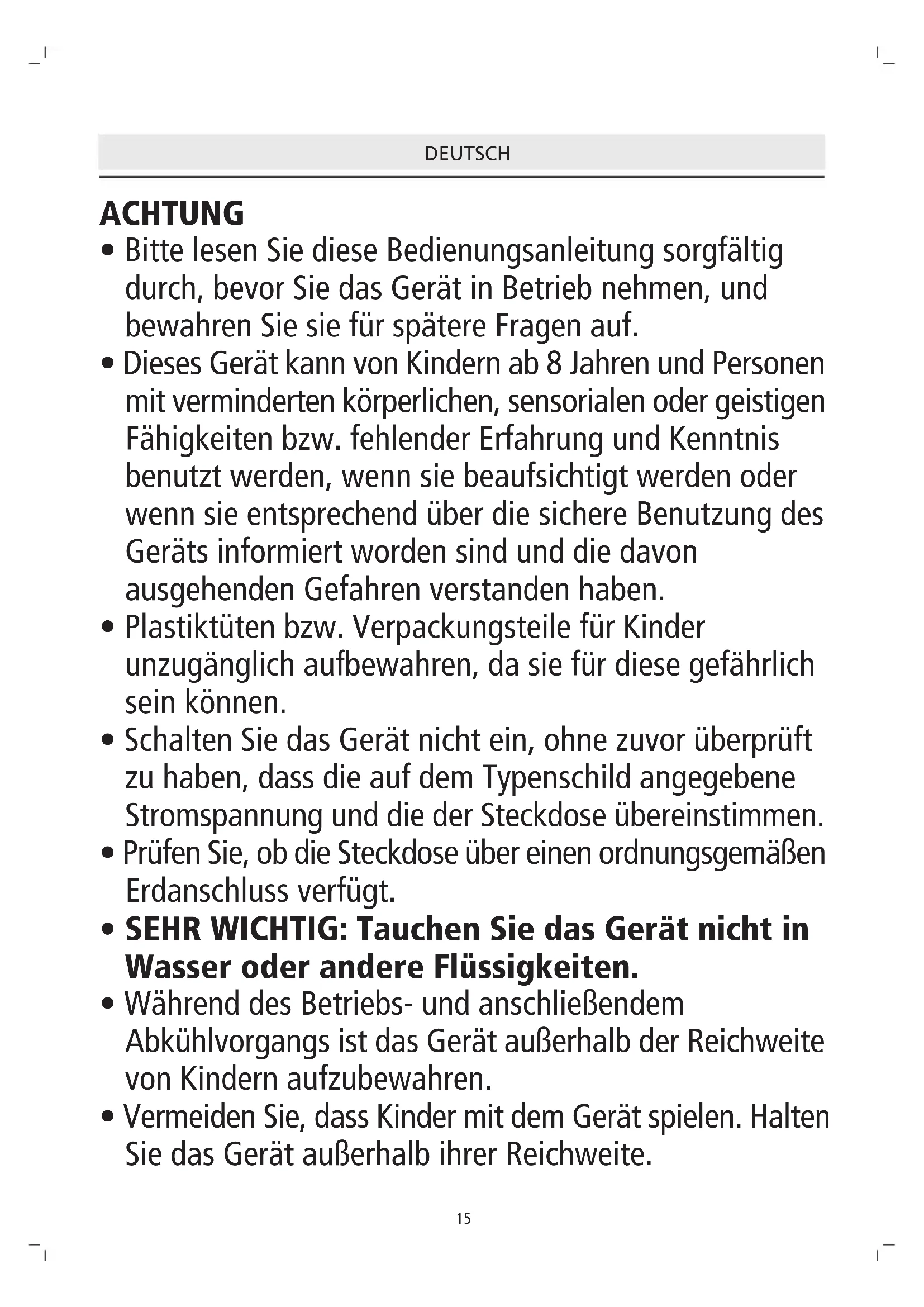 - Während des Betriebs- und anschließendem Abkühlvorgangs ist das Gerät außerhalb der Reichweite von Kindern aufzubewahren.