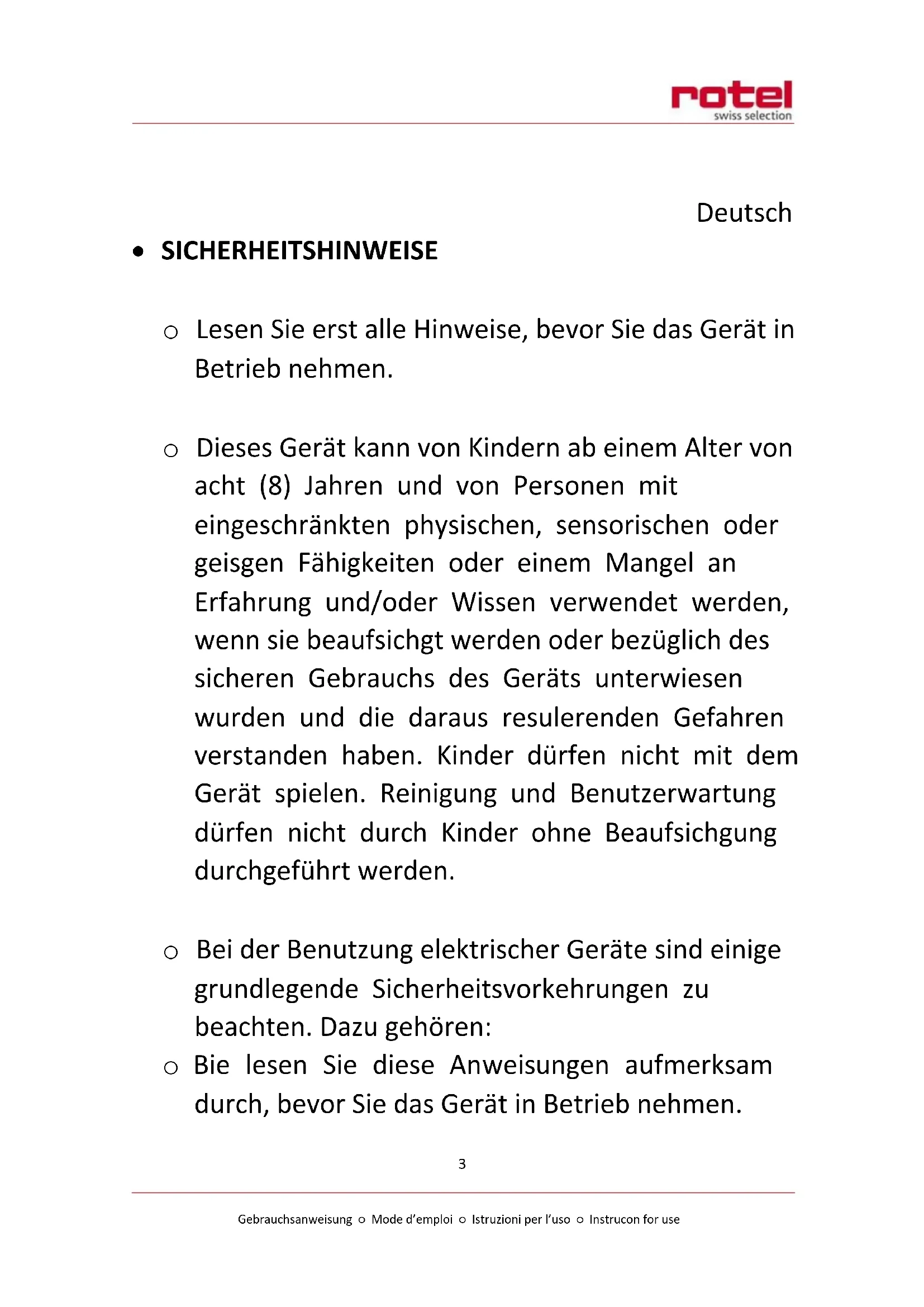 Dieses Gerätarf nicht von Personen (Kinder eingeschlossen) mit eingeschränkten physischen, sensorischen oder geisgen Fähigkeiten bzw. einem Mangel an Erfahrung oder Kenntnissen verwendet werden, es sei dess, sie werden von einer für ihre Sicherheit verantwortlichen Person beaufsichtgt oder sie wurden von dieser in die Verwendung des Geräts eingewiesen.