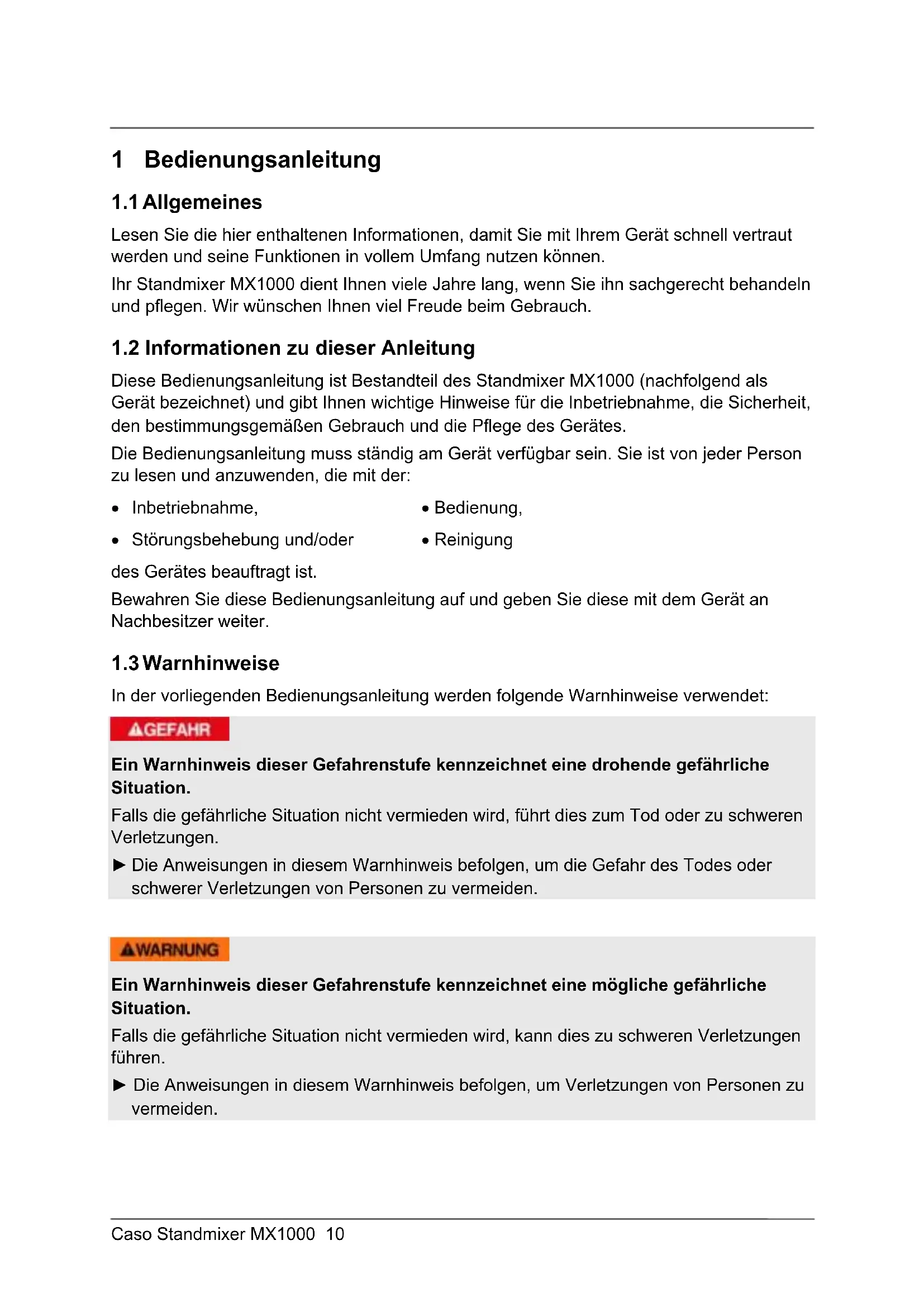 Ein Warnhinweis dieser Gefahrenstufe kennzeichnet eine mögliche gefährliche Situation. Falls die gefährliche Situation nicht vermieden wird, kann dies zu schweren Verletzungen führen. ► Die Anweisungen in diesem Warnhinweis befolgen, um Verletzungen von Personen zu vermeiden.Caso Standmixer MX1000 11