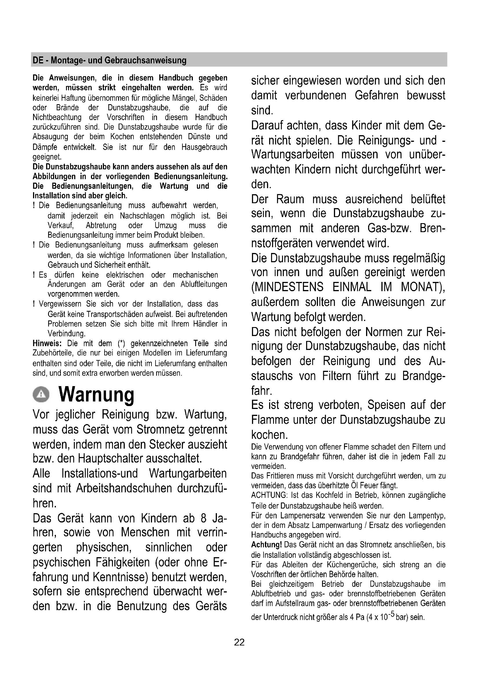 - Connection with SNAP® (when installed). Calibration of the hood: Hold down the button T1 (approximately 10 seconds), the LED L1 flashes to indicate that calibration has begun, the calibration process will last about 5 minutes. Selecting the type of hob (gas - induction or electric) Hold down the button T2 (about 10 sec), all the LEDs start flashing for 5 sec. Within this period press T1 to select the hob that you own: Orange LED: gas hob. Blue LED: induction hob. White LED: electric hob Wait 5 sec. to allow the hood to record the selection made and until all LEDs go out. Connection with SNAP® (when installed). The connection between the hood and SNAP® is automatic – no settings are required. Maintenance Cleaning Clean using ONLY the cloth dampened with neutral liquid detergent. DO NOT CLEAN WITH TOOLS OR INSTRUMENTS. Do not use abrasive products. DO NOT USE ALCOHOL! Panel Fig. 9-11-12-13 Maintenance of the panel Disassembly: a. pull the panel (FRONT SIDE) downwards energetically b. unhook it from the back hinges. Cleaning: the suction panel must be cleaned as frequently as the grease filter, use a dampened cloth with neutral liquid detergents. Avoid using products containing abrasives. DO NOT USE ALCOHOL! Assembly: The panel must be hooked in the back and fixed in the front (with magnets). Attention! always check that the panel is tightly fixed to its place. Grease filter Fig. 9-12 Traps cooking grease particles. The grease filter must be cleaned once a month using non aggressive detergents, either by hand or in the dishwasher, which must be set to a low temperature and a short cycle. When washed in a dishwasher, the grease filter may discolour slightly, but this does not affect its filtering capacity. To remove the grease filter, pull the spring release handle. Charcoal filter (filter version only) Fig. 10 It absorbs unpleasant odours caused by cooking. The saturation of the charcoal filter occurs after more or less prolonged use, depending on the type of cooking and the regularity of cleaning of the grease filter. In any case it is necessary to replace the cartridge at least every four months. The charcoal filter may NOT be washed or regenerated. Circular carbon filter Apply one on each side as cover to both the shield grids of the motor impeller, then turn clockwise. For the disassembly, turn counter-clockwise. Replacing lamps The hood is equipped with a lighting system based on LED technology. The LEDs guarantee an optimum lighting, a duration up to 10 times as long as the traditional lamps and allow to save 90% electrical energy. For replacement, contact the technical service.22 DE - Montage- und Gebrauchsanweisung Die Anweisungen, die in diesem Handbuch gegeben werden, müssen strikt eingehalten werden. Es wird keinerlei Haftung übernommen für mögliche Mängel, Schäden oder Brände der Dunstabzugshaube, die auf die Nichtbeachtung der Vorschriften in diesem Handbuch zurückzuführen sind. Die Dunstabzugshaube wurde für die Absaugung der beim Kochen entstehenden Dünste und Dämpfe entwickelt. Sie ist nur für den Hausgebrauch geeignet. Die Dunstabzugshaube kann anders aussehen als auf den Abbildungen in der vorliegenden Bedienungsanleitung. Die Bedienungsanleitungen, die Wartung und die Installation sind aber gleich. ! Die Bedienungsanleitung muss aufbewahrt werden, damit jederzeit ein Nachschlagen möglich ist. Bei Verkauf, Abtretung oder Umzug muss die Bedienungsanleitung immer beim Produkt bleiben. ! Die Bedienungsanleitung muss aufmerksam gelesen werden, da sie wichtige Informationen über Installation, Gebrauch und Sicherheit enthält. ! Es dürfen keine elektrischen oder mechanischen Änderungen am Gerät oder an den Abluftleitungen vorgenommen werden. ! Vergewissern Sie sich vor der Installation, dass das Gerät keine Transportschäden aufweist. Bei auftretenden Problemen setzen Sie sich bitte mit Ihrem Händler in Verbindung. Hinweis: Die mit dem (*) gekennzeichneten Teile sind Zubehörteile, die nur bei einigen Modellen im Lieferumfang enthalten sind oder Teile, die nicht im Lieferumfang enthalten sind, und somit extra erworben werden müssen. Warnung Vor jeglicher Reinigung bzw. Wartung, muss das Gerät vom Stromnetz getrennt werden, indem man den Stecker auszieht bzw. den Hauptschalter ausschaltet. Alle Installations-und Wartungarbeiten sind mit Arbeitshandschuhen durchzufü- hren. Das Gerät kann von Kindern ab 8 Ja- hren, sowie von Menschen mit verrin- gerten physischen, sinnlichen oder psychischen Fähigkeiten (oder ohne Er- fahrung und Kenntnisse) benutzt werden, sofern sie entsprechend überwacht wer- den bzw. in die Benutzung des Geräts sicher eingewiesen worden und sich den damit verbundenen Gefahren bewusst sind. Darauf achten, dass Kinder mit dem Ge- rät nicht spielen. Die Reinigungs- und - Wartungsarbeiten müssen von unüber- wachten Kindern nicht durchgeführt wer- den. Der Raum muss ausreichend belüftet sein, wenn die Dunstabzugshaube zu- sammen mit anderen Gas-bzw. Bren- nstoffgeräten verwendet wird. Die Dunstabzugshaube muss regelmäßig von innen und außen gereinigt werden (MINDESTENS EINMAL IM MONAT), außerdem sollten die Anweisungen zur Wartung befolgt werden. Das nicht befolgen der Normen zur Rei- nigung der Dunstabzugshaube, das nicht befolgen der Reinigung und des Au- stauschs von Filtern führt zu Brandge- fahr. Es ist streng verboten, Speisen auf der Flamme unter der Dunstabzugshaube zu kochen. Die Verwendung von offener Flamme schadet den Filtern und kann zu Brandgefahr führen, daher ist die in jedem Fall zu vermeiden. Das Frittieren muss mit Vorsicht durchgeführt werden, um zu vermeiden, dass das überhitzte Öl Feuer fängt. ACHTUNG: Ist das Kochfeld in Betrieb, können zugängliche Teile der Dunstabzugshaube heiß werden. Für den Lampenersatz verwenden Sie nur den Lampentyp, der in dem Absatz Lampenwartung / Ersatz des vorliegenden Handbuchs angegeben wird. Achtung! Das Gerät nicht an das Stromnetz anschließen, bis die Ins
