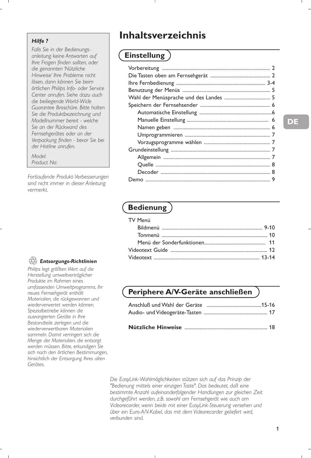 - Hilfe ? Falls Sie in der Bedienungsanleitung keine Antworten auf Ihre Fragen finden sollten, oder die genannten ‘Nützliche Hinweise’ Ihre Probleme nicht lösen, dann können Sie beim örtlichen Philips Info- oder Service Center anrufen. Siehe dazu auch die beiliegende World-Wide Guarantee Broschüre. Bitte halten Sie die Produktbezeichnung und Modellnummer bereit - welche Sie an der Rückwand des Fernsehgerätes oder an der Verpackung finden - bevor Sie bei der Hotline anrufen. Model: Product No: Fortlaufende Produkt-Verbesserungen sind nicht immer in dieser Anleitung vermerkt. Inhaltsverzeichnis Einstellung Vorbereitung p. 2