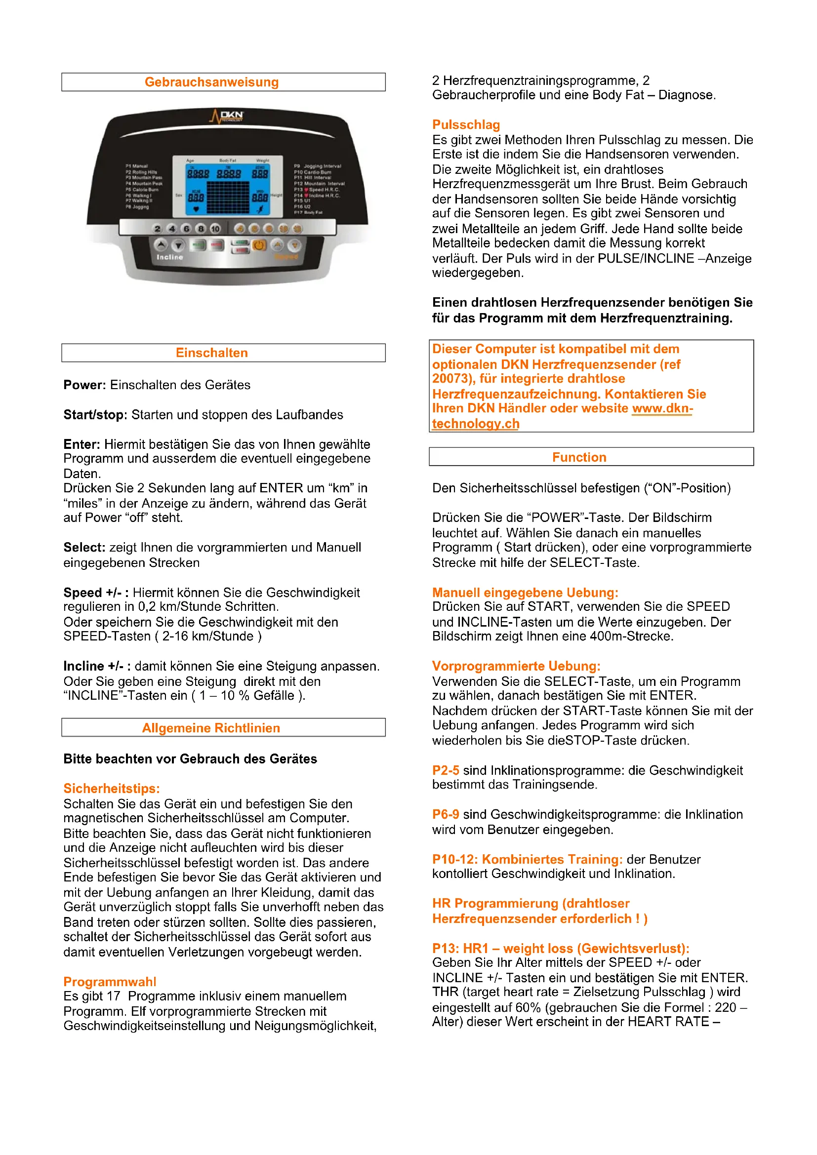 Dieser Computer ist kompatibel mit dem optionalen DKN Herzfrequenzsender (ref 20073), für integrierte drahtlose Herzfrequenzaufzeichnung. Kontaktieren Sie ihren DKN Handler oder website www.dkn-technology.ch