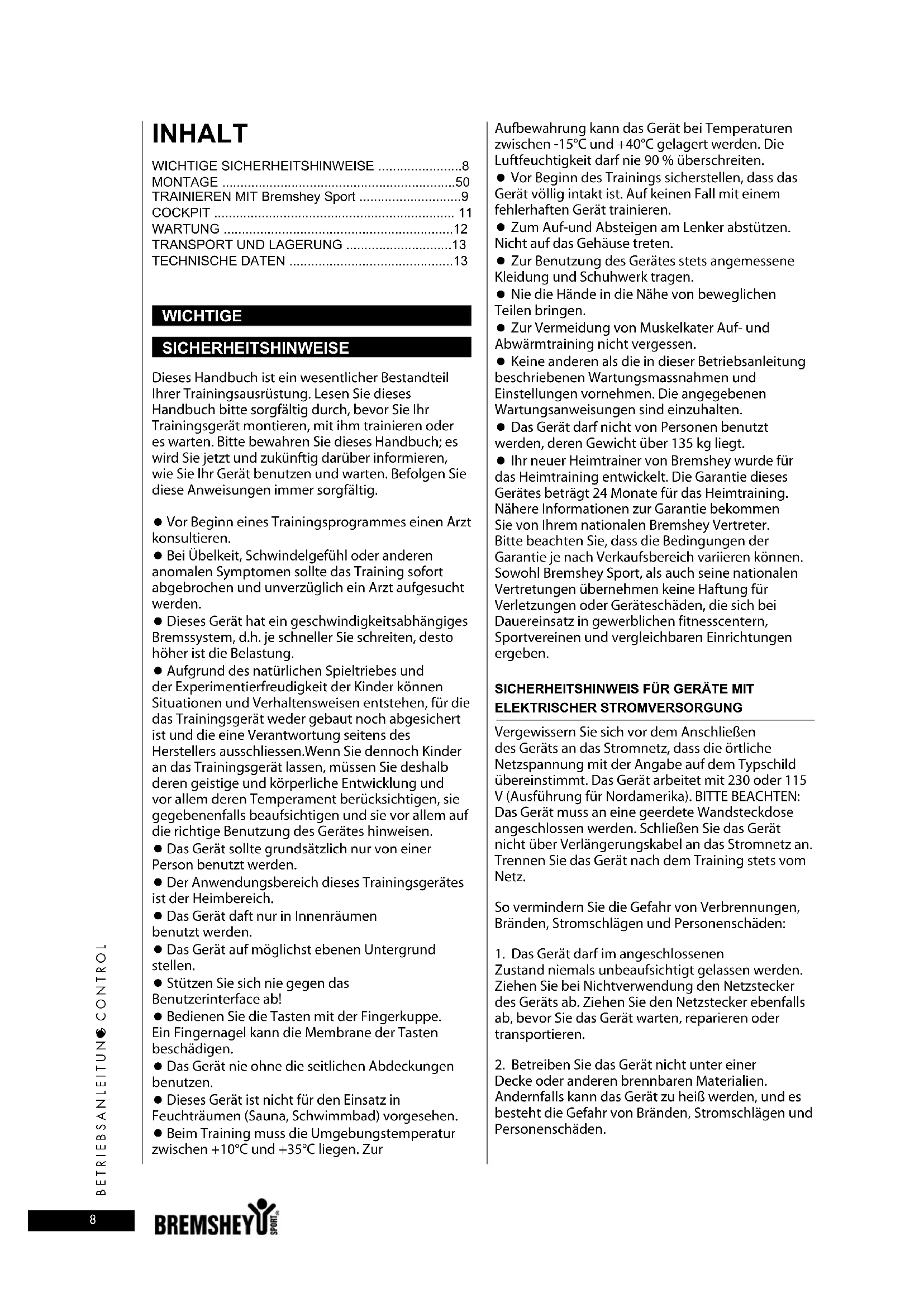 Das Gerat darf nicht von Personen benutzt werden, deren Gewicht über 135kg liegt. - Ihr neuer Heimtrainer von Bremshey wurde für das Heimtraining entwickelt. Die Garantie dieser Gerätes beträgt 24 Monate für das Heimtraining. Nähere Informationen zur Garantie besteht. Sie von Ihrem nationalen Bremshey Vertreter.itte beachten Sie, dass die Bedingungen der Garantie je nach Verkaufsbereich variieren können. Sowohl Bremshey Sport, als auch seine nationalen Vertretungen übernehmen keine Haftung fur Verletzungen oder Geräteschäden, die sich bei Dauereinsatz in gewerblichen fitnesscentern, Sportvereinen und vergleichbaren Einrichtungen ergeben.