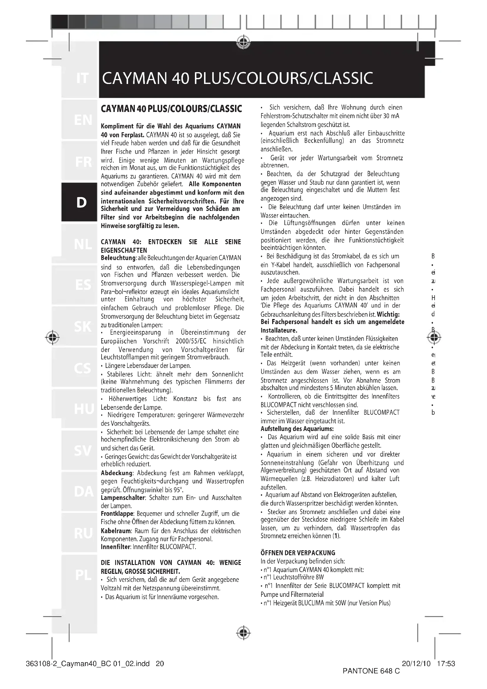 Kompliment für die Wahl des Aquariums CAYMAN 40 von Ferplast. CAYMAN 40 ist so ausgelegt, daß Sie viel Freude haben werden und daß für die Gesundheit ihrer Fische und Pflanzen in jeder Hinsicht gesorgrt wird. Einige weniger Minuten an Wartungspflege reichen im Monat aus, um die Funktionstüchtigkeit des Aquariums zu garantieren. CAYMAN 40 wird mit dem notwendigen Zubehör gefleiert. Alle Komponenten sind aufeinander abgestimmt und konform mit den internationalen Sicherheitsvorschriften. Für ihre Sicherheit und zur Vermeidung von Schäden am Filter sind vor Arbeitsbeginn die nachfolgenden Hinweise sorgfältig zulesen.