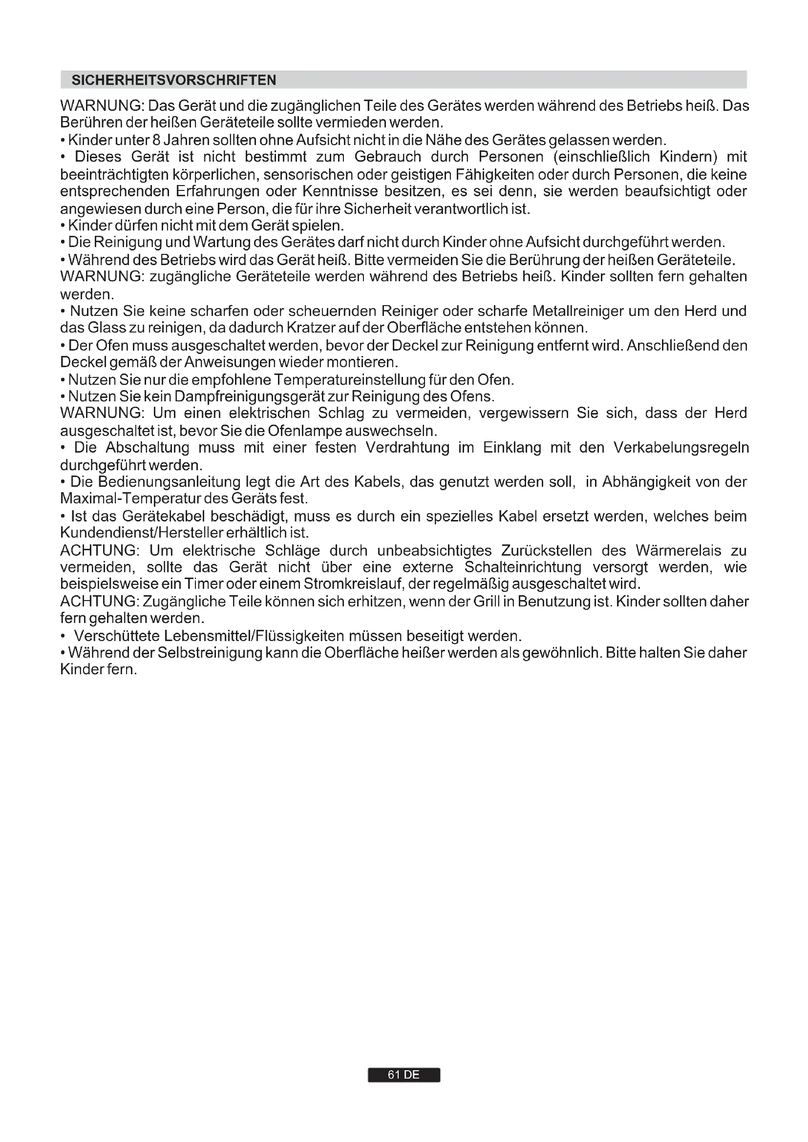 - Die Reinigung und Wartung des Gerätes darf nicht durch Kinder ohne Aufsicht durchgeführt werden.