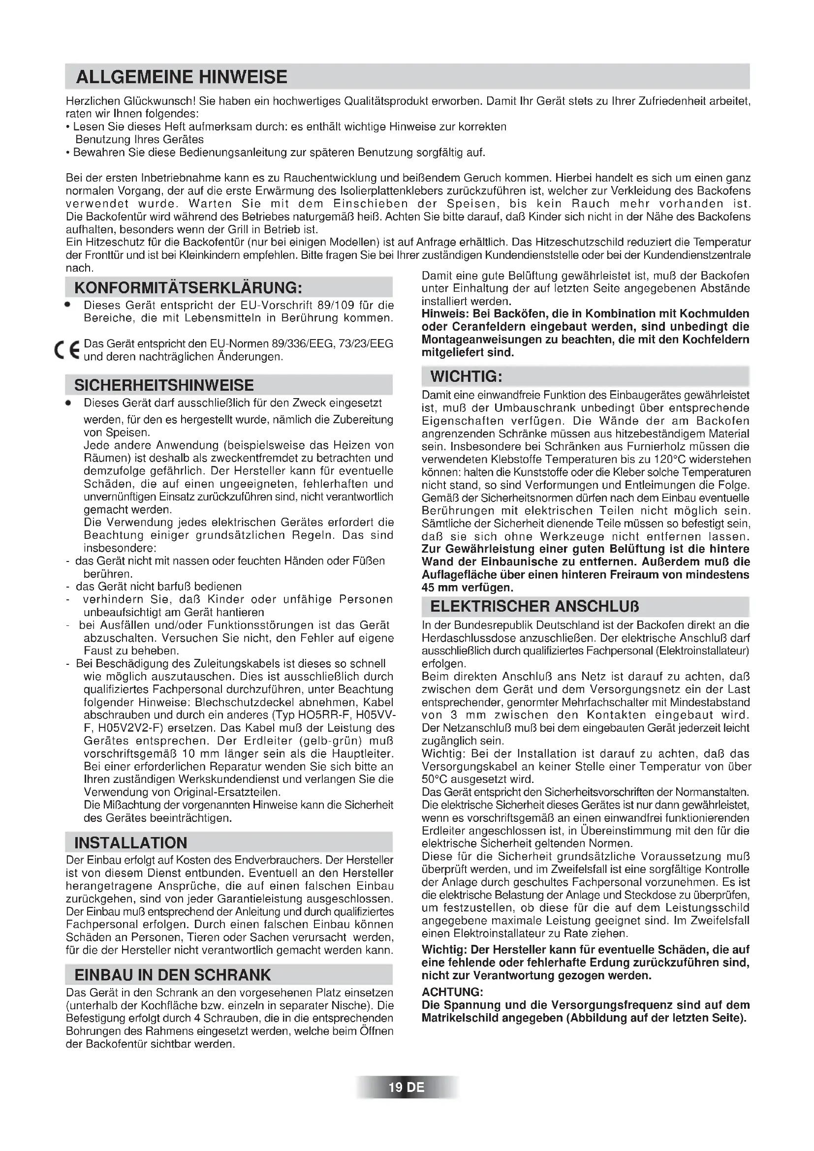 - Bewahren Sie diese Bedienungsanleitung zur späteren Benutzung sorgfältig auf. Bei der ersten Inbetriebnahme kann es zu Rauchentwicklung und beißendem Geruch kommen. Hierbei handelt es sich um einen ganz normalen Vorgang, der auf die erste Erwärmung des Isolierplattenklebers zurückzuführen ist, welcher zur Verkleidung des Backofens verwendet wurde. Warten Sie mit dem Einschieben der Speisen, bis kein Rauch mehr vorhanden ist. Die Backofentür wird während des Betriebes naturgemäß heiß. Achten Sie bitte darauf, daß Kinder sich nicht in der Nähe des Backofens aufhalten, besonders wenn der Grill in Betrieb ist. Ein Hitzeschutz für die Backofentür (nur bei einigen Modellen) ist auf Anfrage erhältlich. Das Hitzeschutzschild reduziert die Temperatur der Fronttür und ist bei Kleinkindern empfehlen. Bitte fragen Sie bei Ihrer zuständigen Kundendienststelle oder bei der Kundendienstzentrale nach. ALLGEMEINE HINWEISE KONFORMITÄTSERKLÄRUNG: Dieses Gerät entspricht der EU-Vorschrift 89/109 für die Bereiche, die mit Lebensmitteln in Berührung kommen. Das Gerät entspricht den EU-Normen 89/336/EEG, 73/23/EEG und deren nachträglichen Änderungen. SICHERHEITSHINWEISE Dieses Gerät darf ausschließlich für den Zweck eingesetzt werden, für den es hergestellt wurde, nämlich die Zubereitung von Speisen. Jede andere Anwendung (beispielsweise das Heizen von Räumen) ist deshalb als zweckentfremdet zu betrachten und demzufolge gefährlich. Der Hersteller kann für eventuelle Schäden, die auf einen ungeeigneten, fehlerhaften und unvernünftigen Einsatz zurückzuführen sind, nicht verantwortlich gemacht werden. Die Verwendung jedes elektrischen Gerätes erfordert die Beachtung einiger grundsätzlichen Regeln. Das sind insbesondere: - das Gerät nicht mit nassen oder feuchten Händen oder Füßen berühren. - das Gerät nicht barfuß bedienen - verhindern Sie, daß Kinder oder unfähige Personen unbeaufsichtigt am Gerät hantieren - bei Ausfällen und/oder Funktionsstörungen ist das Gerät abzuschalten. Versuchen Sie nicht, den Fehler auf eigene Faust zu beheben. - Bei Beschädigung des Zuleitungskabels ist dieses so schnell wie möglich auszutauschen. Dies ist ausschließlich durch qualifiziertes Fachpersonal durchzuführen, unter Beachtung folgender Hinweise: Blechschutzdeckel abnehmen, Kabel abschrauben und durch ein anderes (Typ HO5RR-F, H05VV- F, H05V2V2-F) ersetzen. Das Kabel muß der Leistung des Gerätes entsprechen. Der Erdleiter (gelb-grün) muß vorschriftsgemäß 10 mm länger sein als die Hauptleiter. Bei einer erforderlichen Reparatur wenden Sie sich bitte an Ihren zuständigen Werkskundendienst und verlangen Sie die Verwendung von Original-Ersatzteilen. Die Mißachtung der vorgenannten Hinweise kann die Sicherheit des Gerätes beeinträchtigen. INSTALLATION Der Einbau erfolgt auf Kosten des Endverbrauchers. Der Hersteller ist von diesem Dienst entbunden. Eventuell an den Hersteller herangetragene Ansprüche, die auf einen falschen Einbau zurückgehen, sind von jeder Garantieleistung ausgeschlossen. Der Einbau muß entsprechend der Anleitung und durch qualifiziertes Fachpersonal erfolgen. Durch einen falschen Einbau können Schäden an Personen, Tieren oder Sachen verursacht werden, für die der Hersteller nicht verantwortlich gemacht werden kann.