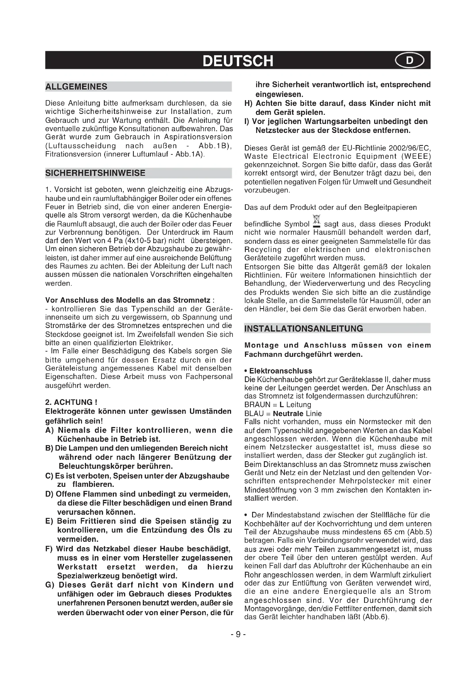 Netzstecker aus der Steckdose entfernen. Dieses Gerät ist gemäß der EU-Richtlinie 2002/96/EC, Waste Electrical Electronic Equipment (WEEE) gekennzeichnet. Sorgen Sie bitte dafür, dass das Gerät korrekt entsorgt wird, der Benutzer trägt dazu bei, den potentiellen negativen Folgen für Umwelt und Gesundheit vorzubeugen. Das auf dem Produkt oder auf den Begleitpapieren befindliche Symbol sagt aus, dass dieses Produkt nicht wie normaler Hausmüll behandelt werden darf, sondern dass es einer geeigneten Sammelstelle für das Recycling der elektrischen und elektronischen Geräteteile zugeführt werden muss. Entsorgen Sie bitte das Altgerät gemäß der lokalen Richtlinien. Für weitere Informationen hinsichtlich der Behandlung, der Wiederverwertung und des Recycling des Produkts wenden Sie sich bitte an die zuständige lokale Stelle, an die Sammelstelle für Hausmüll, oder an den Händler, bei dem Sie das Gerät erworben haben. INSTALLATIONSANLEITUNG Montage und Anschluss müssen von einem Fachmann durchgeführt werden.