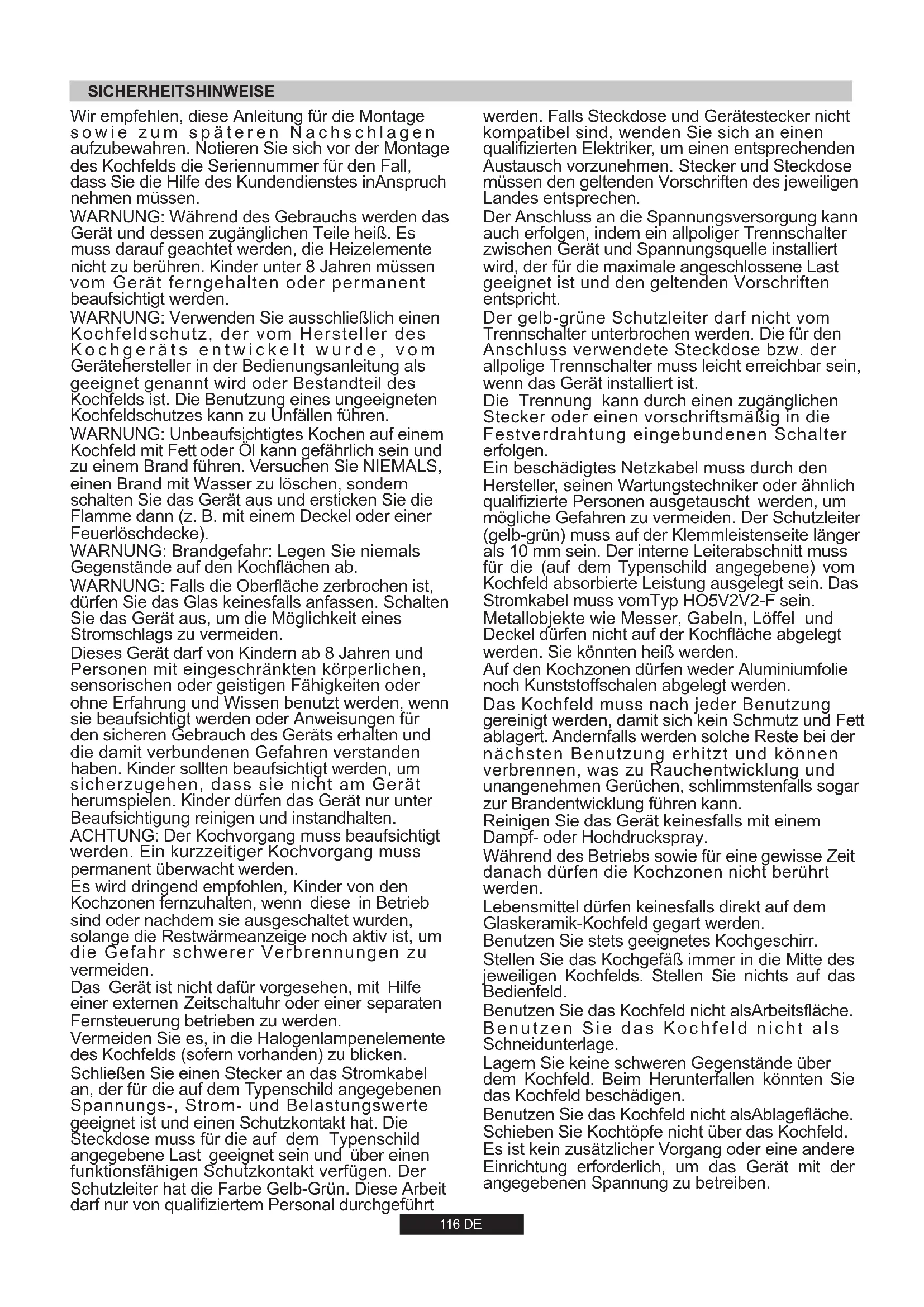 Als deze fout is opgetreden, koppel de kookplaat dan los van de netvoeding en sluit hem weer aan. Als de fout aanhoudt, bel dan de klantenservice. Als de fout plotseling verschijnt tijdens normaal gebruik, bel dan de klantenservice. Softwarefout aanraakbediening. Wacht tot de temperatuur gedaald is. De kookplaat gaat automatisch verder als de temperatuur een normale waarde heeft bereikt. De zone van de aanraakbediening is te heet, waardoor alle kookzones zijn uitgeschakeld. Wacht tot de temperatuur gedaald is. Als de foutmelding aanhoudt wanneer de temperatuur gedaald is tot omgevingstemperatuur, bel dan de klantenservice. Wacht tot de temperatuur gedaald is. Als de foutmelding aanhoudt wanneer de temperatuur gedaald is tot omgevingstemperatuur, bel dan de klantenservice. De temperatuursensor van de aanraakbediening kan beschadigd zijn. Controleer of de kookplaat correct gemonteerd is. Zorg ervoor dat de toetsen het glazen oppervlak goed raken Overmatige gevoeligheid van een toets. Deze fout is een automatische controle van het toetsenblok. De fout verdwijnt als de automatisch controle is teruggekeerd naar een veilige waarde.Als de fout aanhoudt, bel dan de klantenservice. Fout toetsenblokbeveiliging Deze fout is een automatische controle van de software. De fout verdwijnt als de automatisch controle is teruggekeerd naar een veilige waarde.Als de fout aanhoudt, bel dan de klantenservice. Fout toetsenblokbeveiliging Deze fout is een automatische controle van de software. De fout verdwijnt als de automatisch controle is teruggekeerd naar een veilige waarde.Als de fout aanhoudt, bel dan de klantenservice. Fout toetsenblokbeveiliging Er kan een probleem zijn in een relaisbesturing. Koppel de kookplaat los van de netvoeding, wacht een minuut en sluit de kookplaat weer aan.Als de fout aanhoudt, bel dan de klantenservice. Fout beveiligingsrelais Storing Maatregel Display kookzones De temperatuursensor van de aanraakbediening kan beschadigd zijn. 115 NLWir empfehlen, diese Anleitung für die Montage sowie zum späteren Nachschlagen aufzubewahren. Notieren Sie sich vor der Montage des Kochfelds die Seriennummer für den Fall, dass Sie die Hilfe des Kundendienstes inAnspruch nehmen müssen. WARNUNG: Während des Gebrauchs werden das Gerät und dessen zugänglichen Teile heiß. Es muss darauf geachtet werden, die Heizelemente nicht zu berühren. Kinder unter 8 Jahren müssen vom Gerät ferngehalten oder permanent beaufsichtigt werden. WARNUNG: Verwenden Sie ausschließlich einen Kochfeldschutz, der vom Hersteller des Kochgeräts entwickelt wurde, vom Gerätehersteller in der Bedienungsanleitung als geeignet genannt wird oder Bestandteil des Kochfelds ist. Die Benutzung eines ungeeigneten Kochfeldschutzes kann zu Unfällen führen. WARNUNG: Unbeaufsichtigtes Kochen auf einem Kochfeld mit Fett oder Öl kann gefährlich sein und zu einem Brand führen. Versuchen Sie NIEMALS, einen Brand mit Wasser zu löschen, sondern schalten Sie das Gerät aus und ersticken Sie die Flamme dann (z. B. mit einem Deckel oder einer Feuerlöschdecke). WARNUNG: Brandgefahr: Legen Sie niemals Gegenstände auf den Kochflächen ab. WARNUNG: Falls die Oberfläche zerbrochen ist, dürfen Sie das Glas keinesfalls anfassen. Schalten Sie das Gerät aus, um die Möglichkeit eines Stromschlags zu vermeiden. Dieses Gerät darf von Kindern ab 8 Jahren und Personen mit eingeschränkten körperlichen, sensorischen oder geistigen Fähigkeiten oder ohne Erfahrung und Wissen benutzt werden, wenn sie beaufsichtigt werden oder Anweisungen für den sicheren Gebrauch des Geräts erhalten und die damit verbundenen Gefahren verstanden haben. Kinder sollten beaufsichtigt werden, um sicherzugehen, dass sie nicht am Gerät herumspielen. Kinder dürfen das Gerät nur unter Beaufsichtigung reinigen und instandhalten. ACHTUNG: Der Kochvorgang muss beaufsichtigt werden. Ein kurzzeitiger Kochvorgang muss permanent überwacht werden. Es wird dringend empfohlen, Kinder von den Kochzonen fernzuhalten, wenn diese in Betrieb sind oder nachdem sie ausgeschaltet wurden, solange die Restwärmeanzeige noch aktiv ist, um die Gefahr schwerer Verbrennungen zu vermeiden. Das Gerät ist nicht dafür vorgesehen, mit Hilfe einer externen Zeitschaltuhr oder einer separaten Fernsteuerung betrieben zu werden. Vermeiden Sie es, in die Halogenlampenelemente des Kochfelds (sofern vorhanden) zu blicken. Schließen Sie einen Stecker an das Stromkabel an, der für die auf dem Typenschild angegebenen Spannungs-, Strom- und Belastungswerte geeignet ist und einen Schutzkontakt hat. Die Steckdose muss für die auf dem Typenschild angegebene Last geeignet sein und über einen funktionsfähigen Schutzkontakt verfügen. Der Schutzleiter hat die Farbe Gelb-Grün. Diese Arbeit darf nur von qualifiziertem Personal durchgeführt SICHERHEITSHINWEISE 116 DE werden. Falls Steckdose und Gerätestecker nicht kompatibel sind, wenden Sie sich an einen qualifizierten Elektriker, um einen entsprechenden Austausch vorzunehmen. Stecker und Steckdose müssen den geltenden Vorschriften des jeweiligen Landes entsprechen. Der Anschluss an die Spannungsversorgung kann auch erfolgen, indem ein allpoliger Trennschalter zwischen Gerät und Spannungsquelle installiert wird, der für die maximale angeschlossene Last geeignet ist und den geltenden Vorschriften entspricht. Der gelb-grüne Schutzleiter darf nicht vom Trennschalter unterbrochen werden. Die für den Anschluss verwendete Steckdose bzw. der allpolige Trennschalter muss leicht erreichbar sein, wenn das Gerät installiert ist. Die Trennung kann durch einen zugänglichen Stecker oder einen vorschriftsmäßig in die Festverdrahtung eingebundenen Schalter erfolgen. Ein beschädigtes Netzkabel muss durch den Hersteller, seinen Wartungstechniker oder ähnlich qualifizierte Personen ausgetauscht werden, um mögliche Gefahren zu vermeiden. Der Schutzleiter (gelb-grün) muss auf der Klemmleistenseite länger als 10 mm sein. Der interne Leiterabschnitt muss f