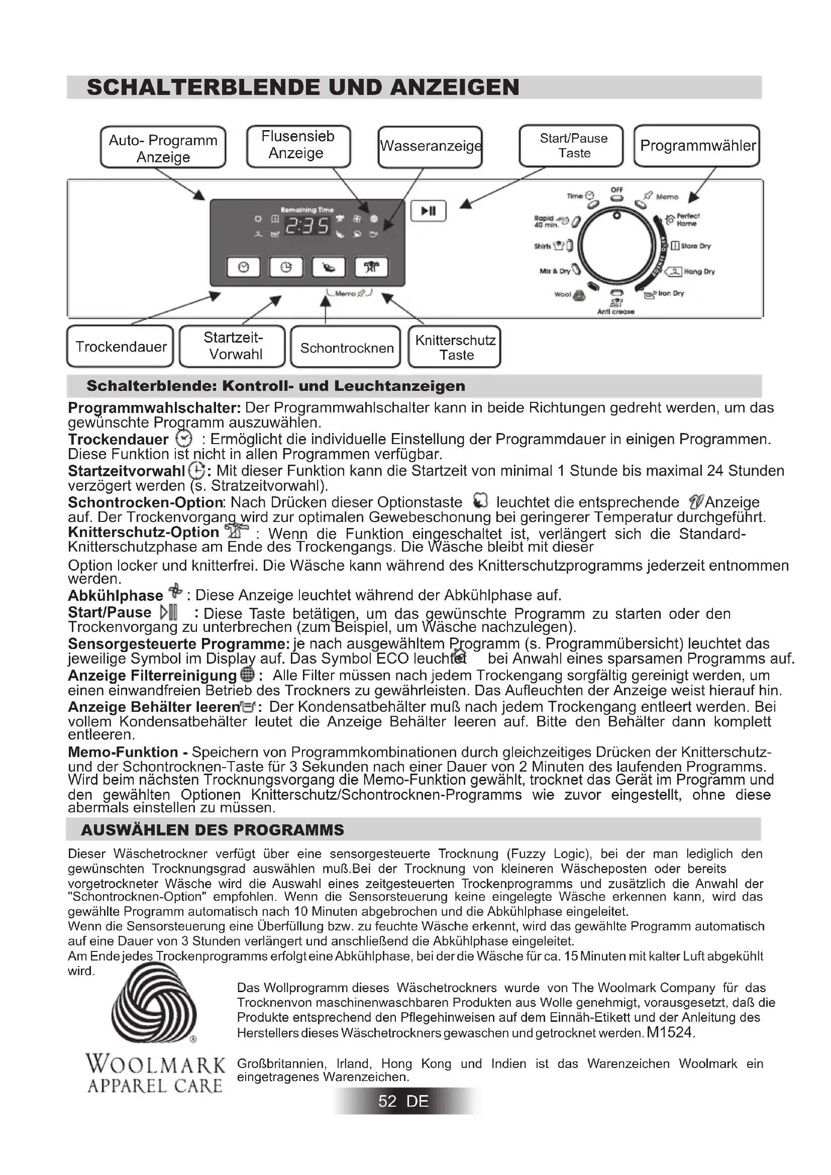 Programmwähler Wasseranzeige Flusensieb Anzeige Auto- Programm Anzeige Startzeit- Vorwahl Trockendauer Schontrocknen KnitterschutzTasteDas Wollprogramm dieses Wäschetrockners wurde von The Woolmark Company für das Trocknenvon maschinenwaschbaren Produkten aus Wolle genehmigt, vorausgesetzt, daß die Produkte entsprechend den Pflegehinweisen auf dem Einnäh-Etikett und der Anleitung des Herstellers dieses Wäschetrockners gewaschen und getrocknet werden. M1524. Großbritannien, Irland, Hong Kong und Indien ist das Warenzeichen Woolmark ein eingetragenes Warenzeichen.AUSWÄHLEN DES PROGRAMMS 53 DE Geeignet Für Auf-frischens PROGRAMM Schranktrocken Bügeltrocken Mangeltrocken Wolle Mix & Dry Kurz 40 Min Hemden Zeitprogramme Memoprogramme Wählen Sie aus diesen sensorgesteuerten Programmen den gewünschten Trockenheitsgrad. Diese reichen von Handtücher für Badehandtücher und Bademäntel, über Schranktrocken für Materialien, die nicht gebügelt werden müssen, bis hin zum Programm, die die Textilien bis zu Bügeltrocken und Mangeltrocken trocknet. Wolltextilien: dieses Programm eignet sich für die Trocknung von bis zu einem Kilogramm Wäsche (ca. 3 kleine Teile). Es wird empfohlen alle Kleidungsstücke vor dem Trocknen auf links zu ziehen.Die Trockendauer ist abhängig von der Größe und Dichte der Wäsche und der beim Waschgang a usg e w ä h l t e n S c h l e u d e r d r e h z a h l . N a c h B e e n d i g u n g d e s Trockenprogramms ist die Kleidung direkt bereit zum Tragen. Schwere/dicke Kleidungsstücke können an den Rändern noch feucht sein - in diesem Falle kurz an der Luft weitertrocknen.Es wird empfohlen die Textilien unmittelbar nach Beendigung des Trockenvorgangs aus dem Gerät zu entnehmen.ACHTUNG: Das Einlaufen und Verfilzen von Wolltextilien kann nicht wieder rückgängig gemacht werden. Bitte ausschließlich Textilien mit dem entsprechenden Zeichen auf dem Wäschetikett im Wäschetrockner trocknen. Dieses Programm eignet sich nicht für Kleidungsstücke mit Acryl- /Kunstfaseranteilen im Gewebe. Dieses spezielle Programm ist für eine maximale Füllmenge von bis zu 4 kg geeignet und dauert 117 Minuten. Die verkürzte Programmdauer nimmt 99 Minuten in Anspruch und ermöglicht eine Füllmenge von bis zu 3 kg. Mit diesem Programm können sowohl Baumwolle als auch Kunstfasern zusammen getrocknet werden. Dieses spezielle Programm ist für eine Füllmenge von bis zu 3 kg geeignet und dauert 78 Minuten. Für Synthetik-Hemden drücken Sie bitte die Schontrocknen- Taste. Die verkürzte Programmdauer nimmt 60 Minuten in Anspruch und erlaubt eine Füllmenge von bis zu 2 kg. Die Zeitprogramme inkludieren alle manuellen Programme: von 30 bis 180 Minuten. Die Zeiteinstellung von 20 Minuten bewirkt lediglich eine Kaltlufttrocknung. Das Memo-Programm ermöglicht eine Voreinstellung eines Programms, das der Nutzer zuvor gespeichert hat. Hierbei ist die korrekte Programmwahl und Wahl von Zusatzoptionen nicht mehr notwendig. Das Programm bietet eine Auflockerungs- und Knitterschutz- Funktion. Der Trockner erhitzt die Trockenwäsche für 9 Minuten, gefolgt von einer 3-minütigen Abkühlungsphase, und ist speziell für Stoffe geeignet, die einige Zeit liegen, bevor sie getrocknet werden. Stoffe, die draußen auf einer Wäscheleine trocknen, können leicht steif werden. Dieses Programm lockert die Stoffe auf, so dass das Bügeln einfacher und schneller wird. Das