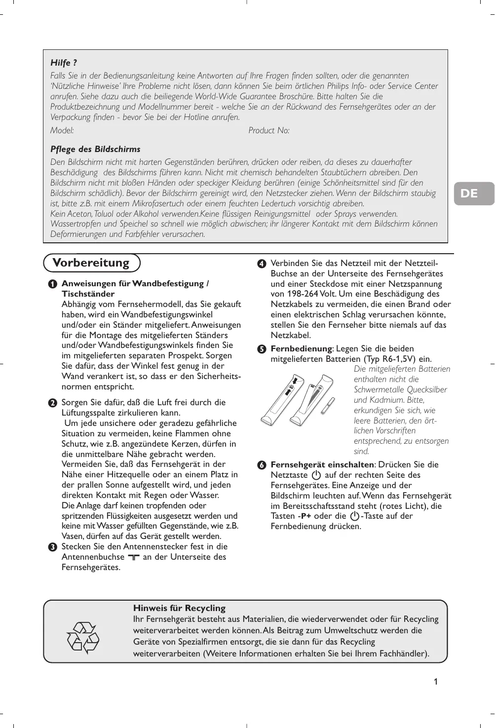 Hilfe ? Falls Sie in der Bedienungsanleitung keine Antworten auf Ihre Fragen finden sollten, oder die genannten ‘Nützliche Hinweise’ Ihre Probleme nicht lösen, dann können Sie beim örtlichen Philips Info- oder Service Center anrufen. Siehe dazu auch die beiliegende World-Wide Guarantee Broschüre. Bitte halten Sie die Produktbezeichnung und Modellnummer bereit - welche Sie an der Rückwand des Fernsehgerätes oder an der Verpackung finden - bevor Sie bei der Hotline anrufen. Model: Product No: Pflege des Bildschirms Den Bildschirm nicht mit harten Gegenständen berühren, drücken oder reiben, da dieses zu dauerhafter Beschädigung des Bildschirms führen kann. Nicht mit chemisch behandelten Staubtüchern abreiben. Den Bildschirm nicht mit bloßen Händen oder speckiger Kleidung berühren (einige Schönheitsmittel sind für den Bildschirm schädlich). Bevor der Bildschirm gereinigt wird, den Netzstecker ziehen. Wenn der Bildschirm staubig ist, bitte z.B. mit einem Mikrofasertuch oder einem feuchten Ledertuch vorsichtig abreiben. Kein Aceton, Toluol oder Alkohol verwenden.Keine flüssigen Reinigungsmittel oder Sprays verwenden. Wassertropfen und Speichel so schnell wie möglich abwischen; ihr längerer Kontakt mit dem Bildschirm können Deformierungen und Farbfehler verursachen. Vorbereitung ‘ Verbinden Sie das Netzteil mit der Netzteil- & Anweisungen für Wandbefestigung / Tischständer Abhängig vom Fernsehermodell, das Sie gekauft haben, wird ein Wandbefestigungswinkel und/oder ein Ständer mitgeliefert. Anweisungen für die Montage des mitgelieferten Ständers und/oder Wandbefestigungswinkels finden Sie im mitgelieferten separaten Prospekt. Sorgen Sie dafür, dass der Winkel fest genug in der Wand verankert ist, so dass er den Sicherheitsnormen entspricht. é Sorgen Sie dafür, daß die Luft frei durch die Lüftungsspalte zirkulieren kann. Um jede unsichere oder geradezu gefährliche Situation zu vermeiden, keine Flammen ohne Schutz, wie z.B. angezündete Kerzen, dürfen in die unmittelbare Nähe gebracht werden. Vermeiden Sie, daß das Fernsehgerät in der Nähe einer Hitzequelle oder an einem Platz in der prallen Sonne aufgestellt wird, und jeden direkten Kontakt mit Regen oder Wasser. Die Anlage darf keinen tropfenden oder spritzenden Flüssigkeiten ausgesetzt werden und keine mit Wasser gefüllten Gegenstände, wie z.B. Vasen, dürfen auf das Gerät gestellt werden. “ Stecken Sie den Antennenstecker fest in die Antennenbuchse x an der Unterseite des Fernsehgerätes.