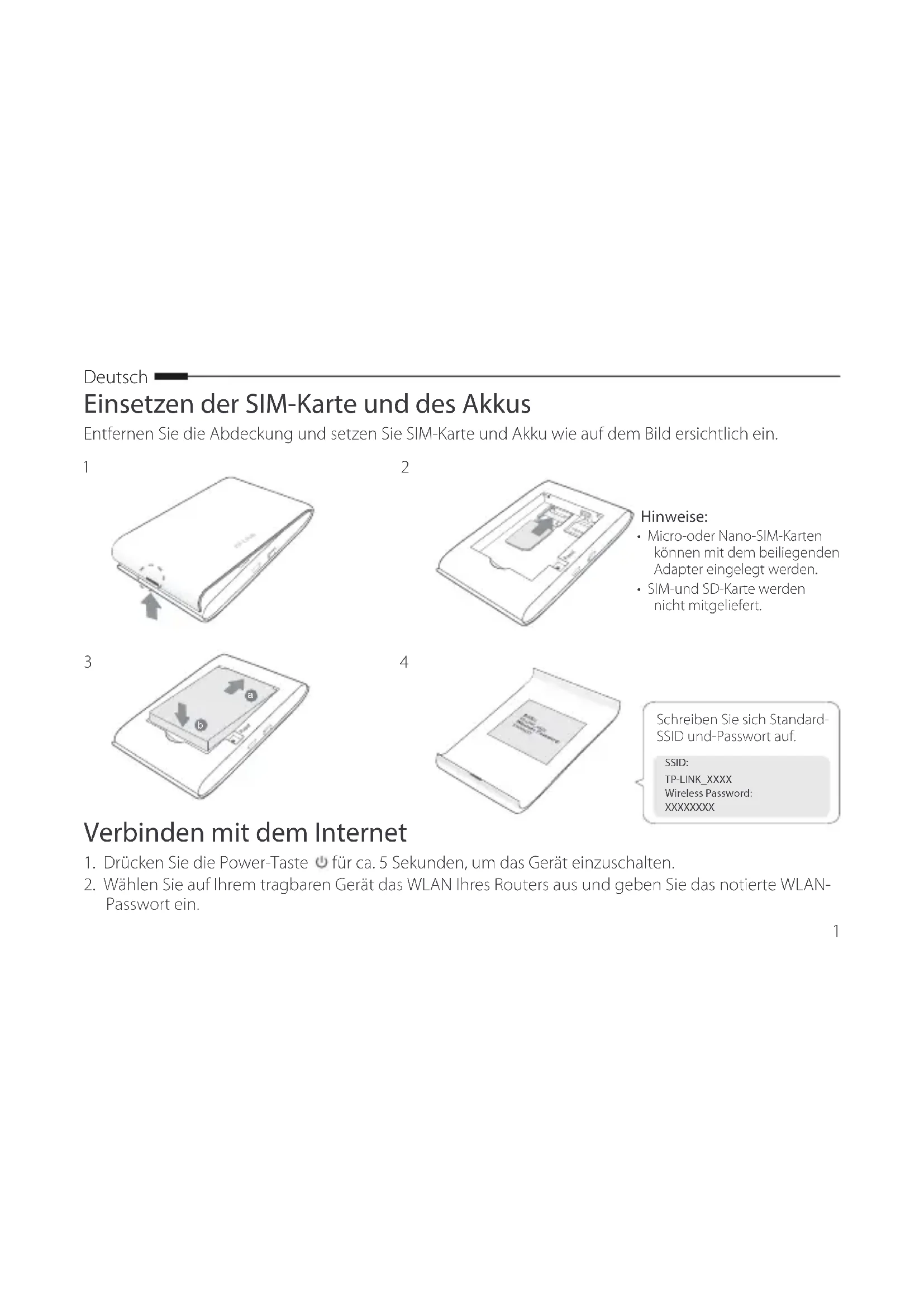 - SIM-und SD-Karte werden nicht mitgeliefert. SSID:TP-LINK_XXXXWireless Password:XXXXXXXX2 Deutsch Hinweis: Wir empfehlen Ihnen, den Namen und das Passwort Ihres WLANs zu ändern, um die Sicherheit zu erhöhen. Fertig! Hinweis:
