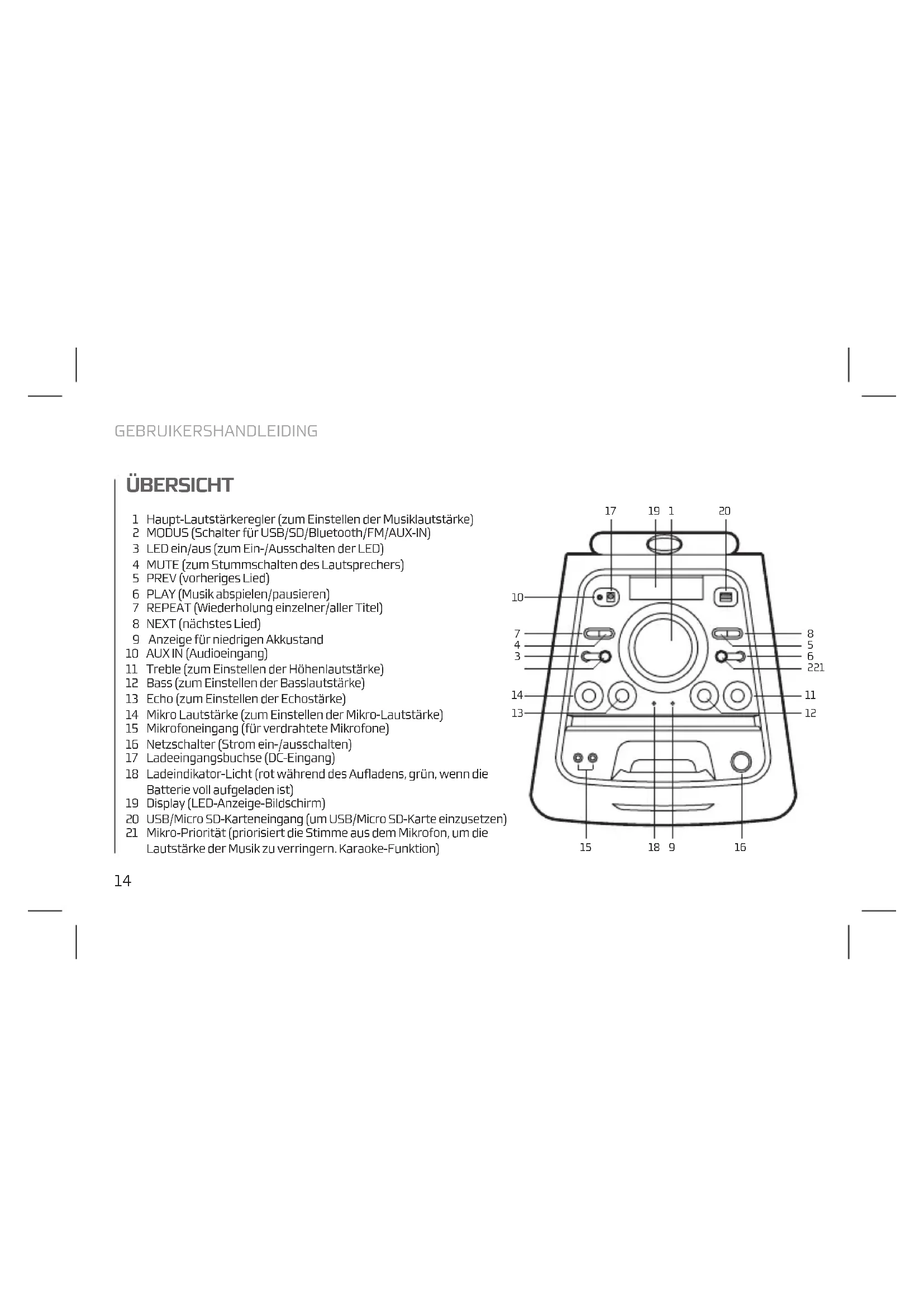 ÜBERSICHT Haupt-Lautstärkeregler (zum Einstellen der Musiklautstärke) MODUS (Schalter für USB/SD/Bluetooth/FM/AUX-IN) LED ein/aus (zum Ein-/Ausschalten der LED) MUTE (zum Stummschalten des Lautsprechers) PREV (vorheriges Lied) PLAY (Musik abspielen/pausieren) REPEAT (Wiederholung einzelner/aller Titel) NEXT (nächstes Lied) Anzeige für niedrigen Akkustand AUX IN (Audioeingang) Treble (zum Einstellen der Höhenlautstärke) Bass (zum Einstellen der Basslautstärke) Echo (zum Einstellen der Echostärke) Mikro Lautstärke (zum Einstellen der Mikro-Lautstärke) Mikrofoneingang (für verdrahtete Mikrofone) Netzschalter (Strom ein-/ausschalten) Ladeeingangsbuchse (DC-Eingang) Ladeindikator-Licht (rot während des Aufladens, grün, wenn die Batterie voll aufgeladen ist) Display (LED-Anzeige-Bildschirm) USB/Micro SD-Karteneingang (um USB/Micro SD-Karte einzusetzen) Mikro-Priorität (priorisiert die Stimme aus dem Mikrofon, um die Lautstärke der Musik zu verringern. Karaoke-Funktion)