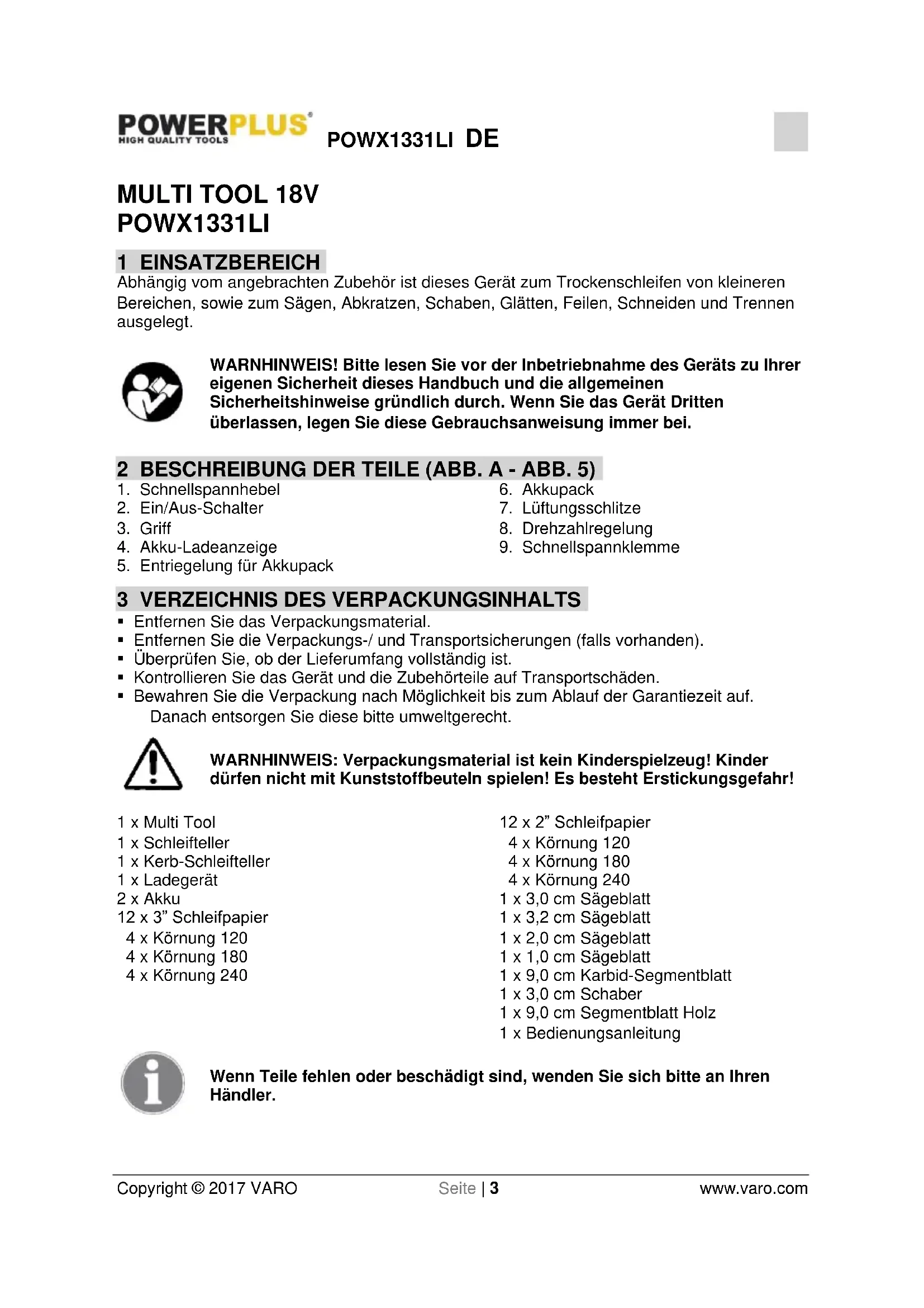 12 x 2” Schleifpapier 4 x Körnung 120 4 x Körnung 180 4 x Körnung 240 1 x 3,0 cm Sägeblatt 1 x 3,2 cm Sägeblatt 1 x 2,0 cm Sägeblatt 1 x 1,0 cm Sägeblatt 1 x 9,0 cm Karbid-Segmentblatt 1 x 3,0 cm Schaber 1 x 9,0 cm Segmentblatt Holz 1 x Bedienungsanleitung Wenn Teile fehlen oder beschädigt sind, wenden Sie sich bitte an Ihren Händler.POWX1331LI DE Copyright © 2017 VARO Seite | 4 www.varo.com