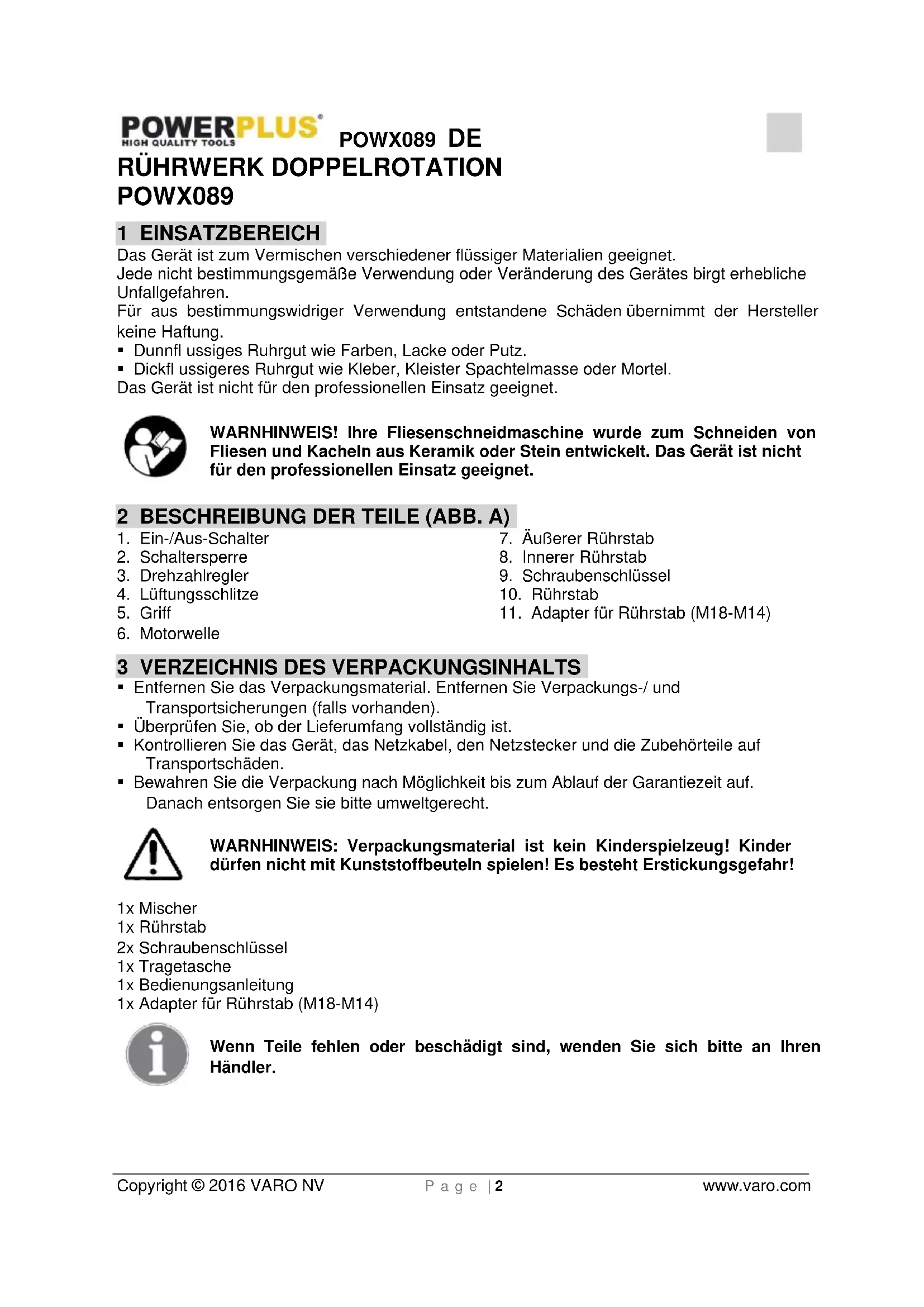 Hiermit erklären wir, VARO N.V., Joseph Van Instraat 9, B-2500 Lier, Belgien, dass das nachfolgend bezeichnete Gerät Bezeichnung des Geräts : Rührwerk Marke : POWERplus Modell-Nr.: POWX089 den grundlegenden Anforderungen und anderen einschlägigen Bestimmungen der entsprechenden EU-Richtlinien auf der Grundlage der harmonisierten EU-Normen entspricht. Bei einer nicht mit uns abgestimmten Änderung des Geräts verliert diese Erklärung ihre Gültigkeit. EU-Richtlinien (einschließlich ihrer etwaigen Änderungen, bis zum Datum der Unterschrift): 2014/30/EU 2006/42/EC 2011/65/EU Harmonisierte EU-Normen (einschließlich ihrer etwaigen Änderungen, bis zum Datum der Unterschrift): EN60745-1 : 2009 EN55014-1 : 2006 EN55014-2 : 1997 EN61000-3-2 : 2014 EN61000-3-3 : 2013 Halter der Technischen Dokumentation: Philippe Vankerkhove, VARO – Vic. Van Rompuy N.V. Der Unterzeichner handelt im Namen der Geschäftsführung des Unternehmens, Hugo Cuypers Zulassungsabteilung – Compliance Manager Datum: 01/12/2016POWX089 ES Copyright © 2016 VARO NV P a g e | 1 www.varo.com 1 APLICACIÓN .................................................................................... 2