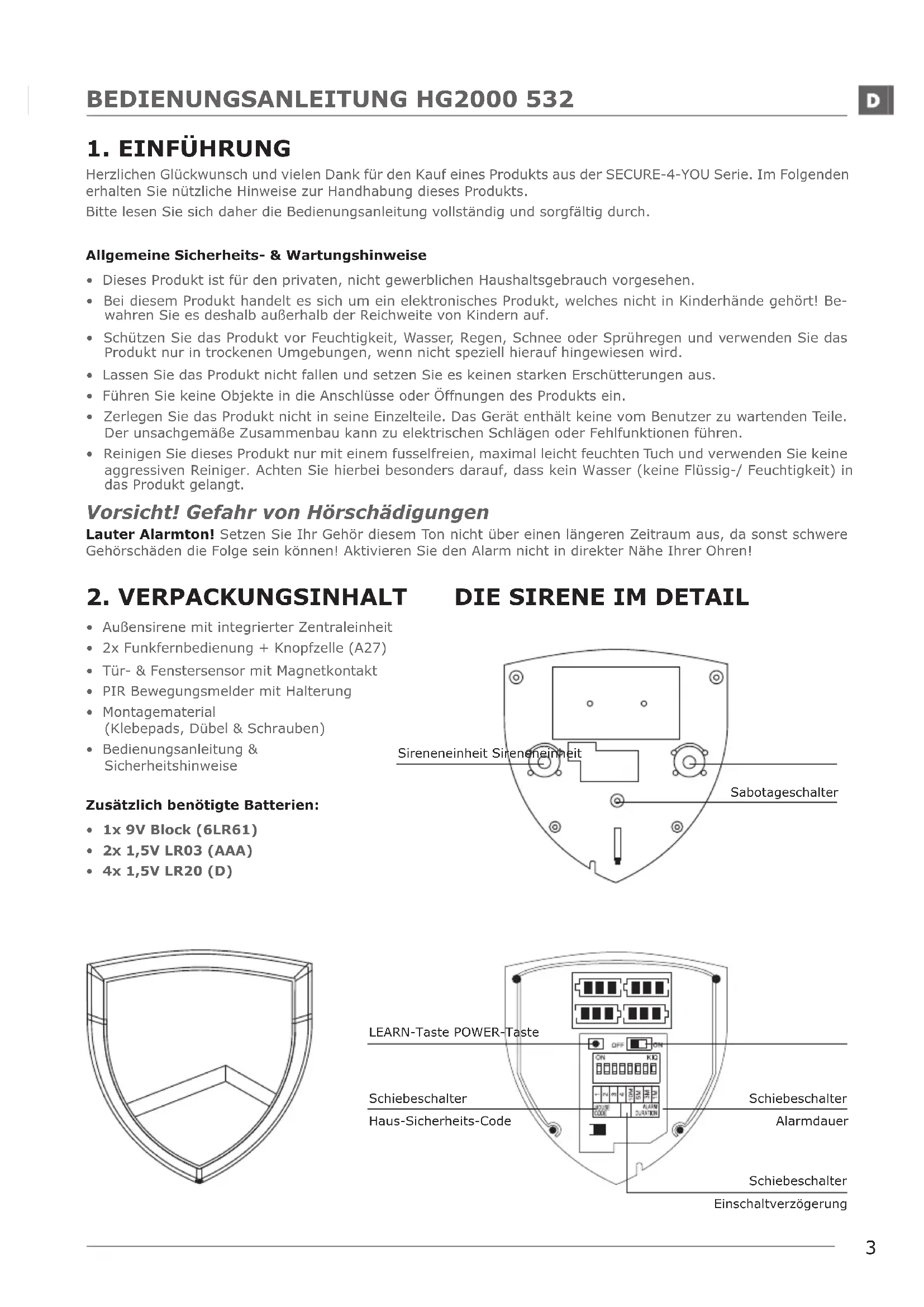 - 4x 1,5V LR20 (D) Sireneneinheit Sireneneinheit Sabotageschalter LEARN-Taste POWER-Taste Schiebeschalter Alarmdauer Schiebeschalter Haus-Sicherheits-Code Schiebeschalter Einschaltverzögerung4 BEDIENUNGSANLEITUNG HG2000 532
