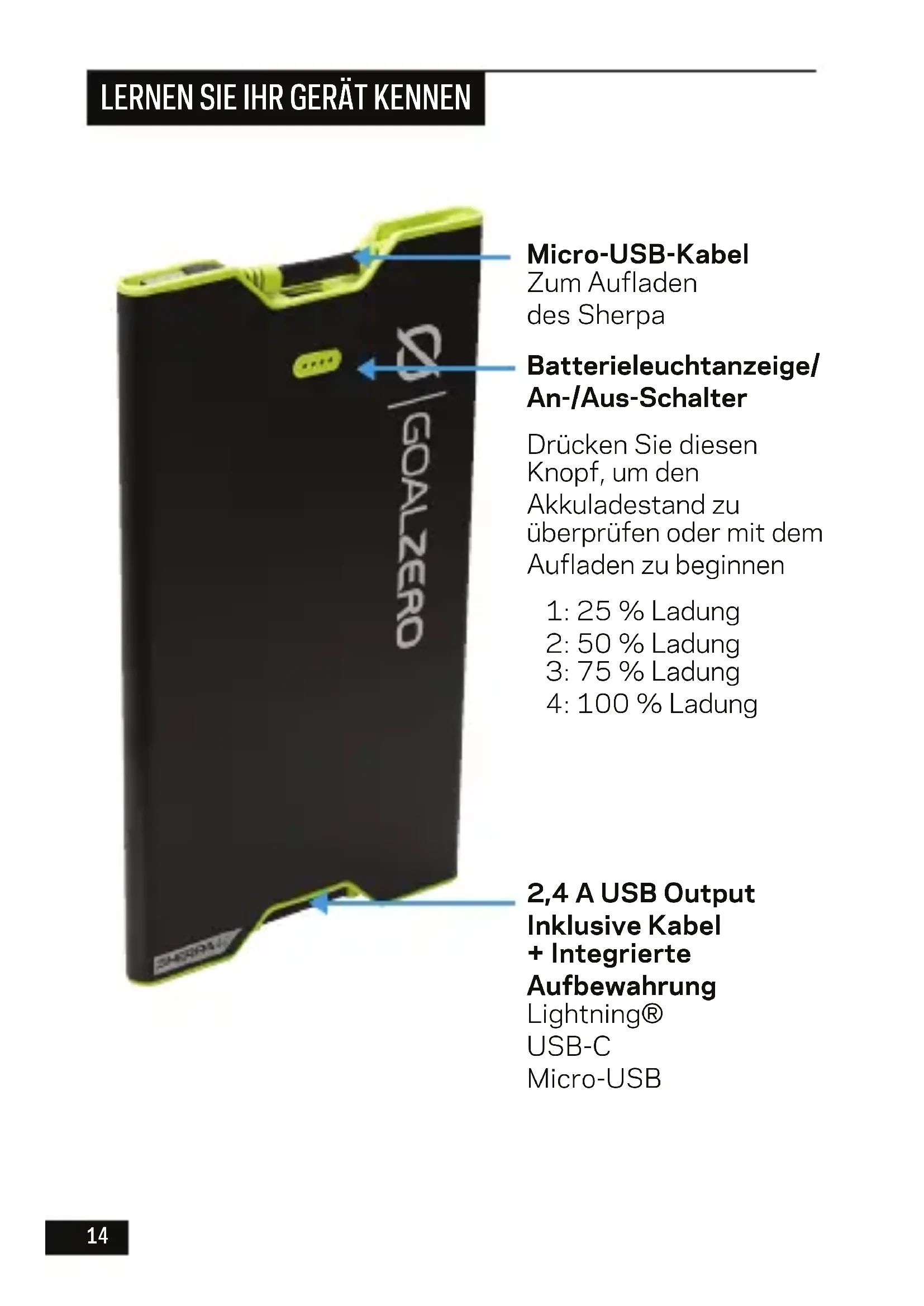 2,4 A USB Output Inklusive Kabel + Integrierte Aufbewahrung Lightning® USB-C Micro-USB Batterieleuchtanzeige/ An-/Aus-Schalter Drücken Sie diesen Knopf, um den Akkuladestand zu überprüfen oder mit dem Aufladen zu beginnen 1: 25 % Ladung 2: 50 % Ladung 3: 75 % Ladung 4: 100 % Ladung Micro-USB-Kabel Zum Aufladen desSherpa14 15