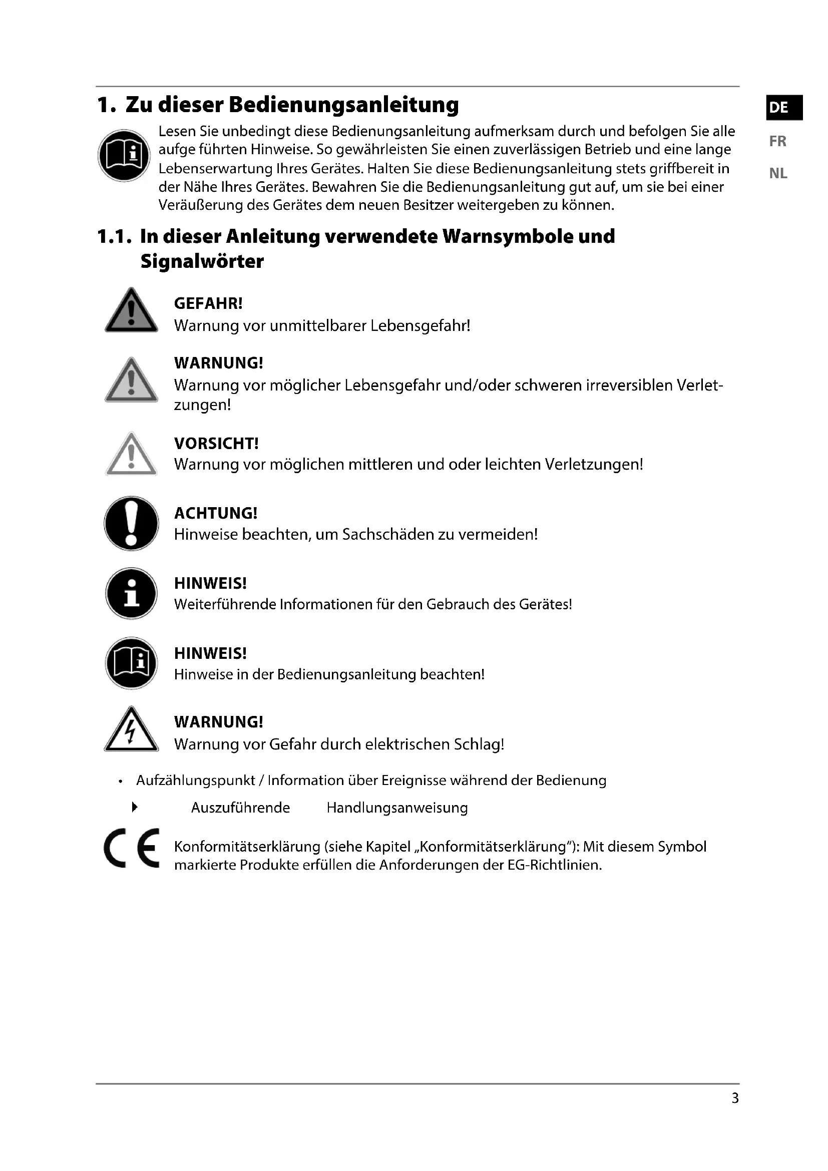 Lesen Sie unbedingt diese Bedienungsanleitung aufmerksam durch und befolgen Sie alle aufge führten Hinweise. So gewährleisten Sie einen zuverlässigen Betrieb und eine lange Lebenserwartung Ihres Gerätes. Halten Sie diese Bedienungsanleitung stets griffbereit in der Nähe Ihres Gerätes. Bewahren Sie die Bedienungsanleitung gut auf, um sie bei einer Veräußerung des Gerätes dem neuen Besitzer weitergeben zu können. 1.1. In dieser Anleitung verwendete Warnsymbole und Signalwörter GEFAHR! Warnung vor unmittelbarer Lebensgefahr! WARNUNG! Warnung vor möglicher Lebensgefahr und/oder schweren irreversiblen Verlet- zungen! VORSICHT! Warnung vor möglichen mittleren und oder leichten Verletzungen! ACHTUNG! Hinweise beachten, um Sachschäden zu vermeiden! HINWEIS! Weiterführende Informationen für den Gebrauch des Gerätes! HINWEIS! Hinweise in der Bedienungsanleitung beachten! WARNUNG! Warnung vor Gefahr durch elektrischen Schlag!